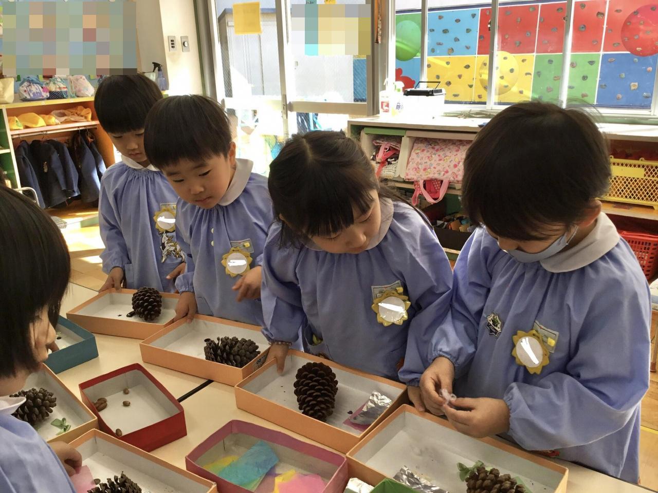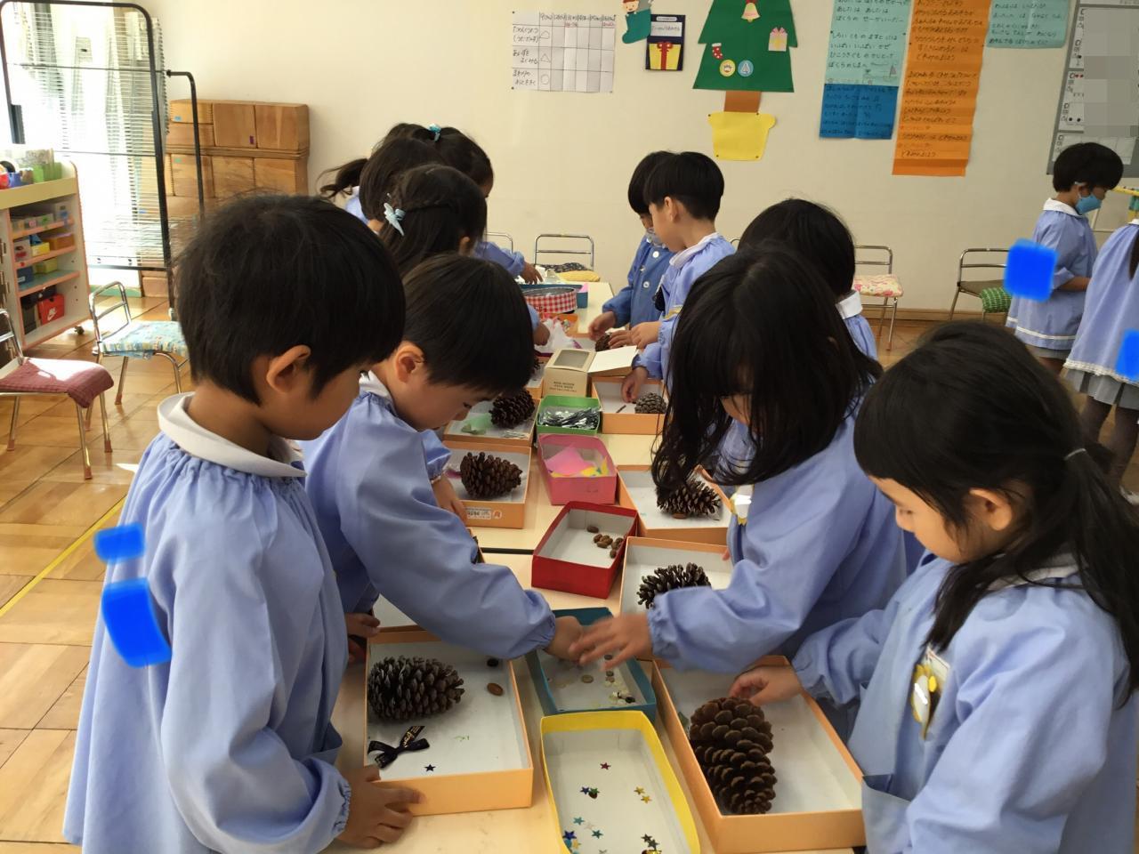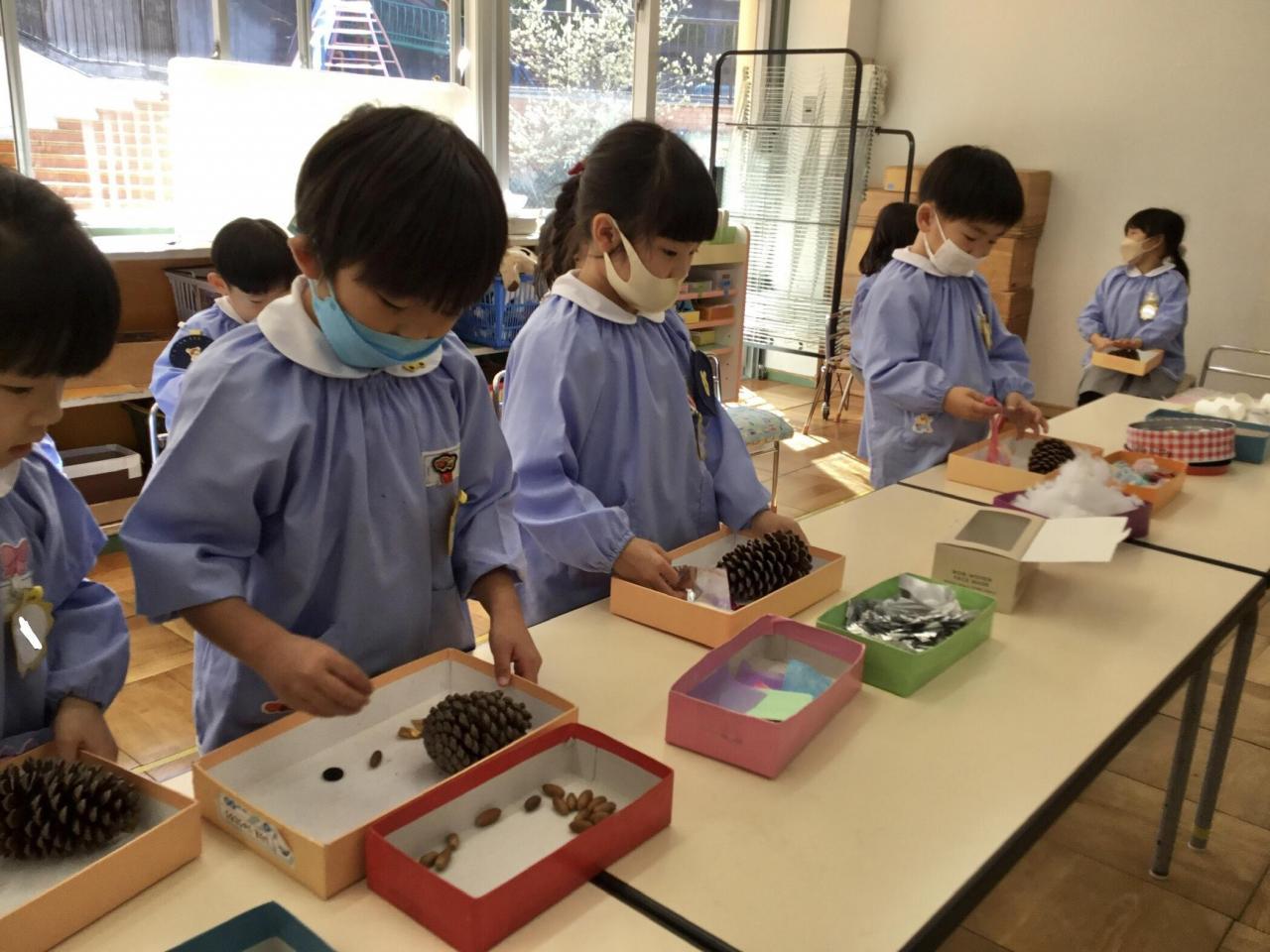 まずは、材料集め!お花紙・どんぐり・枝・綿・スパンコールなど様々な材料の中から自分が飾りたいと思うものを集めていきます。1度に沢山とる子もいれば、少しずつとる子もいました。