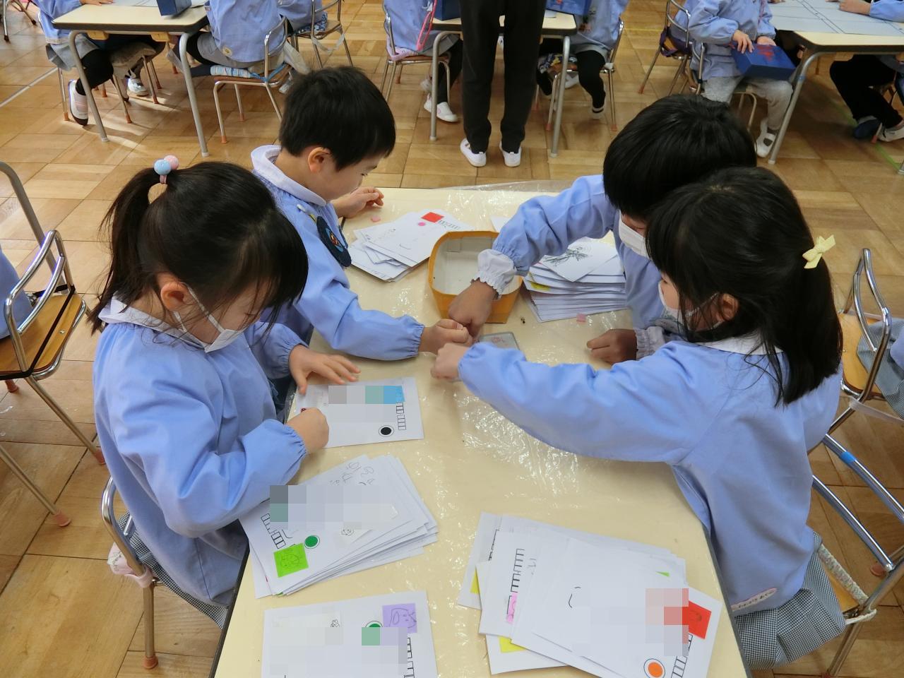 友だちと協力して、ハガキを分けて郵便マンのかばんに入れています。