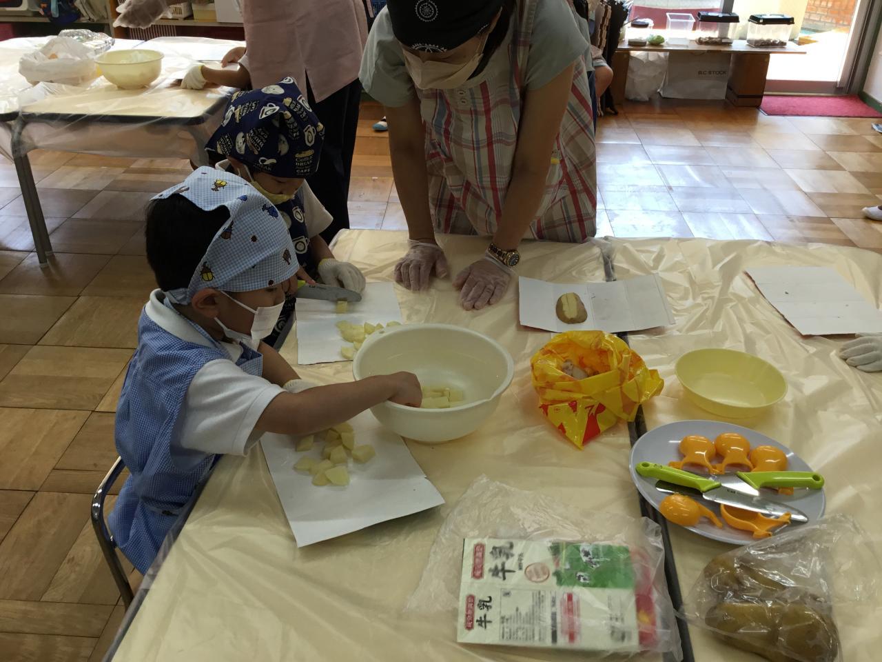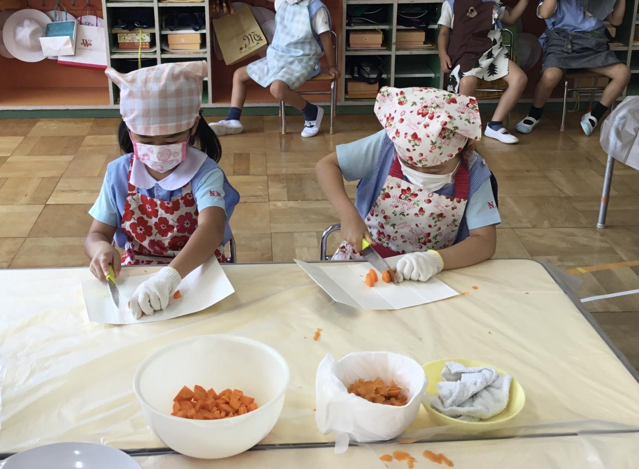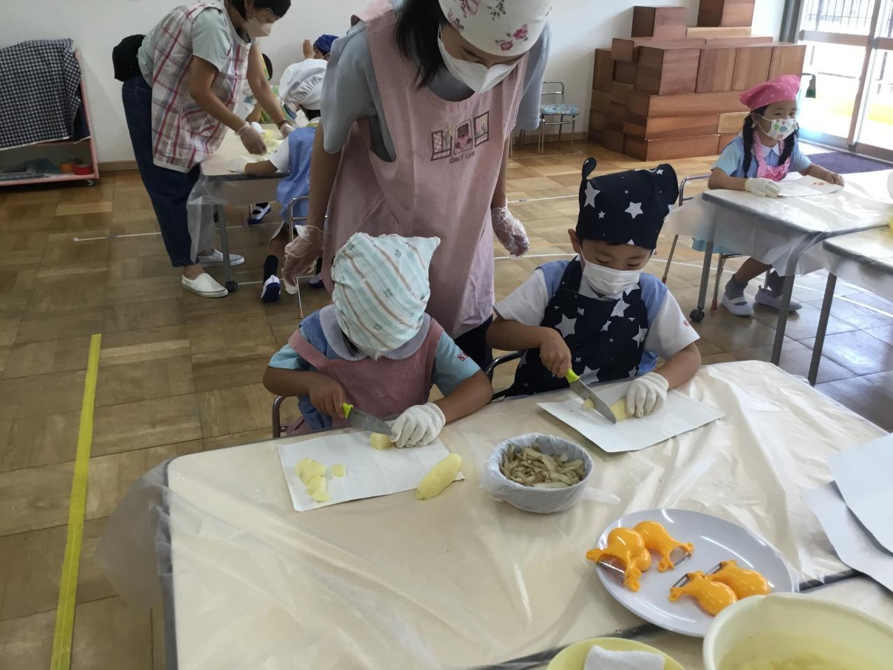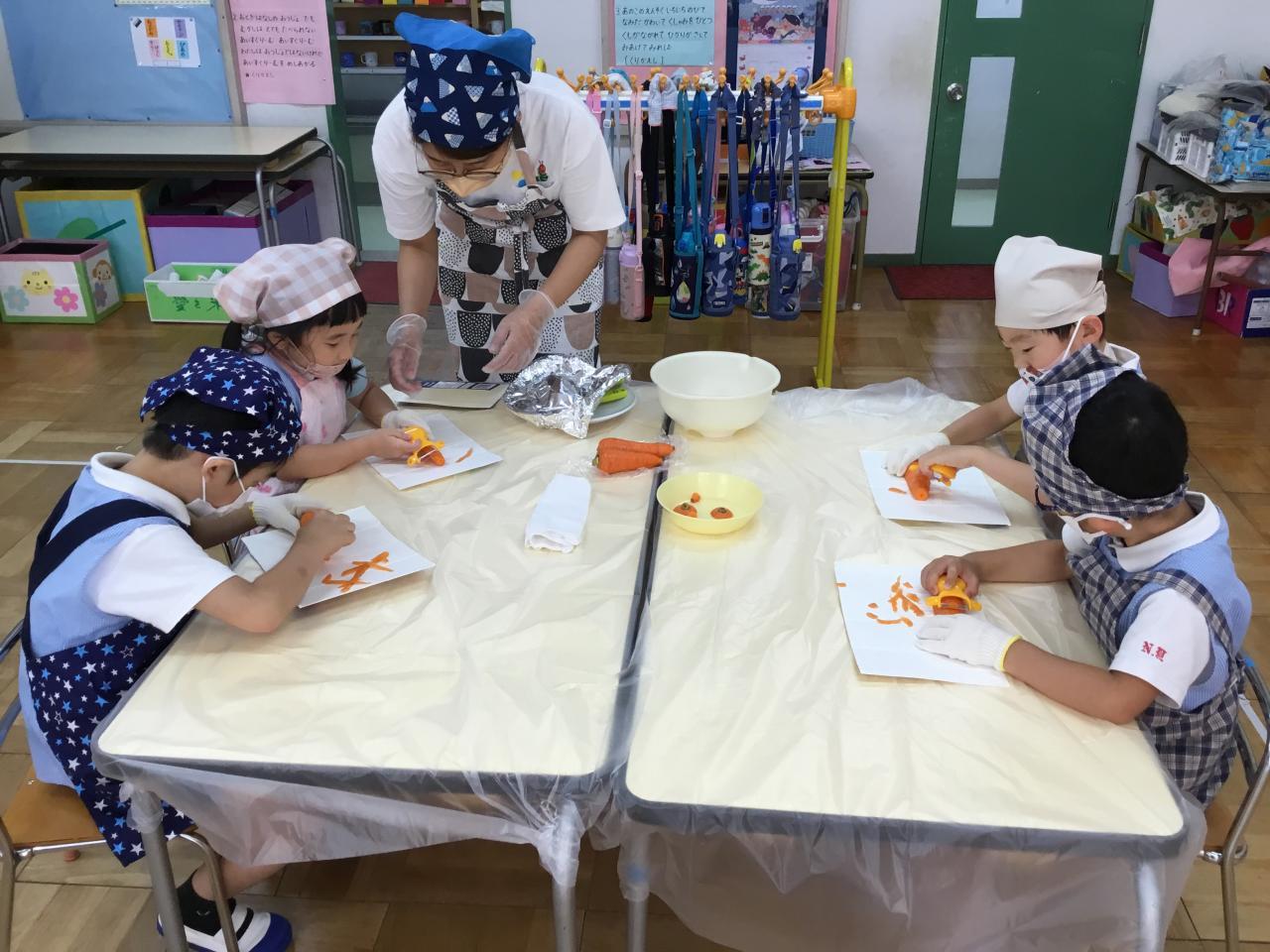 年長さんは野菜の形をじっくり観察したり、ピーラーや包丁の約束を守って、真剣に扱うこともできました。お家の方が準備してくださったエプロン姿もステキでした。
