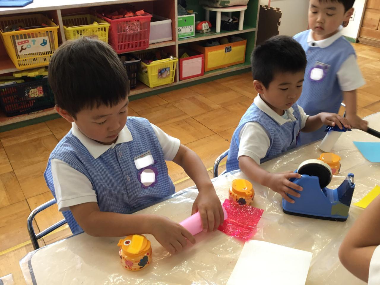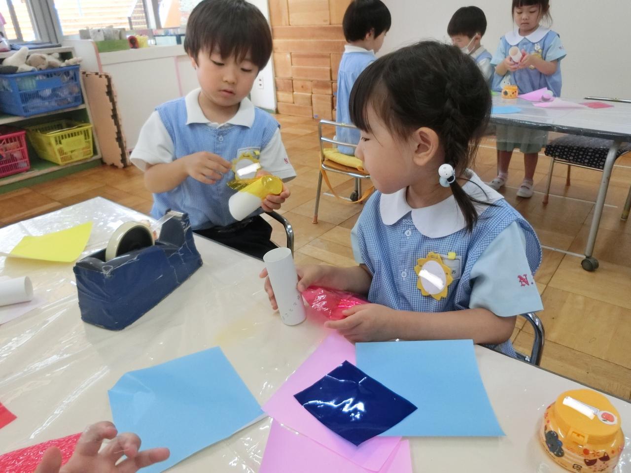 いろんな色の世界が楽しめるようにカラーセロファンを貼りました。