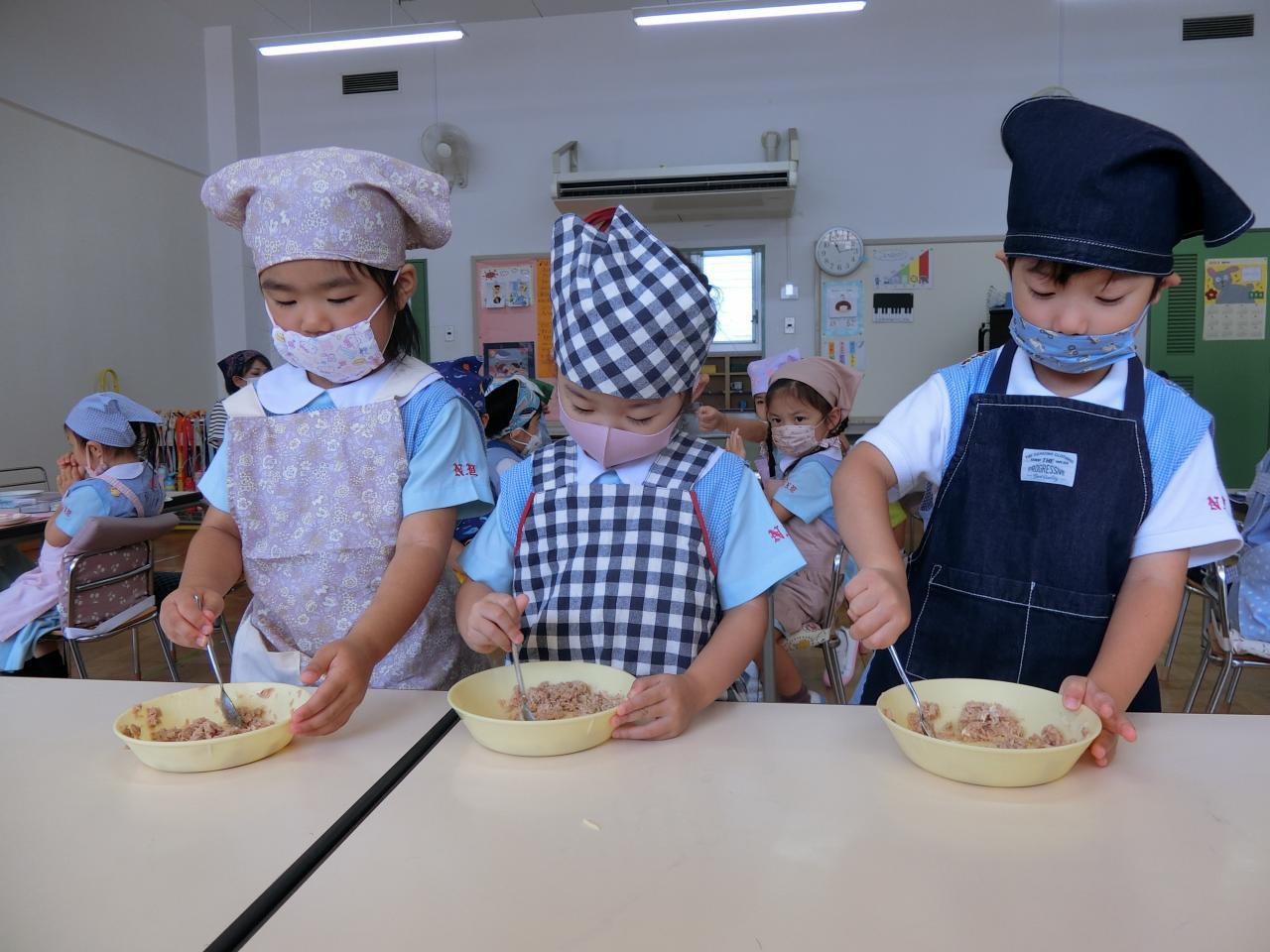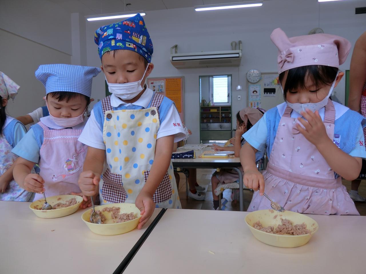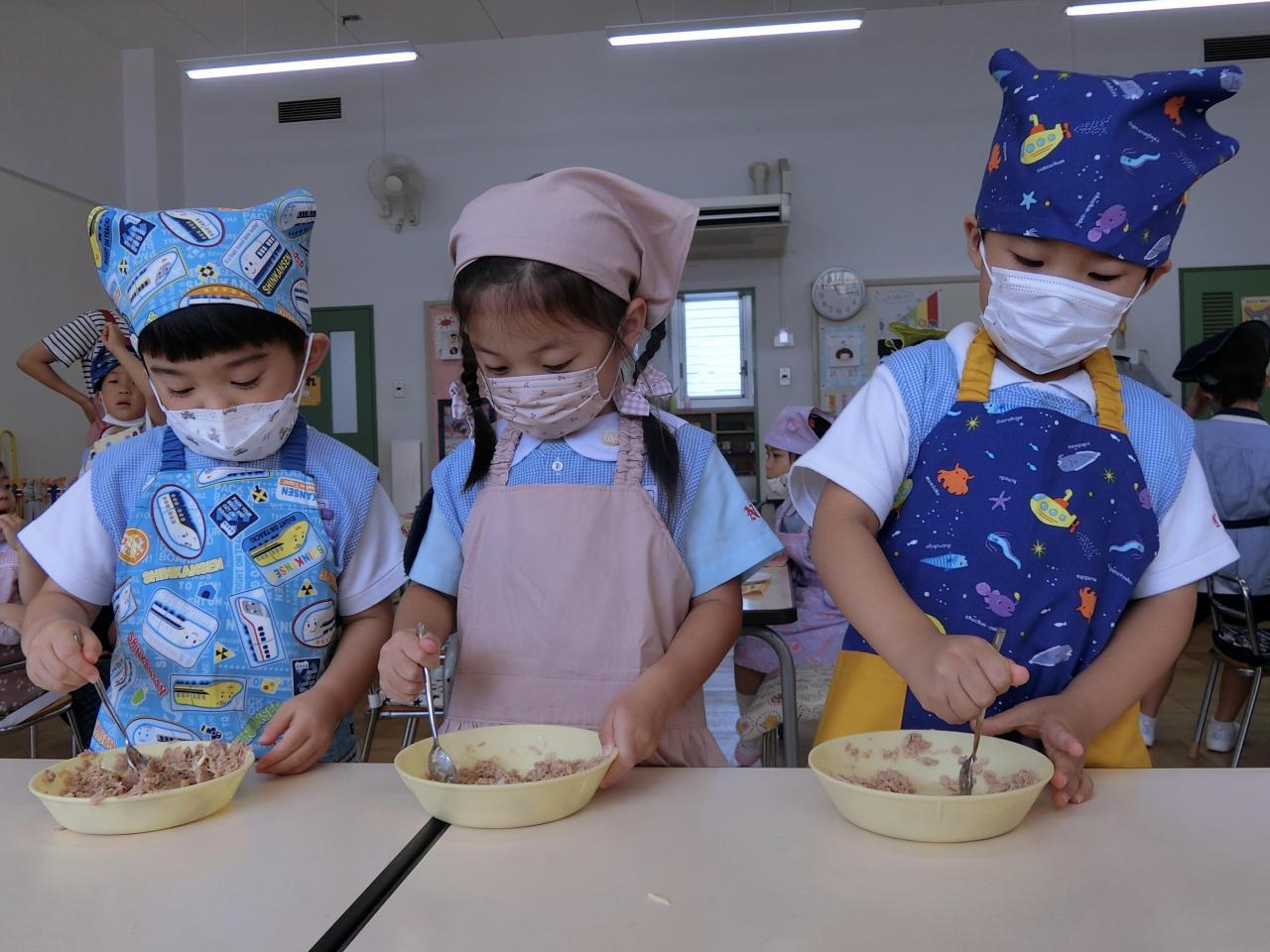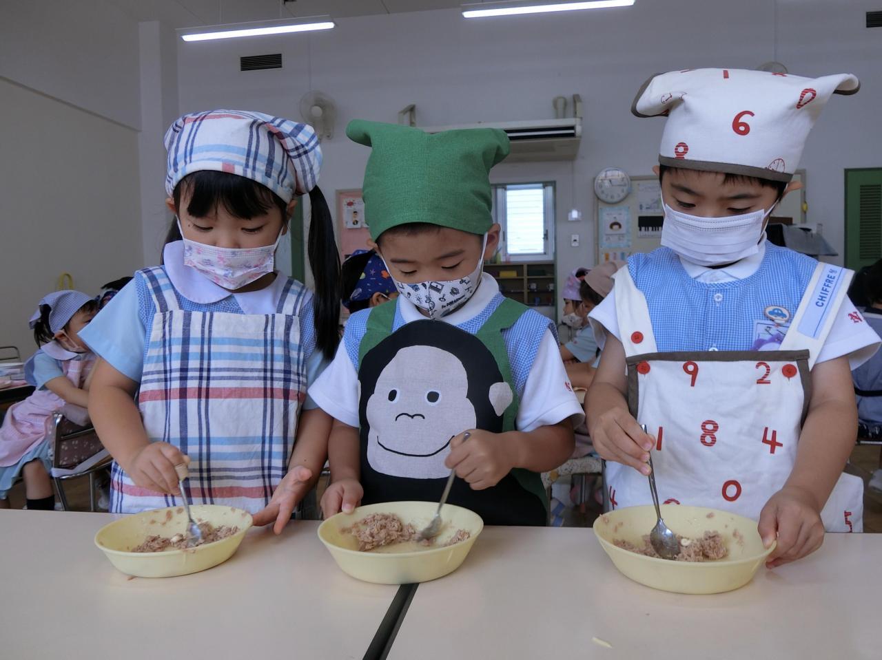 ツナ缶とマヨネーズをスプーンで混ぜます!