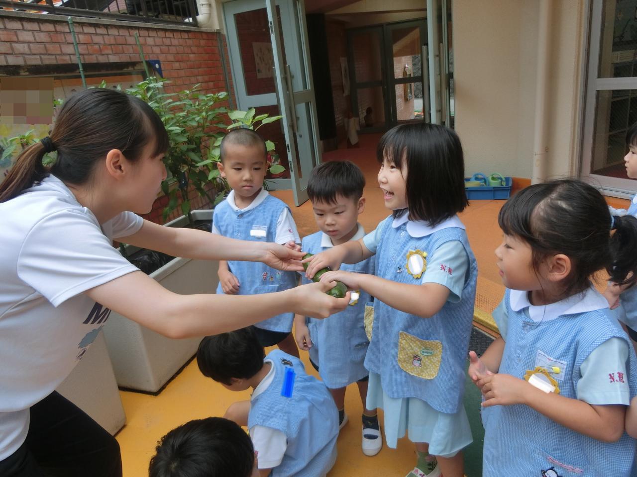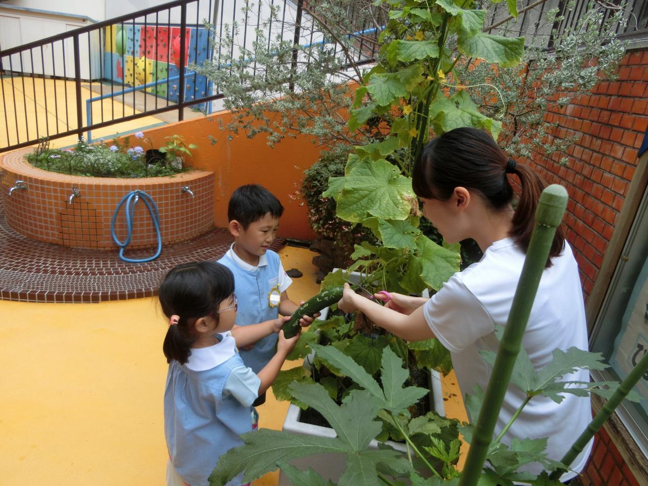 年中組のプランターに、大きなきゅうりができました♡