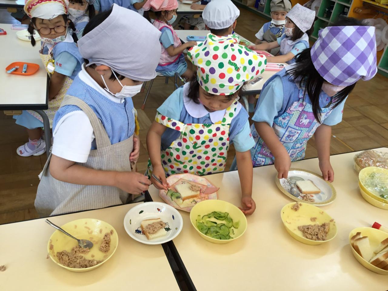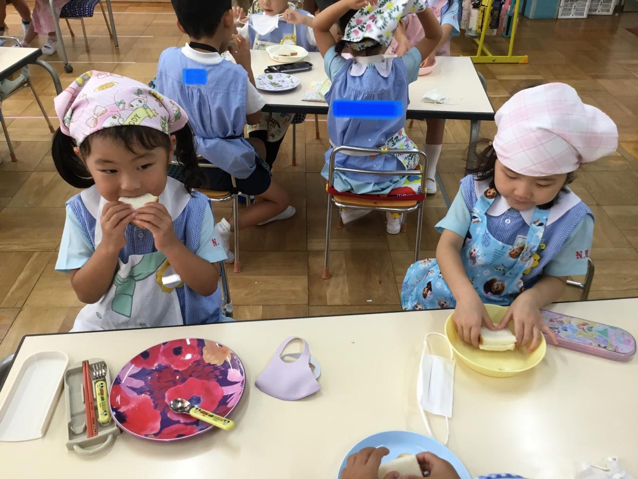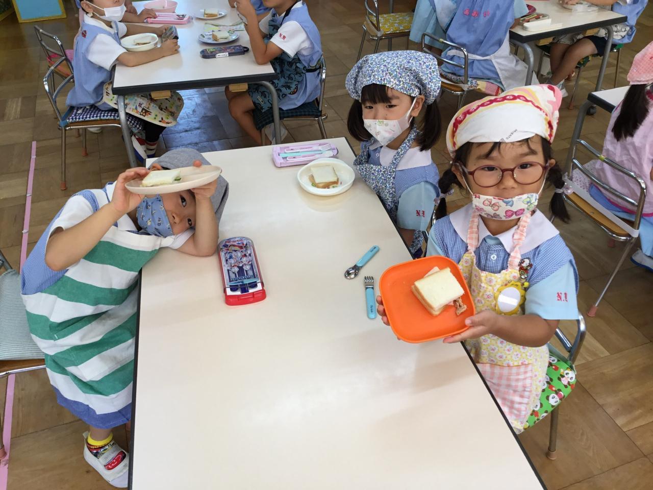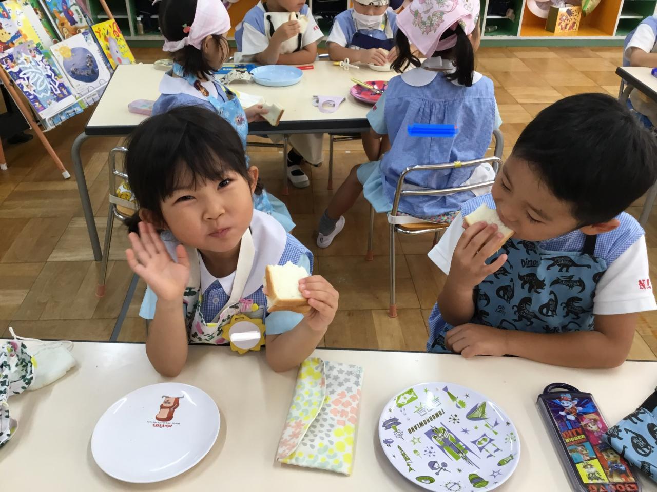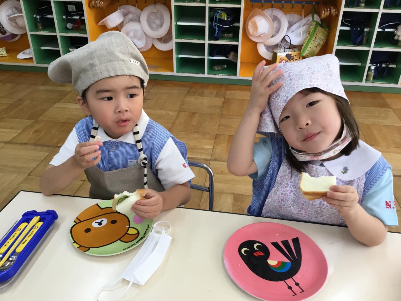 「おいしいね♡」と自分で作ったサンドイッチを嬉しそうに食べる子どもたち。「まだまだ食べたい!」と食欲もりもりのたんぽぽ組でした♪みんなで楽しい思い出ができてよかったね(^ ^)