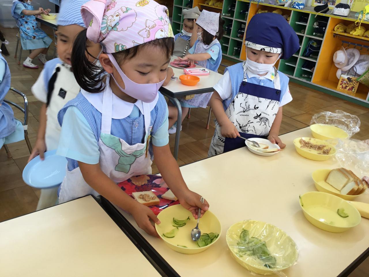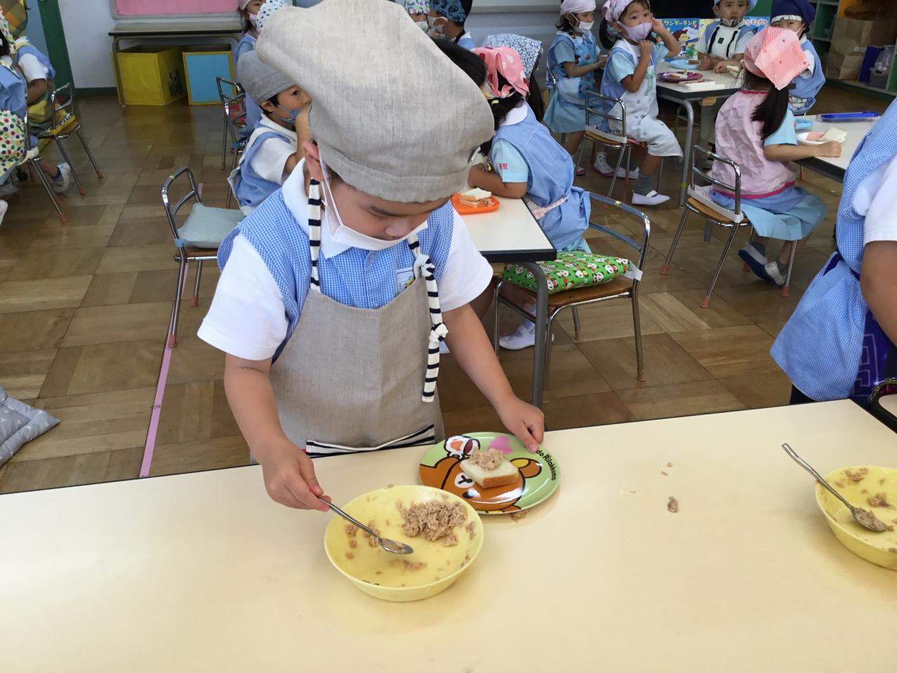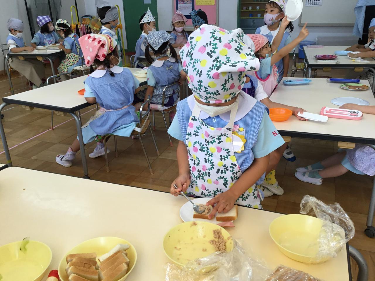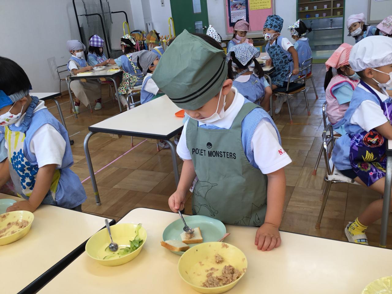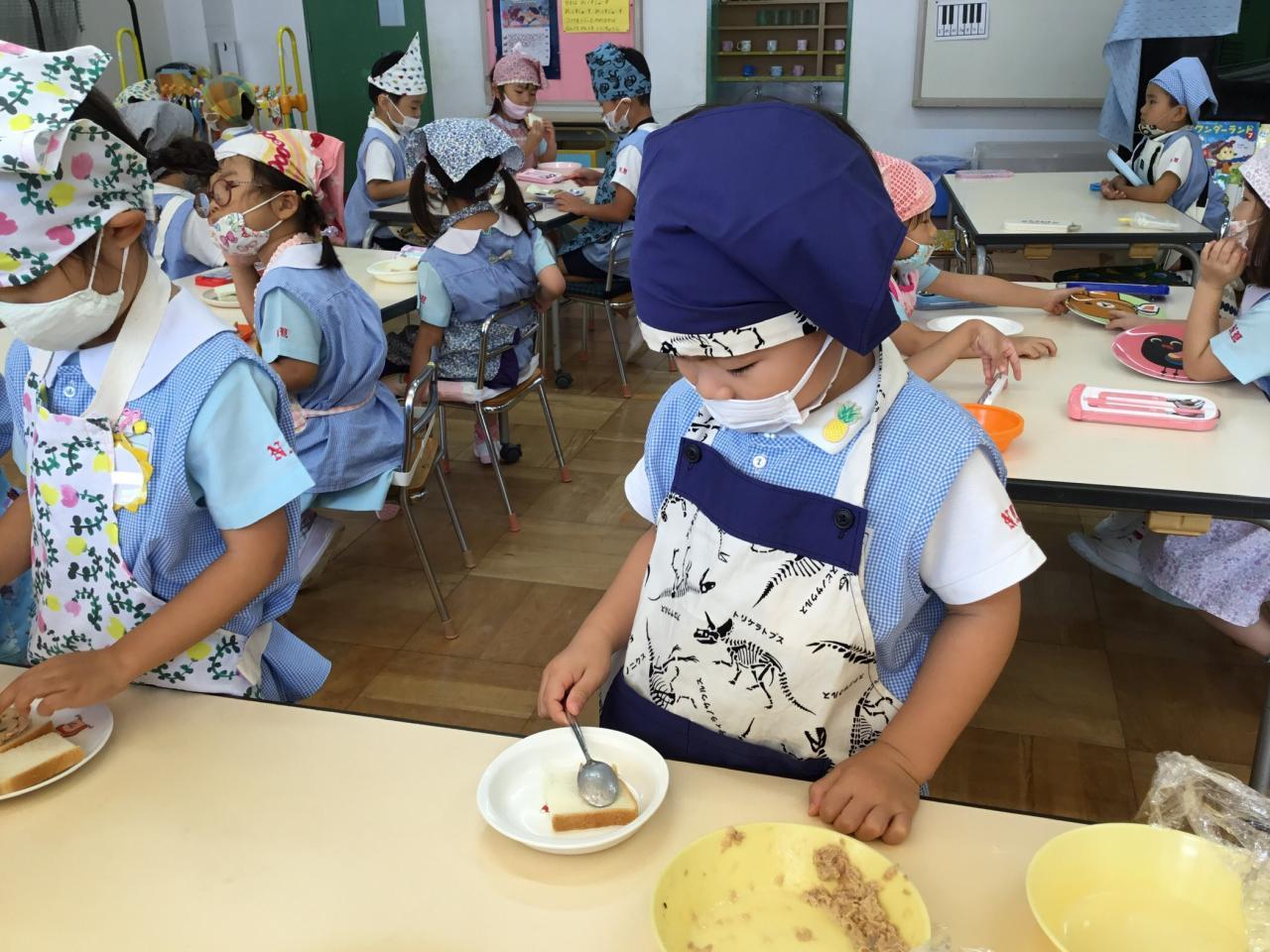 「おいしいね♡」と自分で作ったサンドイッチを嬉しそうに食べる子どもたち。「まだまだ食べたい!」と食欲もりもりのたんぽぽ組でした♪みんなで楽しい思い出ができてよかったね(^ ^)