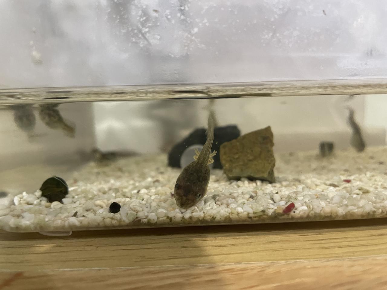 クラスで育てていたオタマジャクシも元気に過ごしています。小さな足が生えてきました!