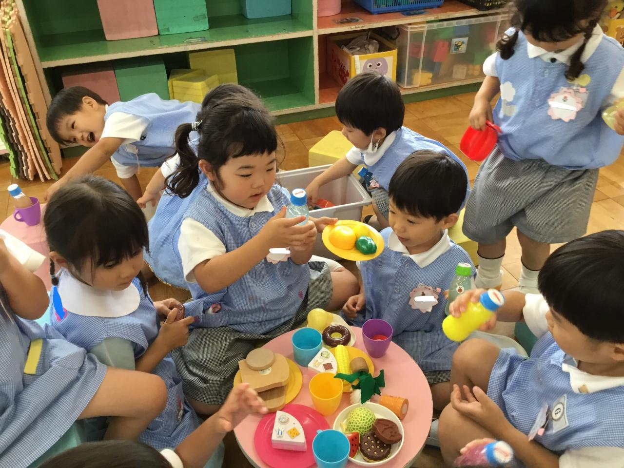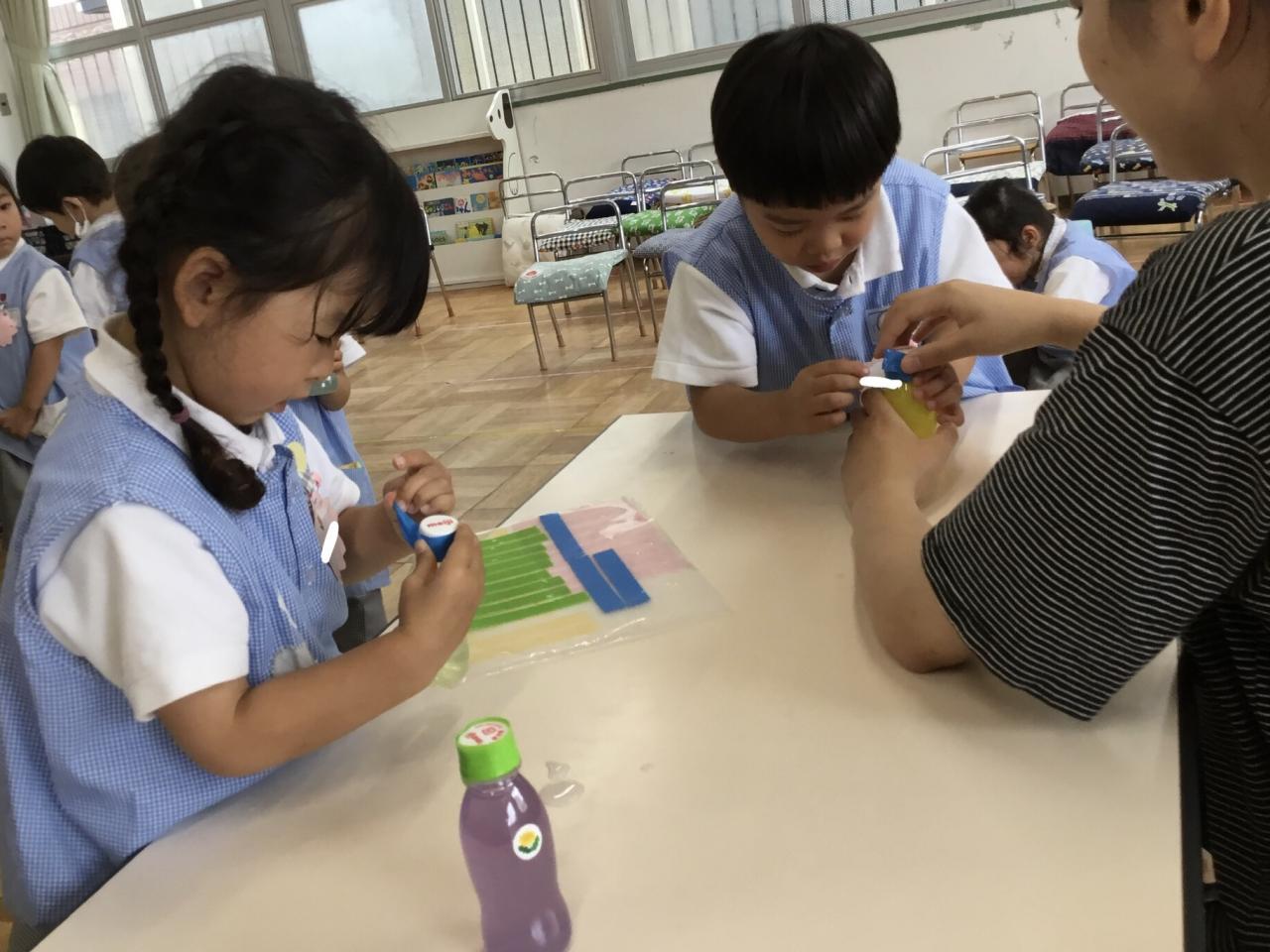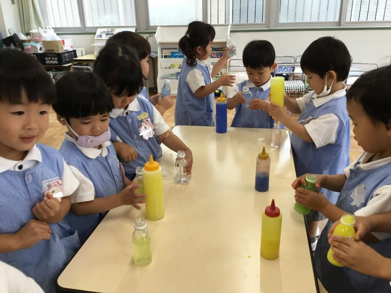 まずは、色水遊び!好きな色のジュースを作りました♪時には水が溢れてしまうこともありましたが、繰り返す中で適量がわかってきたようです。色が混ざる様子を観察して楽しんだ後は、みんなでパーティーをしました♡