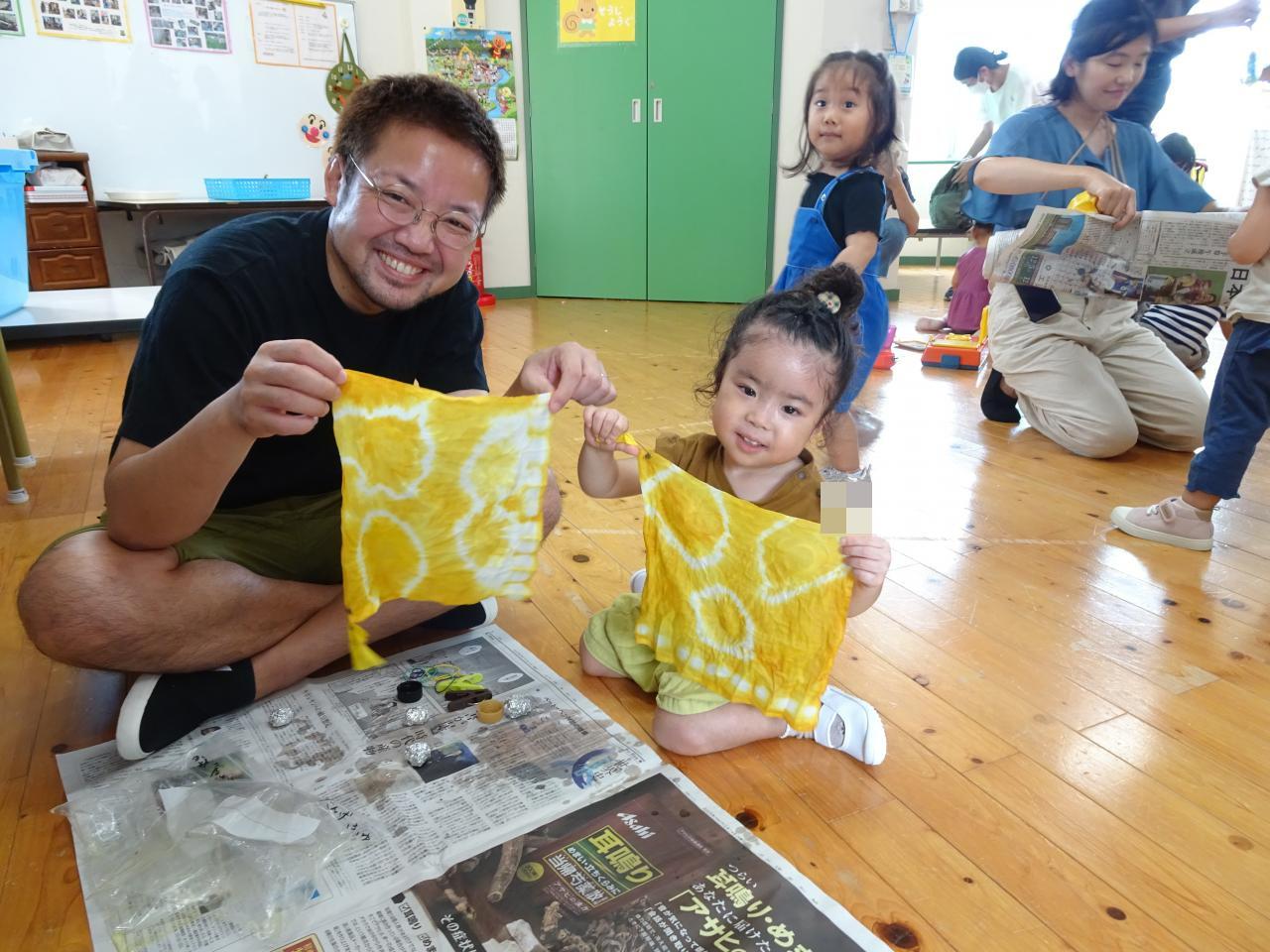 自然のものの柔らかい色や、ハンカチのふわふわの感触、玉ねぎの皮の匂いなど、身体いっぱいで感じて遊びました。