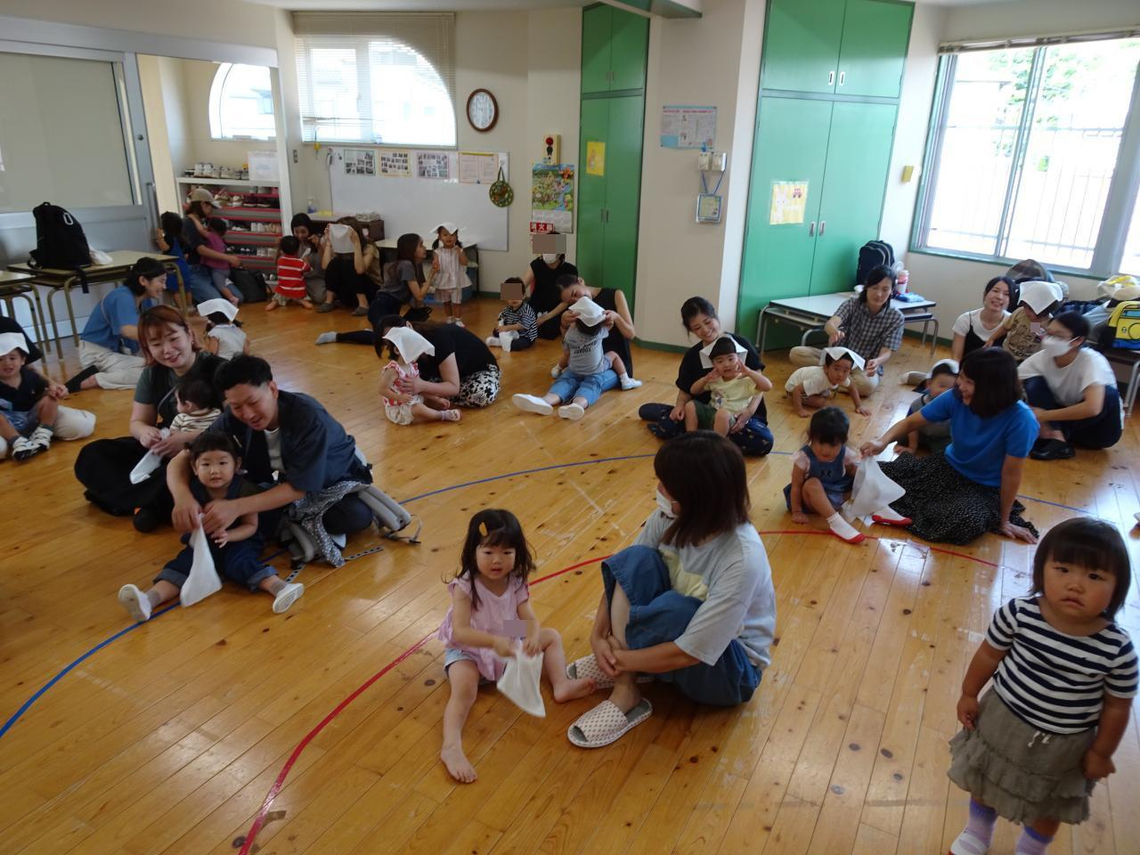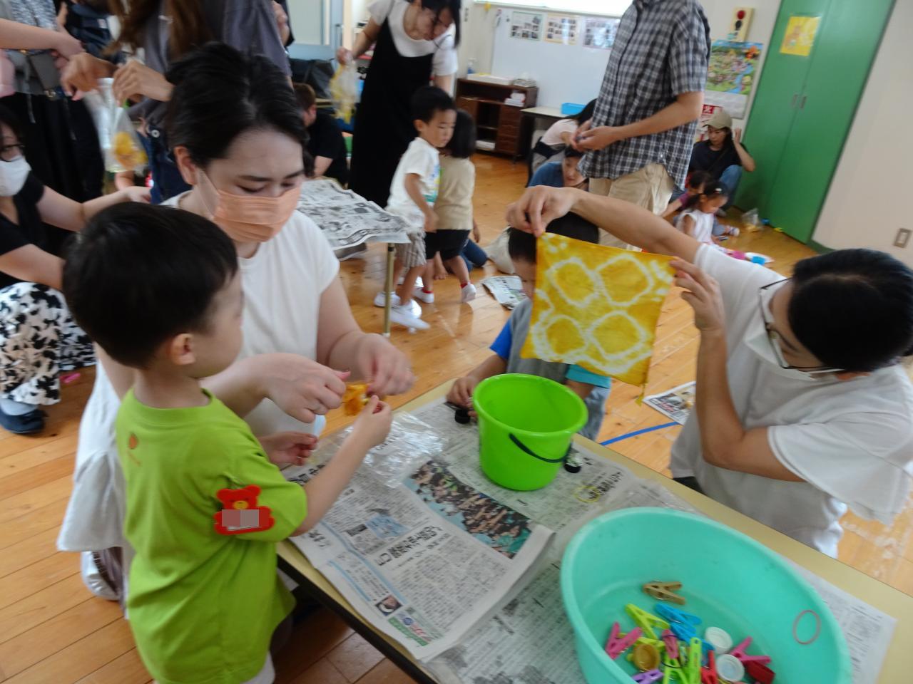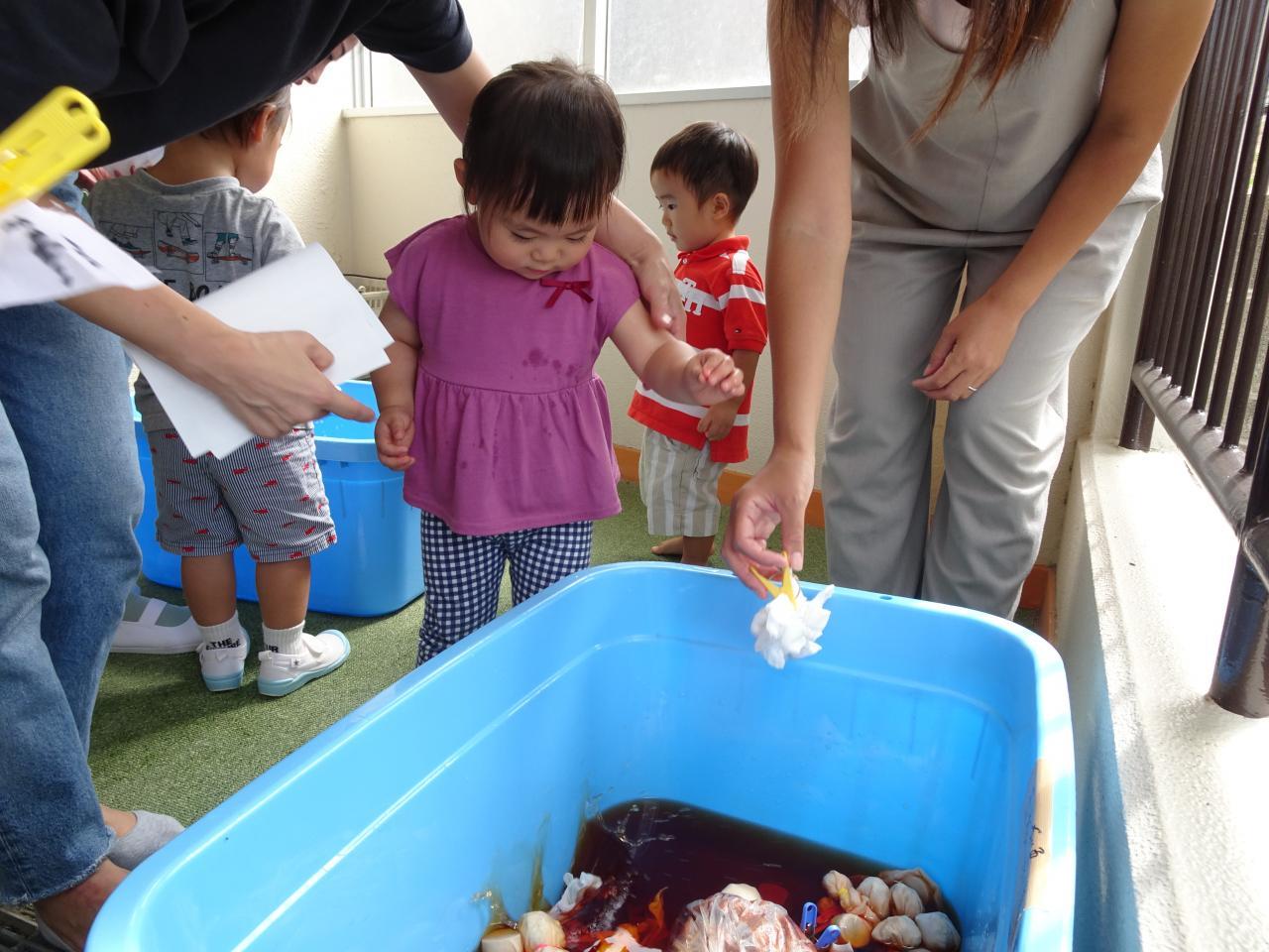 染料液にしばらくつけておく間に、体操「ぼくのミックスジュース」や紙芝居をみて楽しんで待ちました。