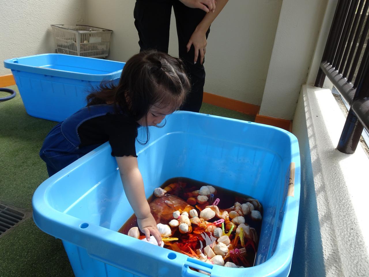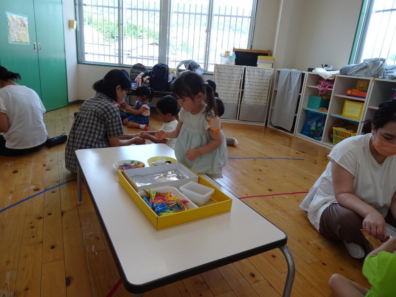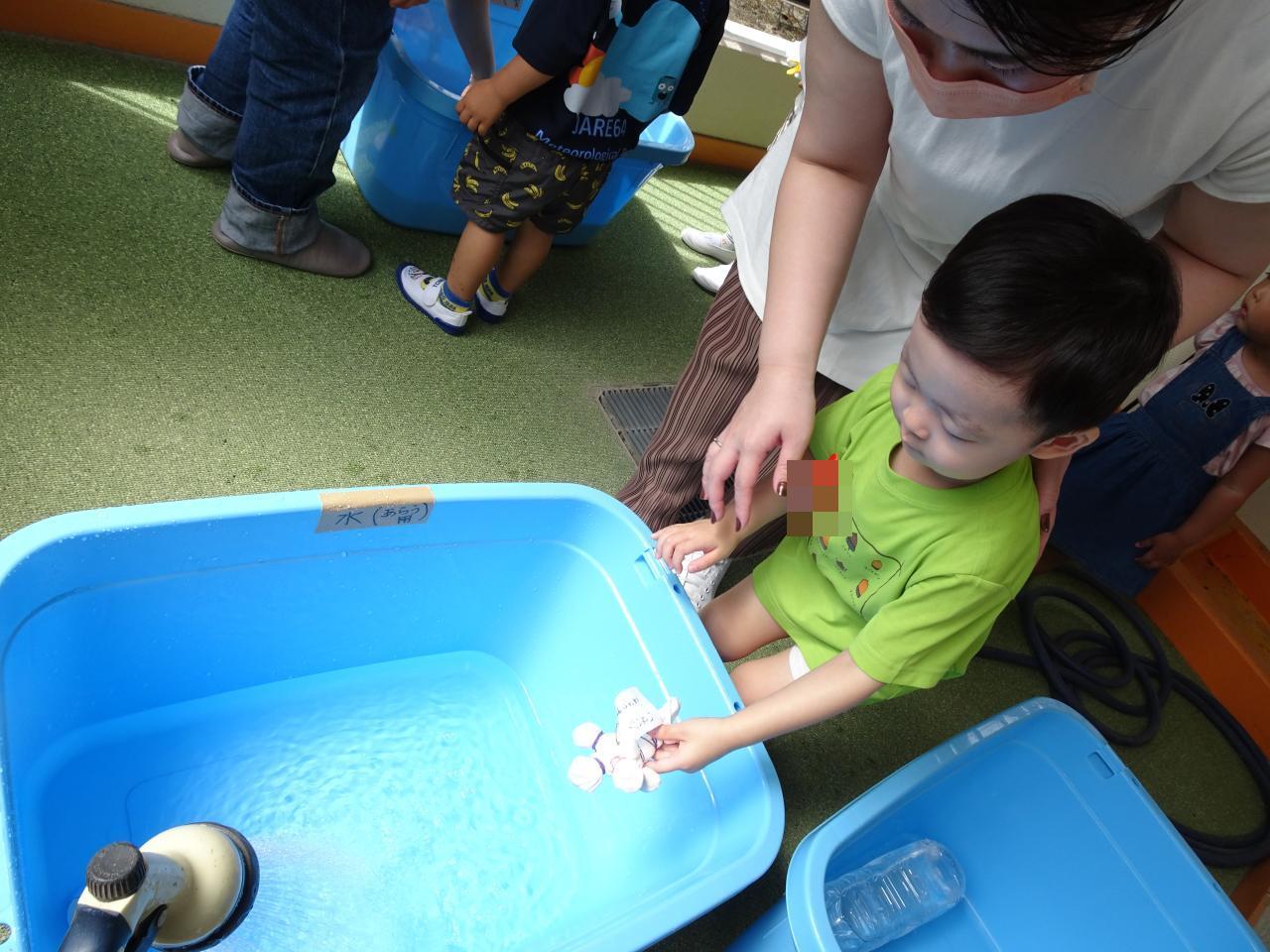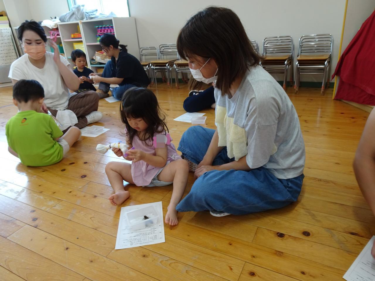 染料液にしばらくつけておく間に、体操「ぼくのミックスジュース」や紙芝居をみて楽しんで待ちました。