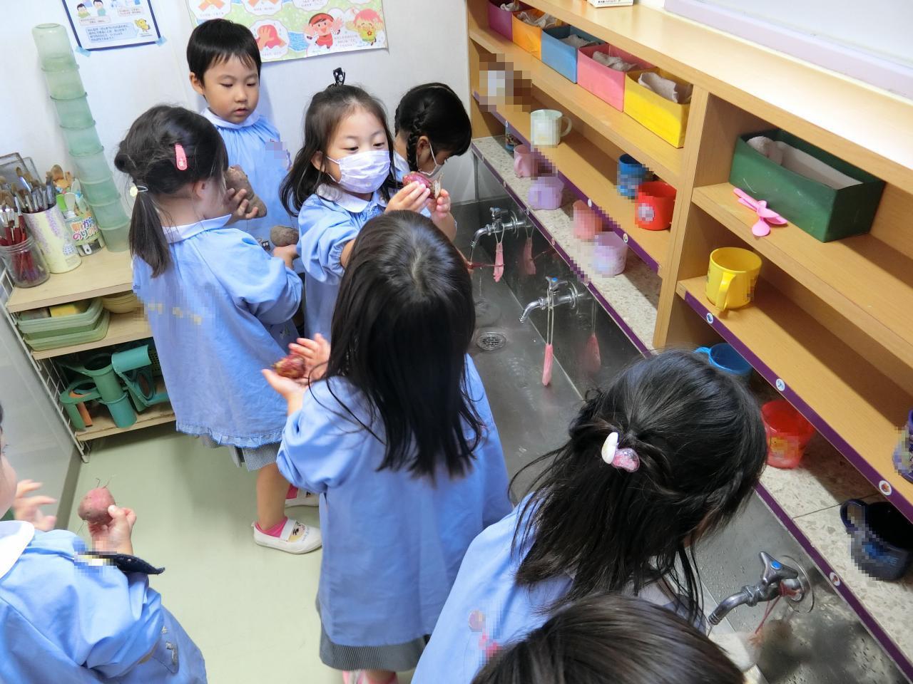 収穫したお芋をみんなで洗って、