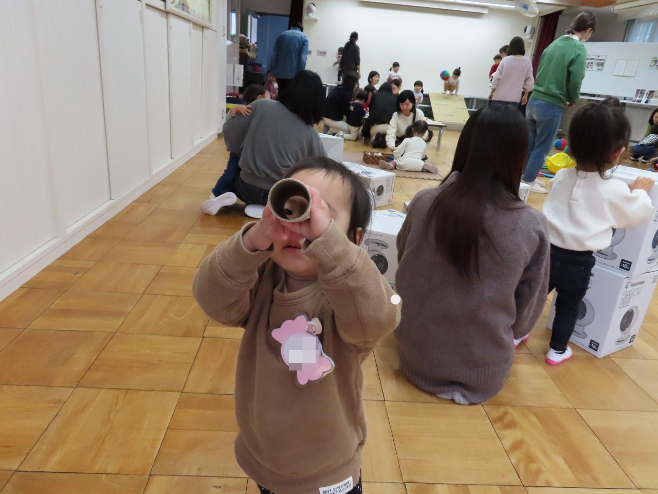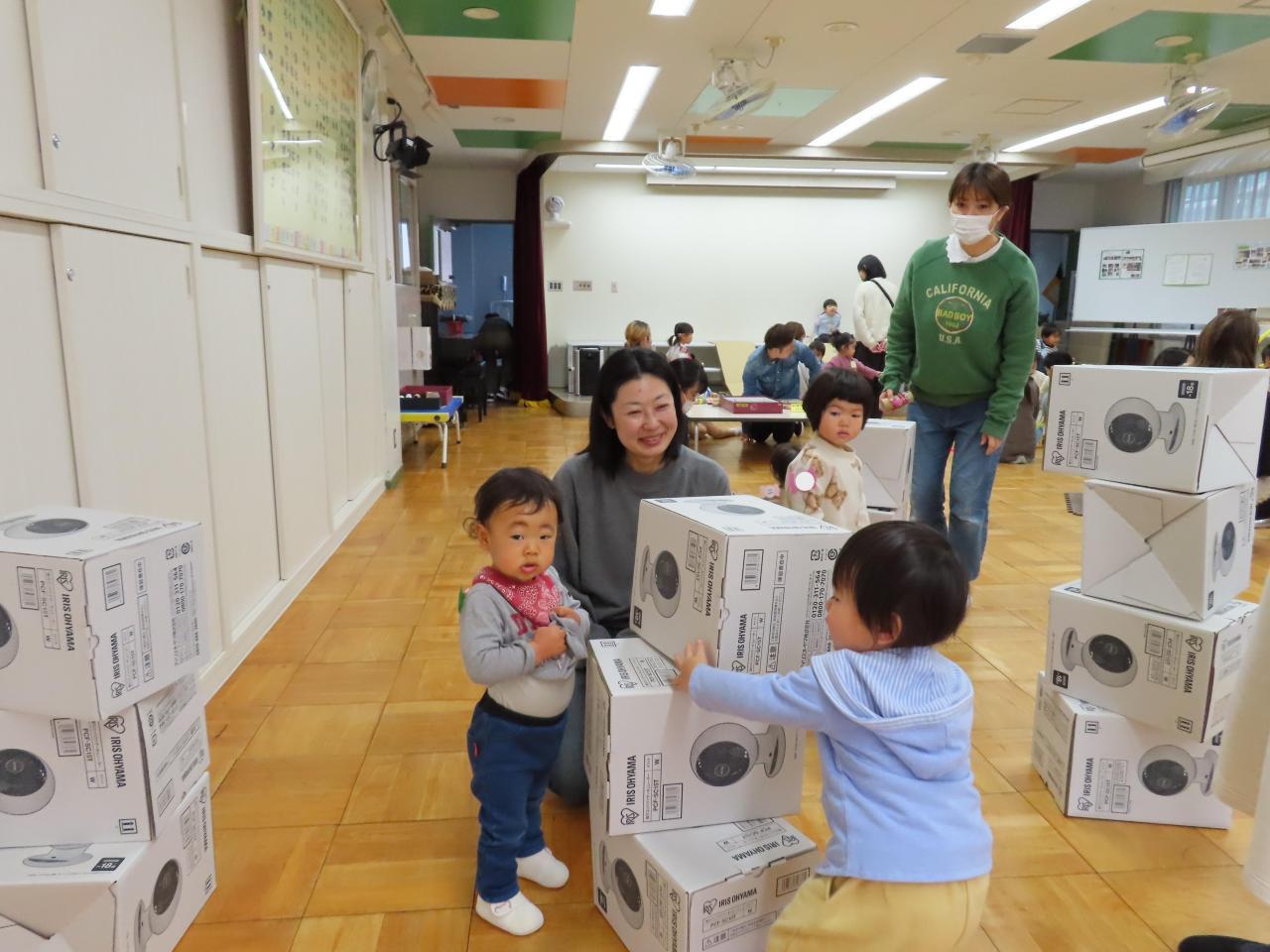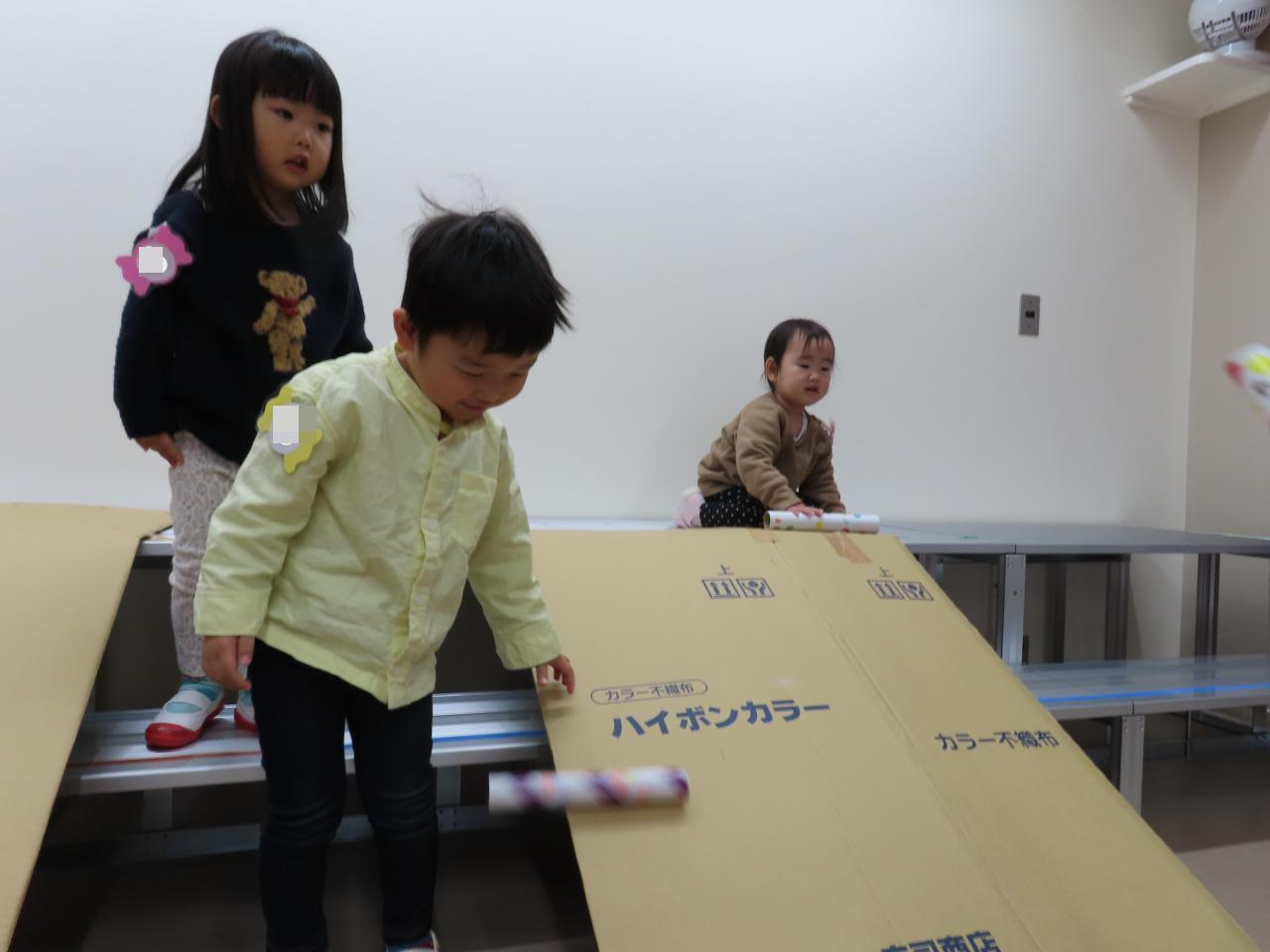 前半は、ボールやラップ芯、トイレットペーパー芯をころころ転がしたり、大きな箱積みなどで遊びました。