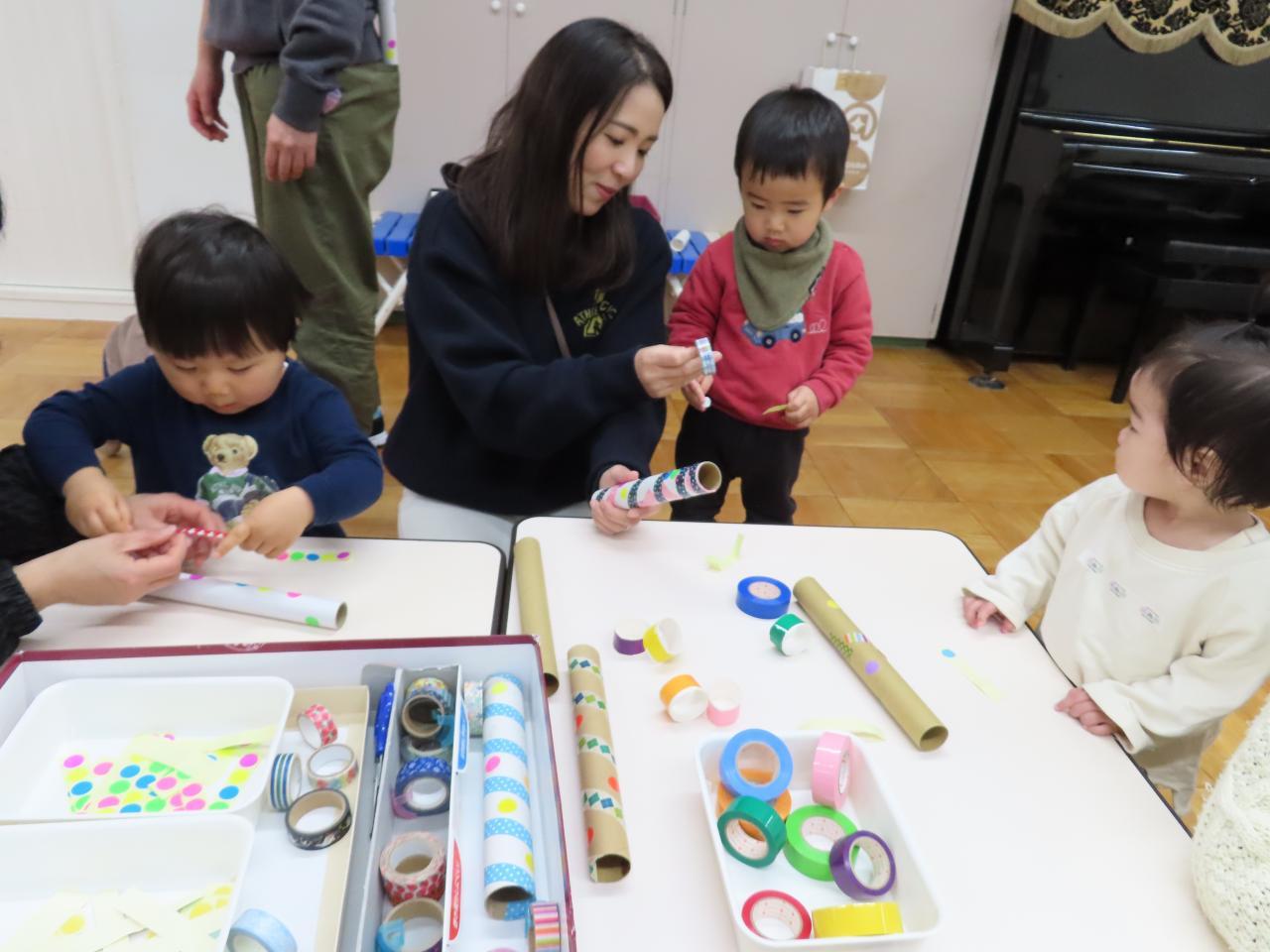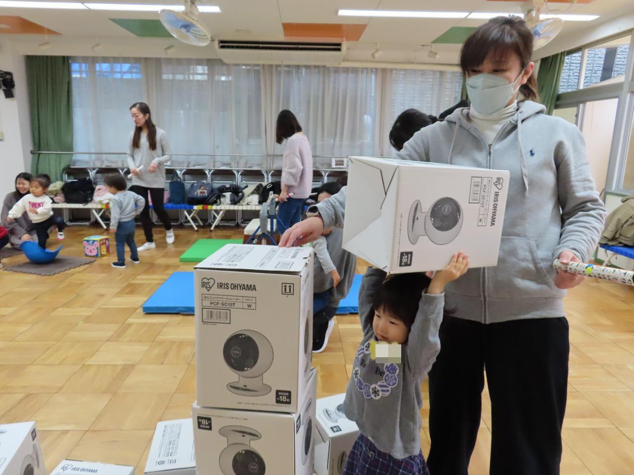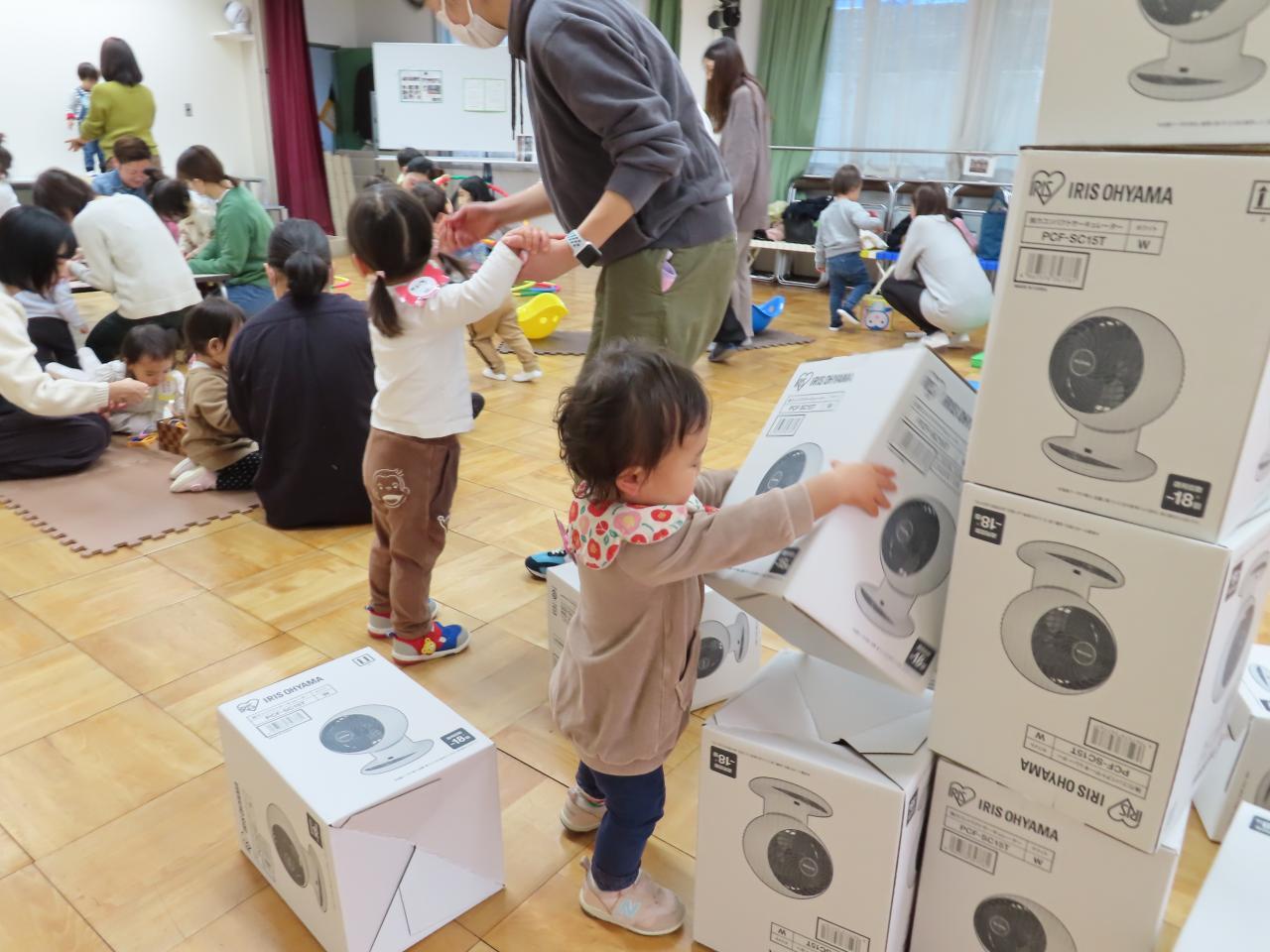 前半は、ボールやラップ芯、トイレットペーパー芯をころころ転がしたり、大きな箱積みなどで遊びました。