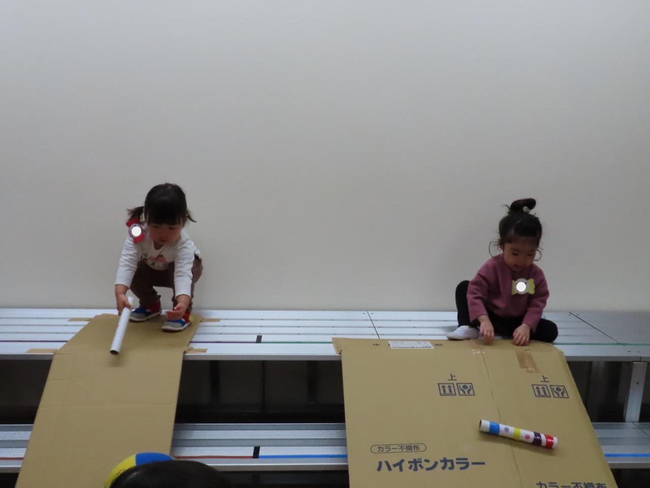 色んな素材を使って遊んでいるうちに、新しい遊び方を発見したり、もっと転がるように向きを変えるなど工夫する姿もら見られました。