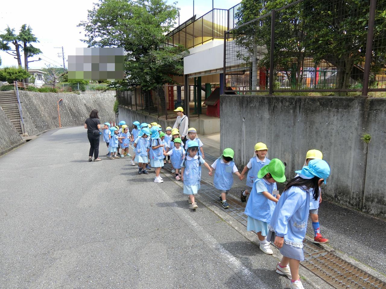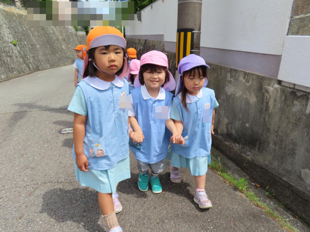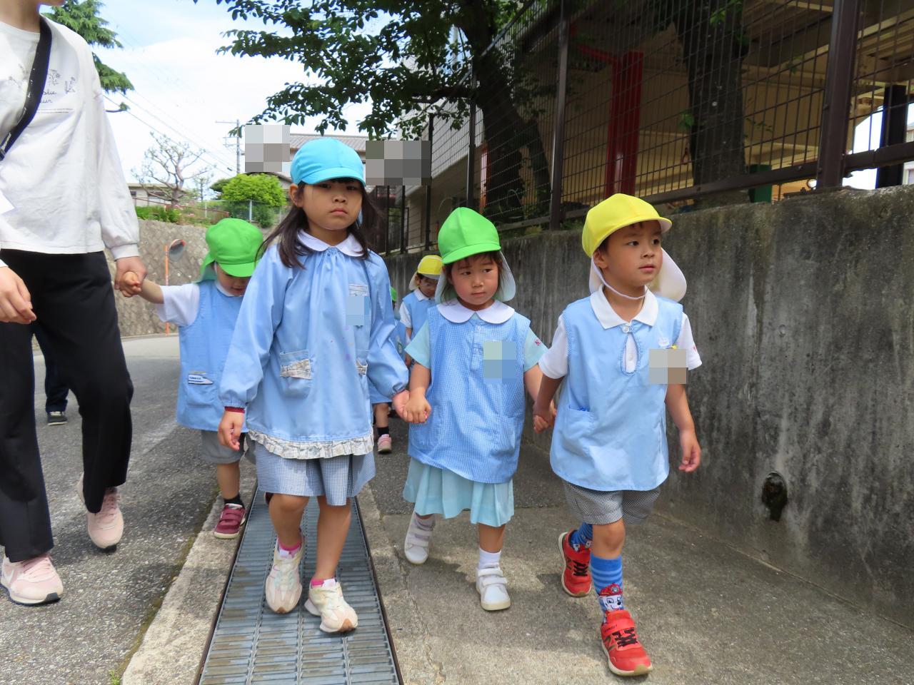 道のはしっこを歩くこと、繋いでいる手を離さないこと、前の人と間をあけずに歩くこと…などの約束を守って、みんなで散歩を楽しみました。