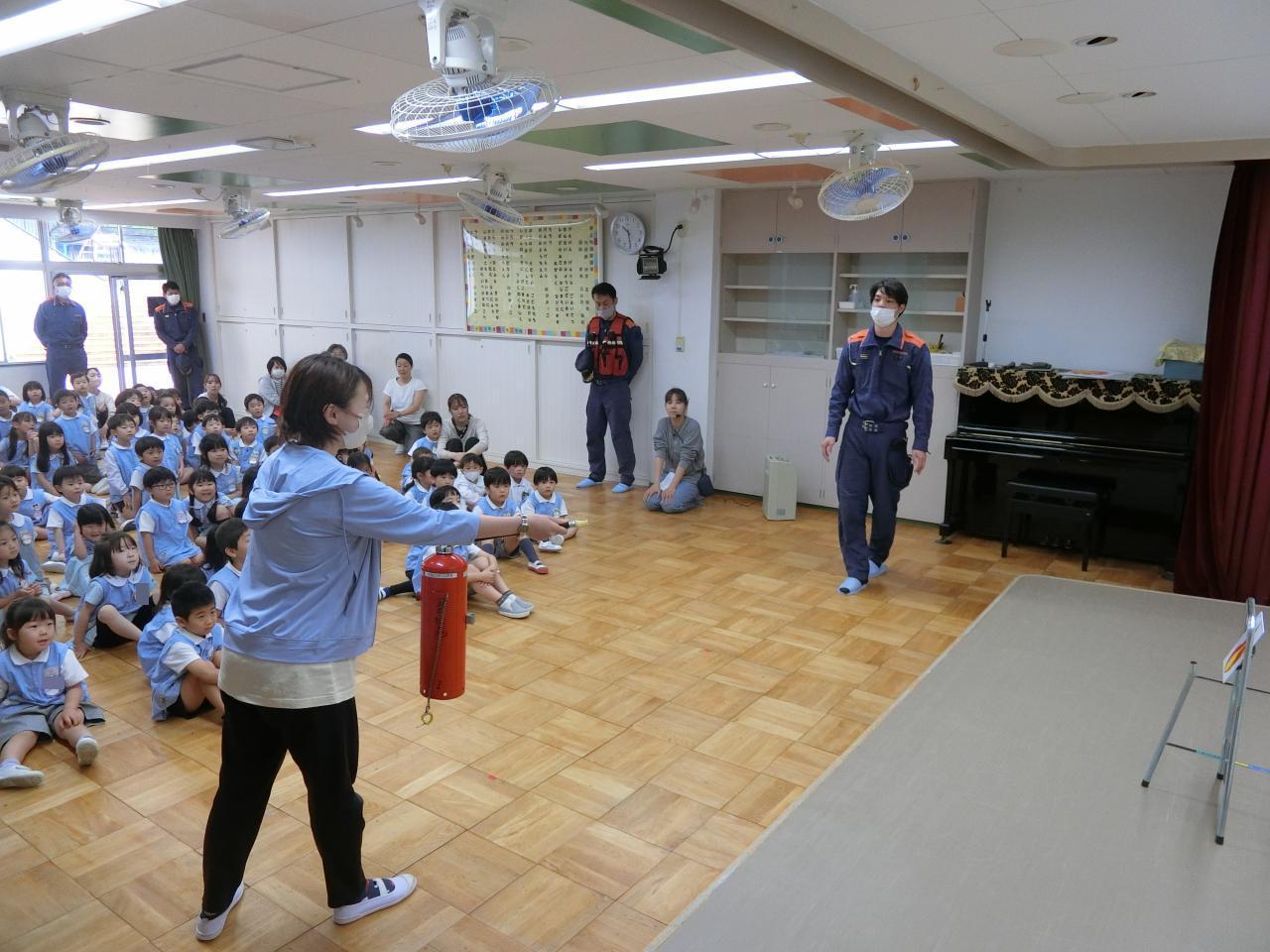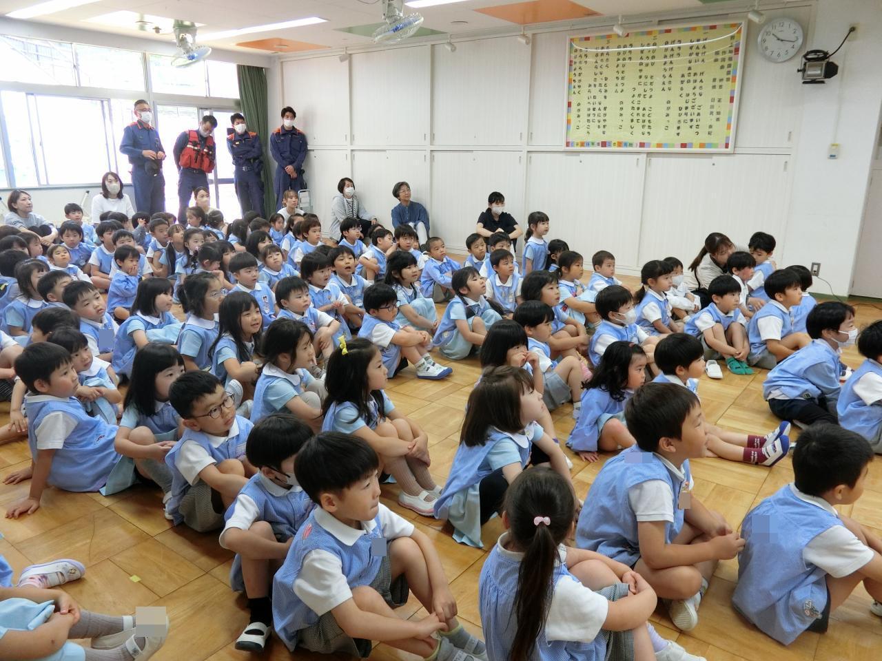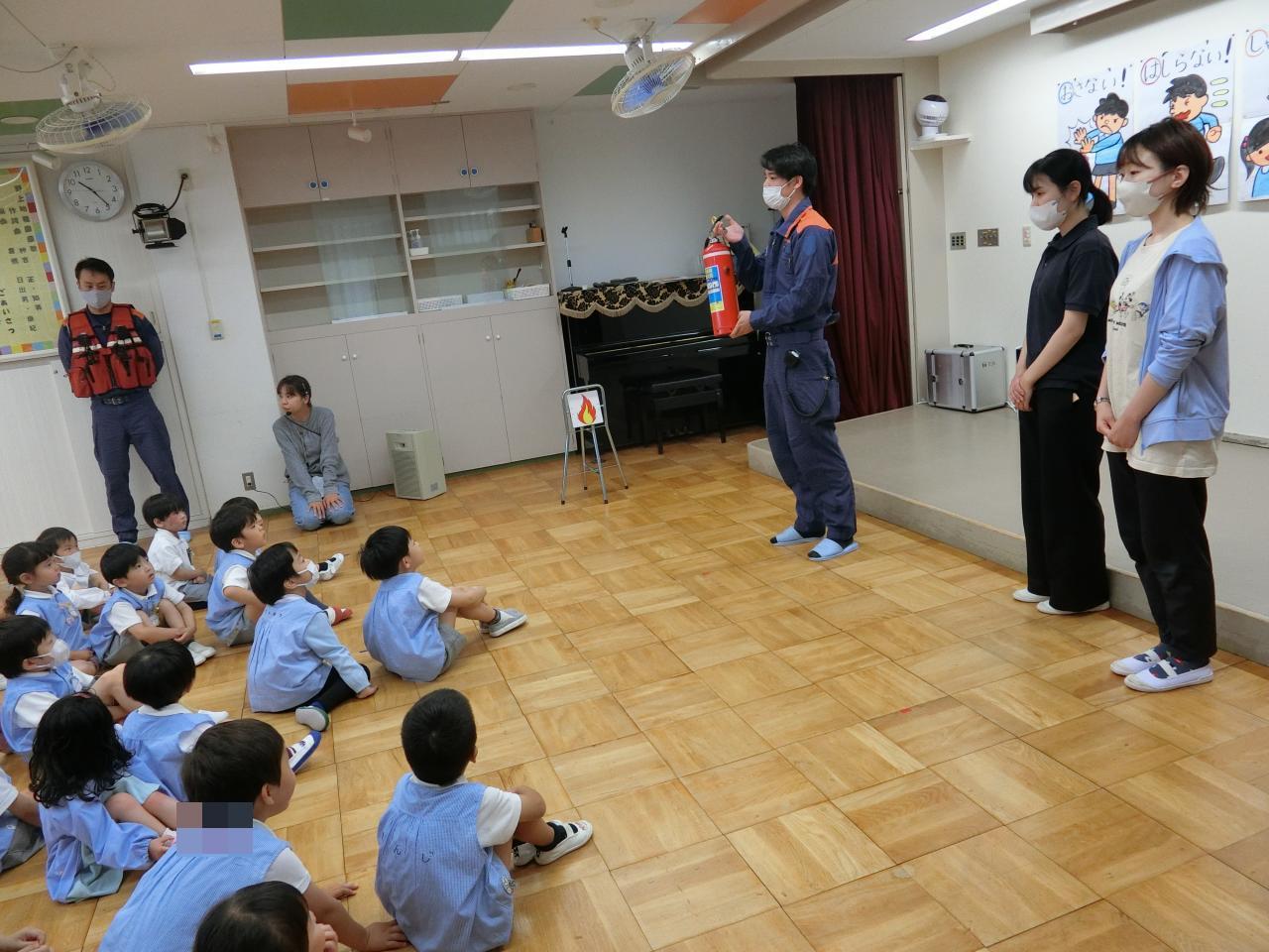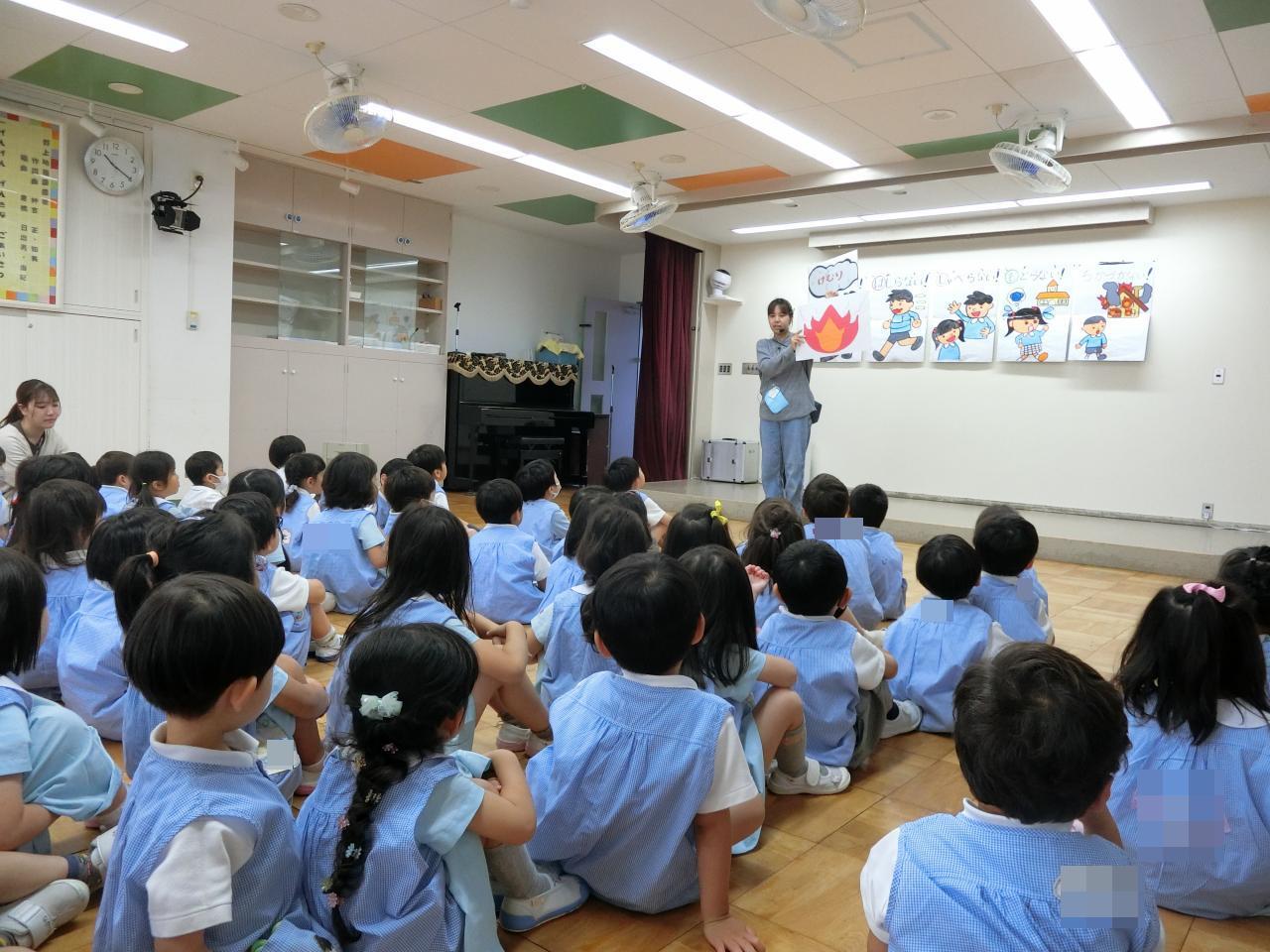 避難する時の約束『お・は・し・も・ち』(押さない・走らない・喋らない・戻らない・近付かない)の確認や、火事が起きた時に注意しなければならない『けむり』についての話を聞きました。