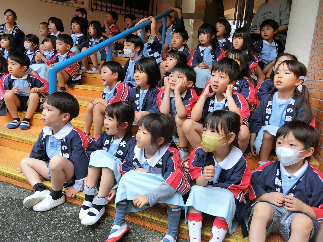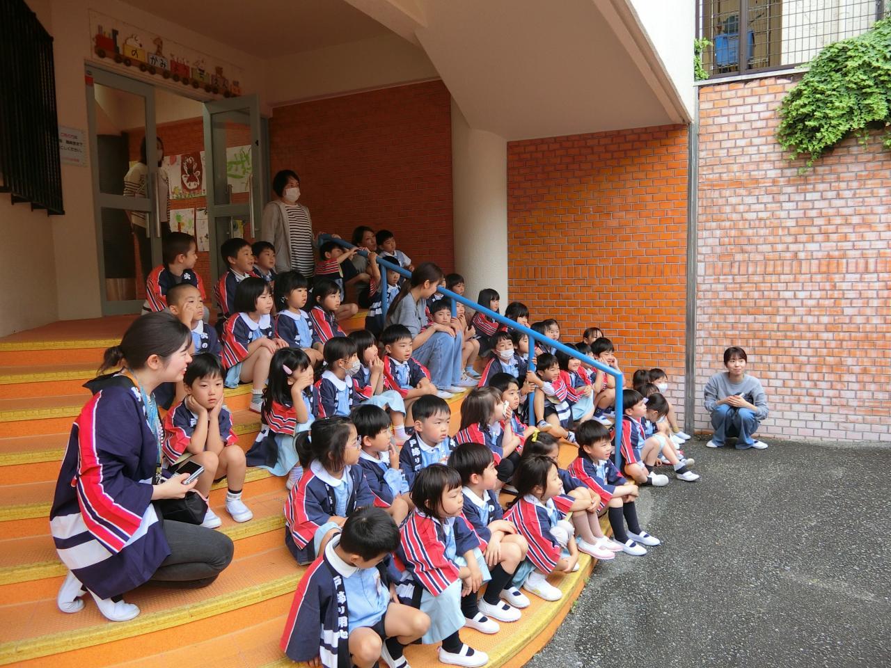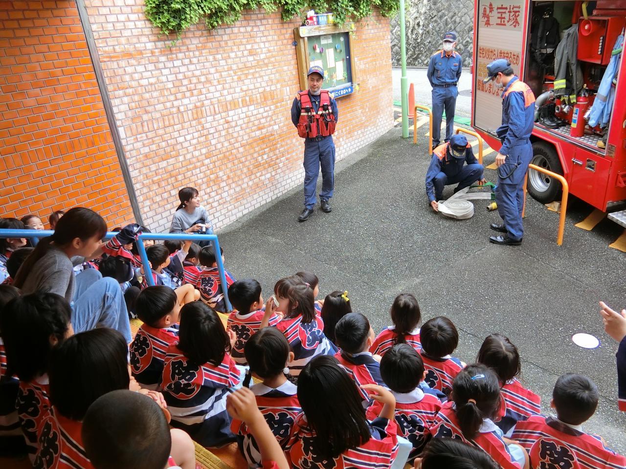 避難訓練の後は、年長組が法被をまとって集合し、消防車を近くで見させていただきました。