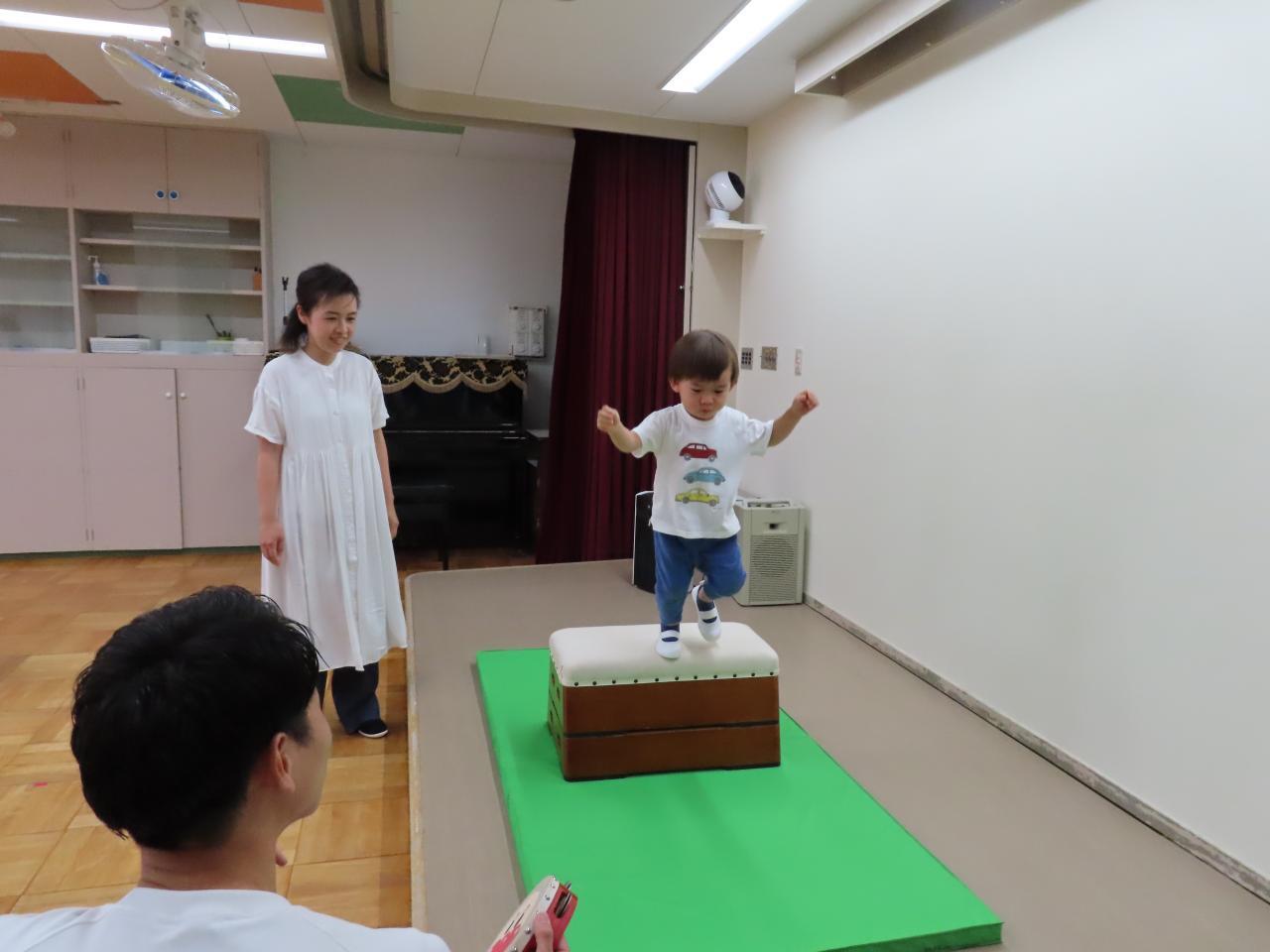 みんなで朝の挨拶をした後には、出席調べ。今日は一人ずつ返事の後には 跳び箱ジャンプ(または乗り越え)にチャレンジしました。跳び箱の後には体操の先生のタンバリンにタッチ!