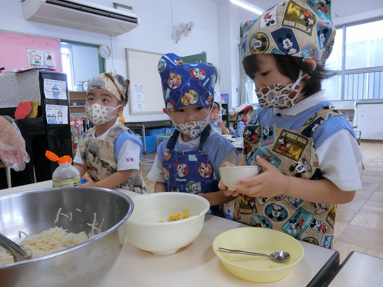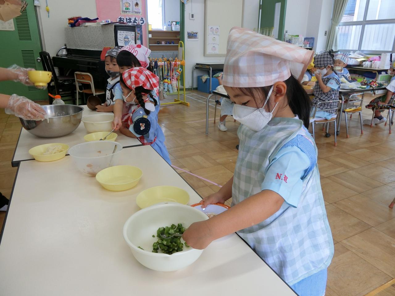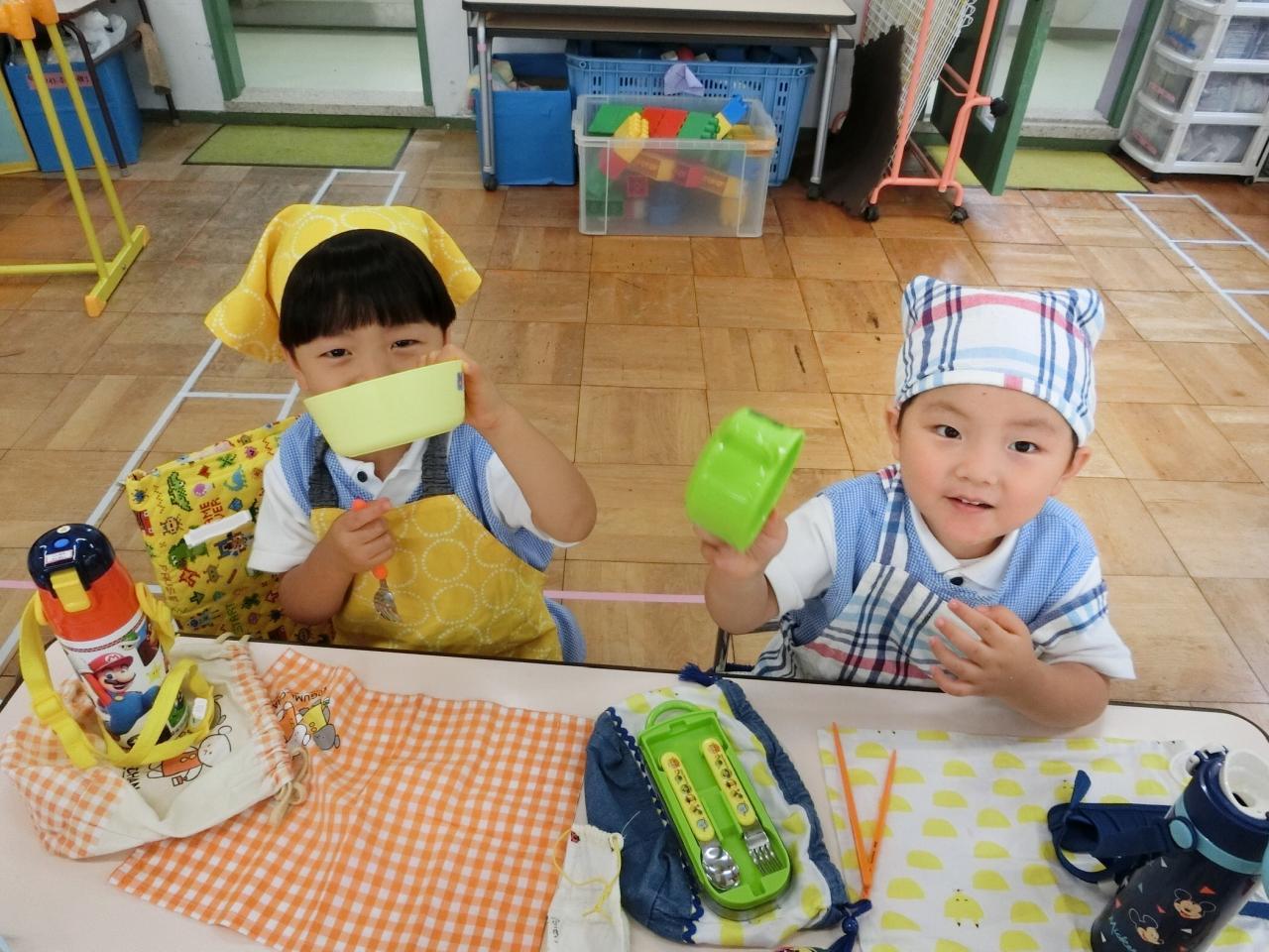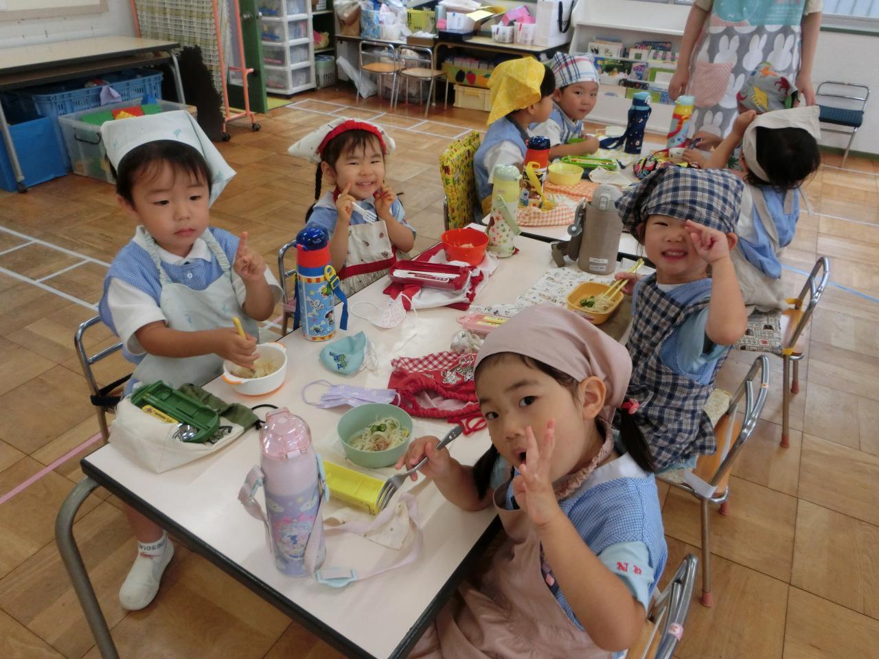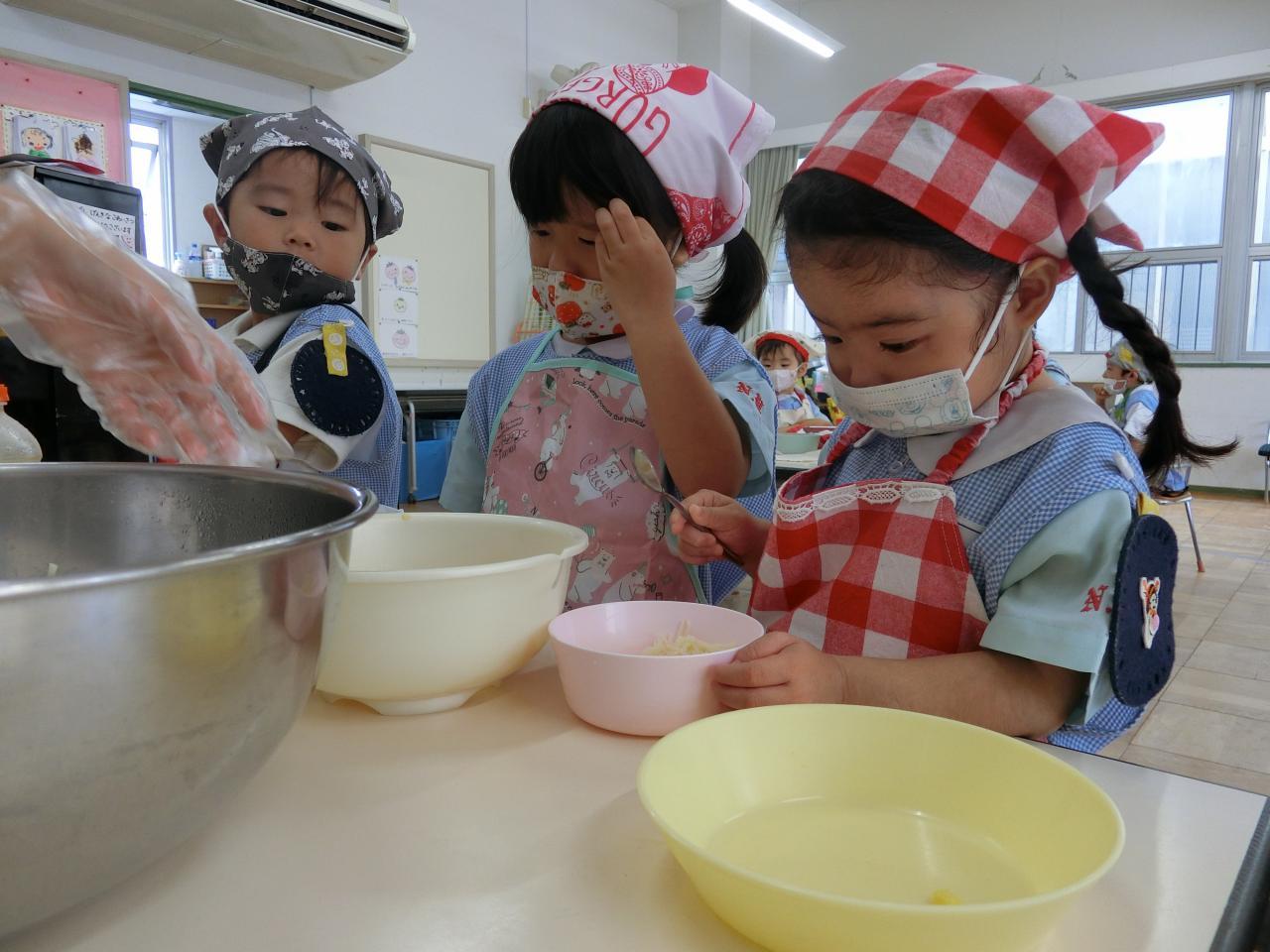 幼稚園での初めてのクッキングは、自分でトッピングしたこともあり、おかわりも全てなくなりました!嬉しそうな顔がとっても素敵でした。