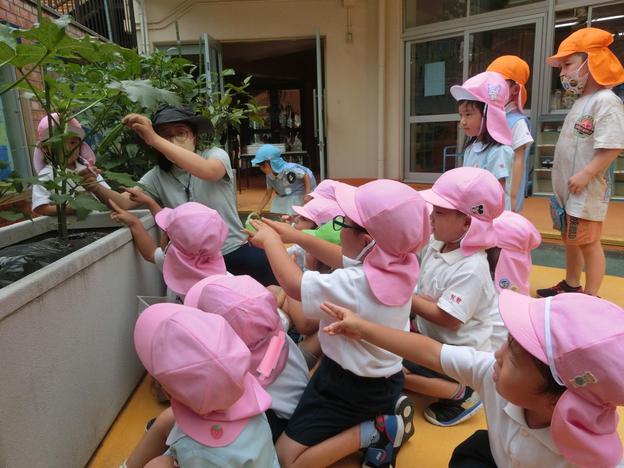 クッキングの前日に、大きく育ったオクラの収穫を行いました。担任がハサミで切ろうとするのに合わせて、子どもたちも 手をチョキ✌️にして、一緒に「チョキン!」と切りました!