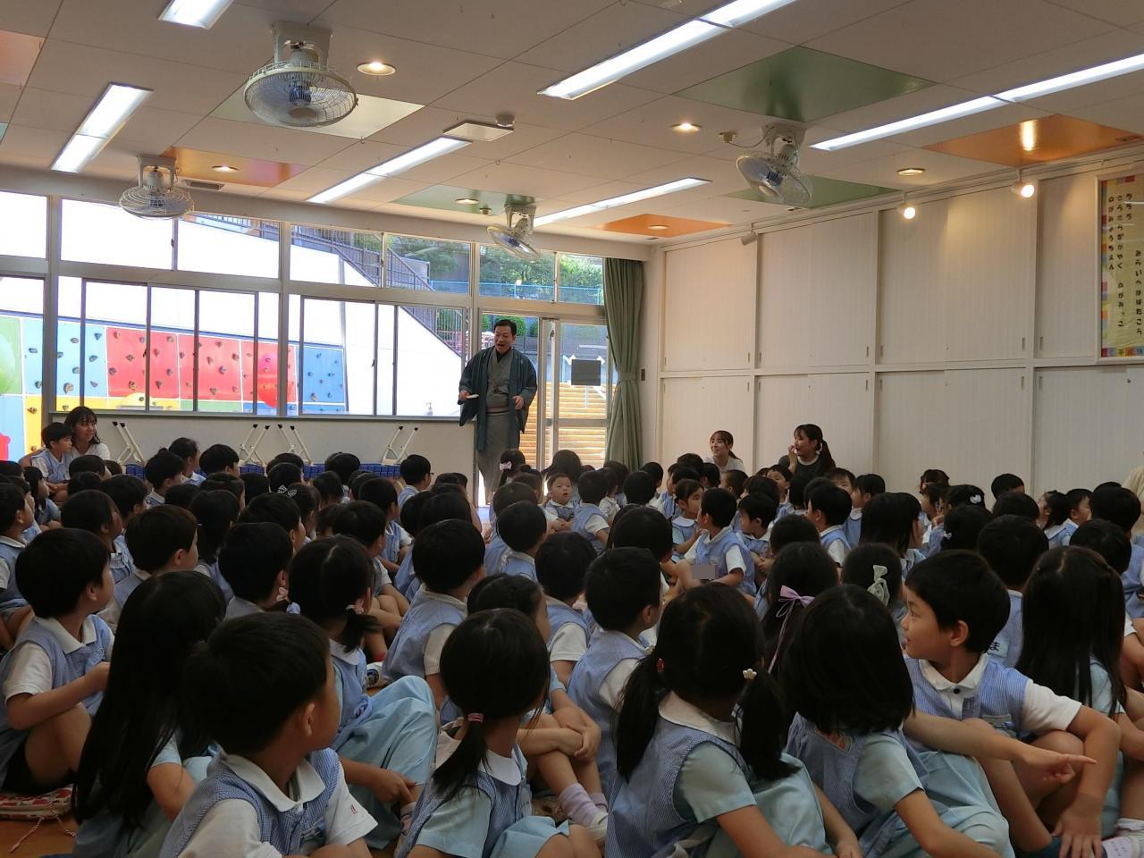 良く通る声の佐ん吉さんの挨拶に刺激を受けた子どもたち、とても元気な挨拶を返していました。