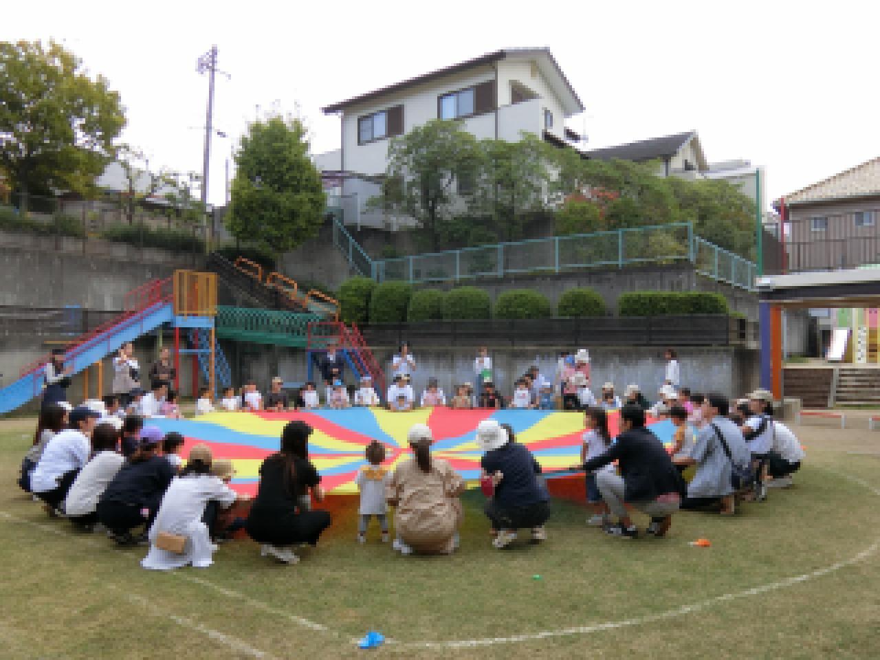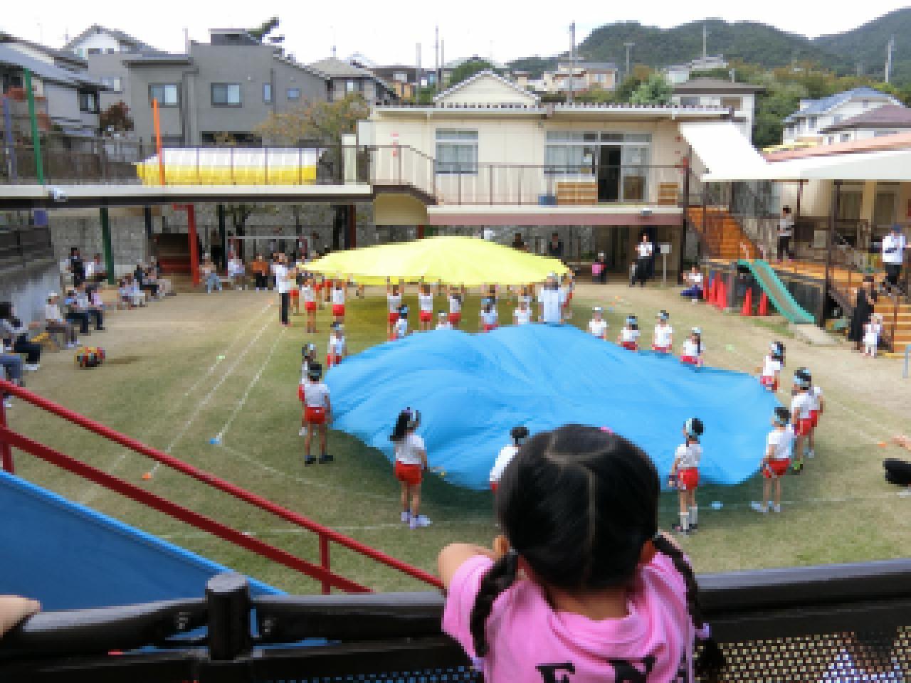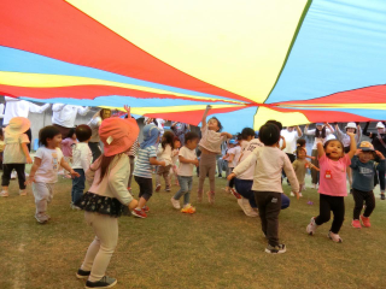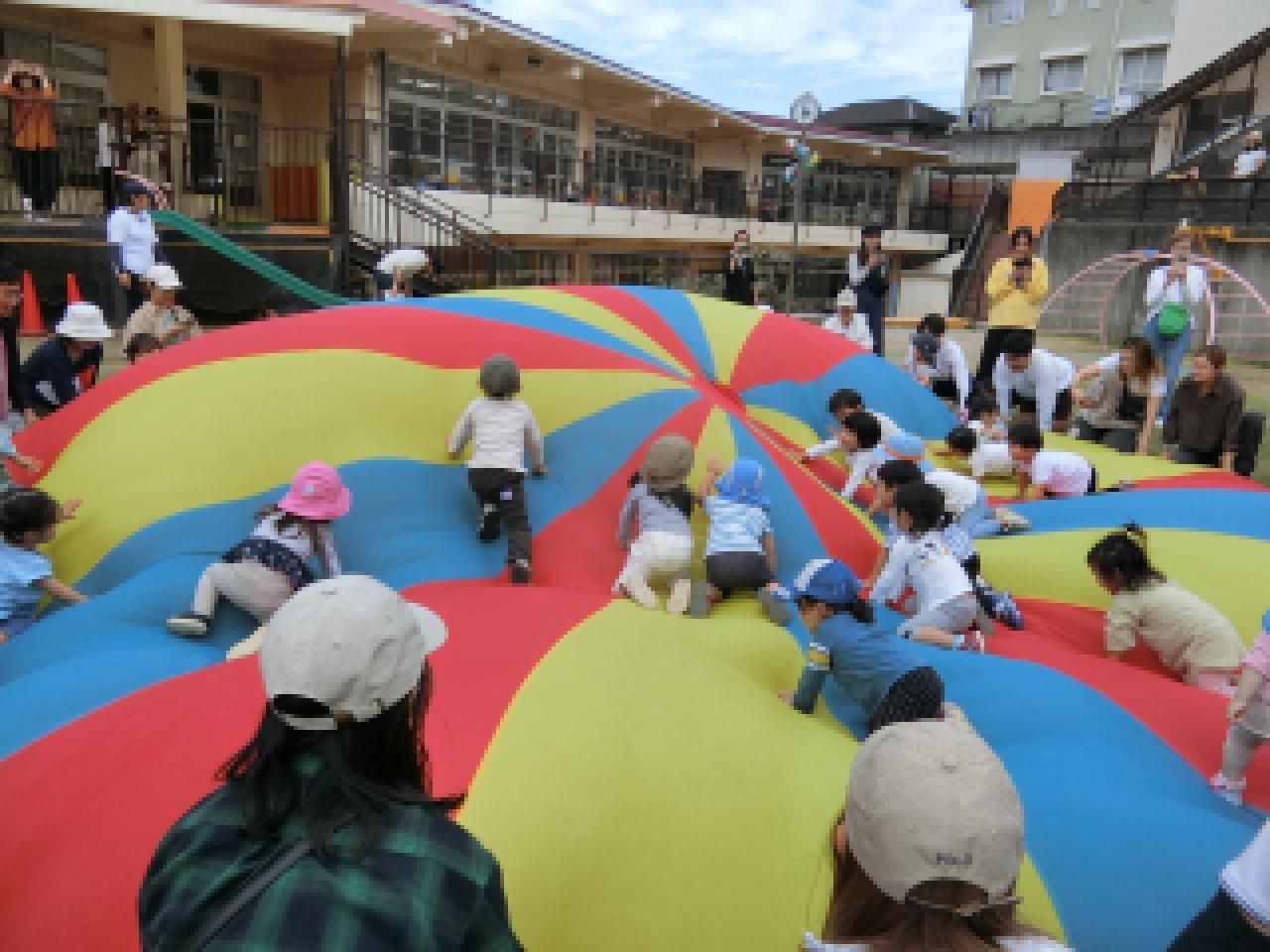 年長さんの演技にもあった”なみ”や”やま”にも挑戦。パラバルーンの中に入ると自然とジャンプする子どもたちです。