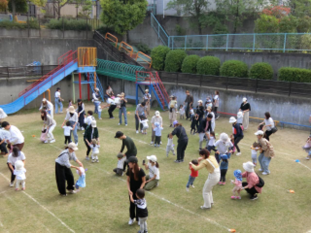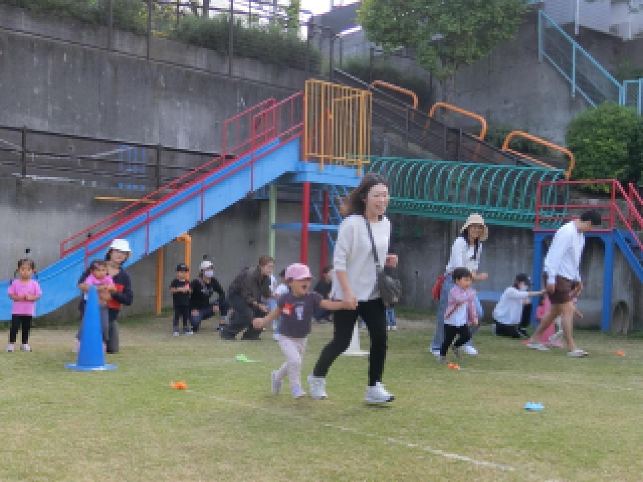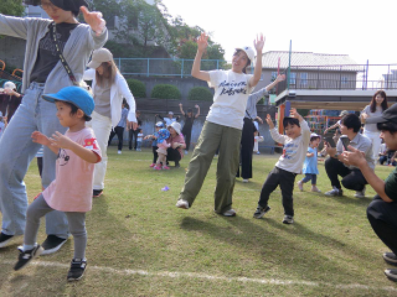 第三種目目【みんなで踊ろう♪】 親子ダンスはふれあいがいっぱい。保護者の方と手をつないでグルグルと回ったり、抱っこでロケットのような”たかいたかい”で満面の笑みが溢れていました。