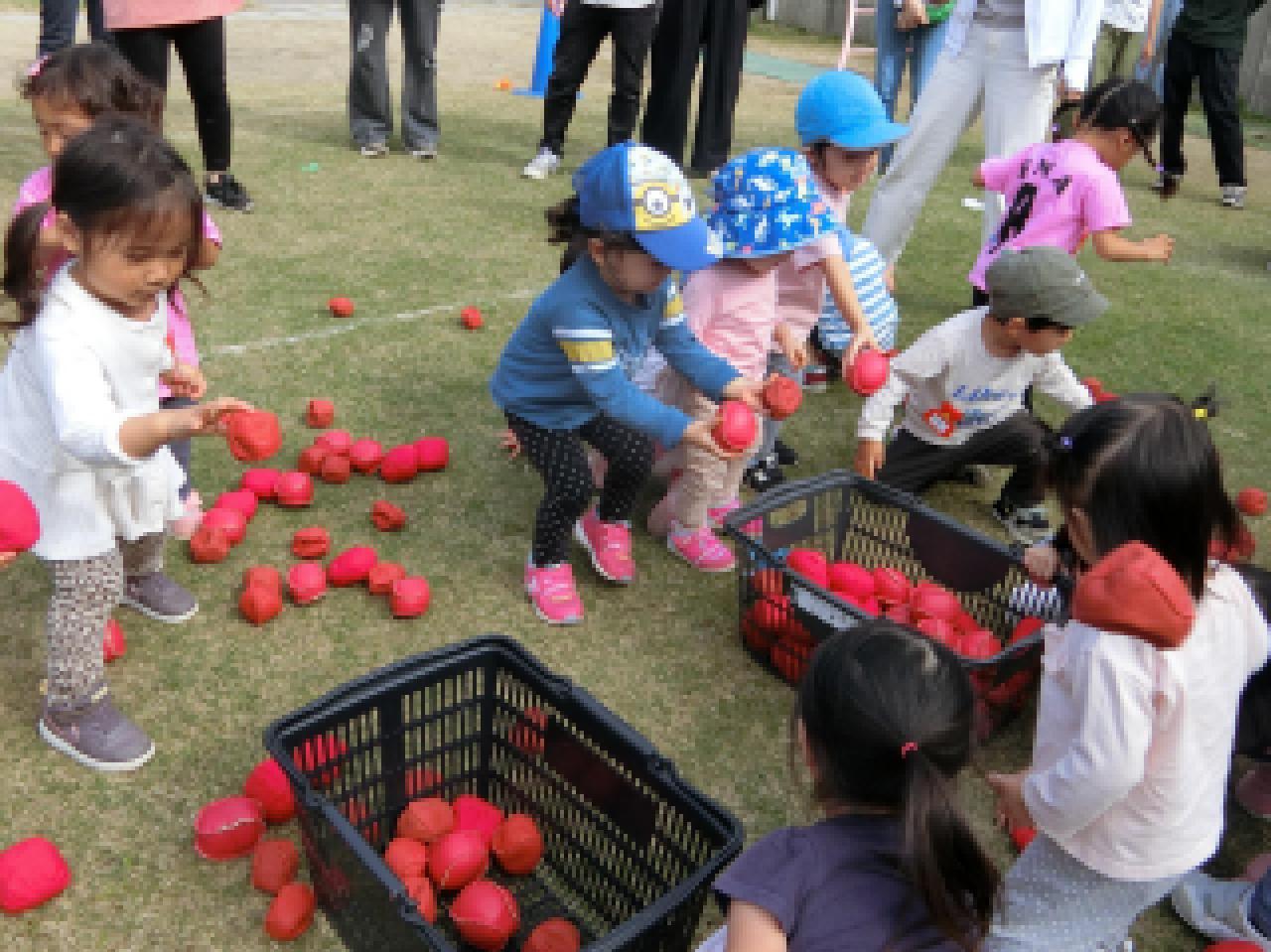 第2種目は【玉入れ】 ポイっと投げる子、玉を集める子、ダンクシュートも とび出しました。