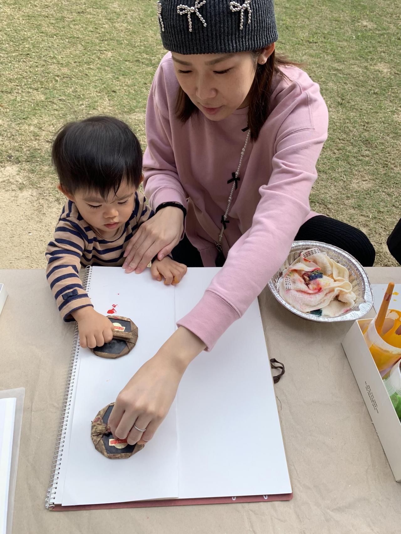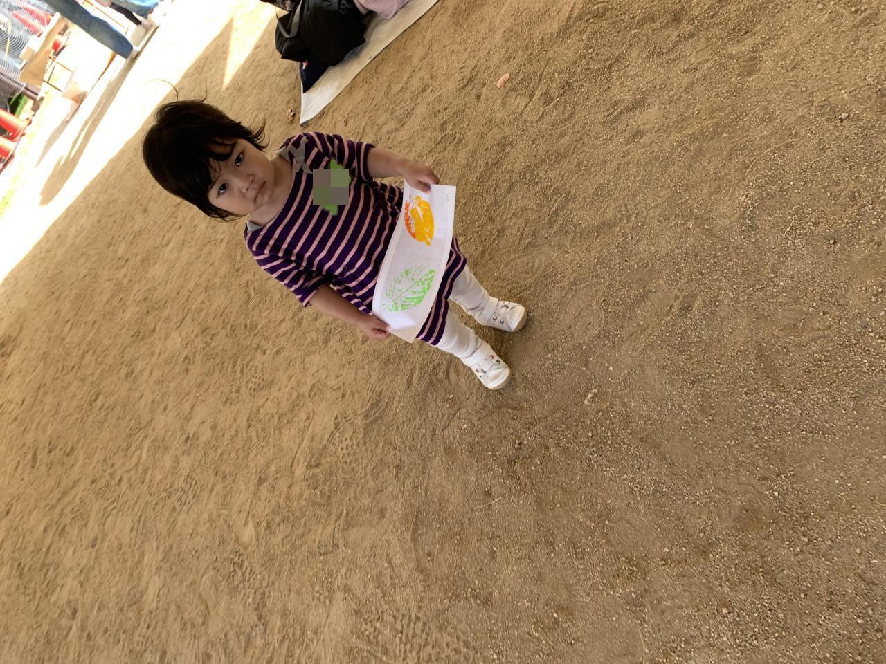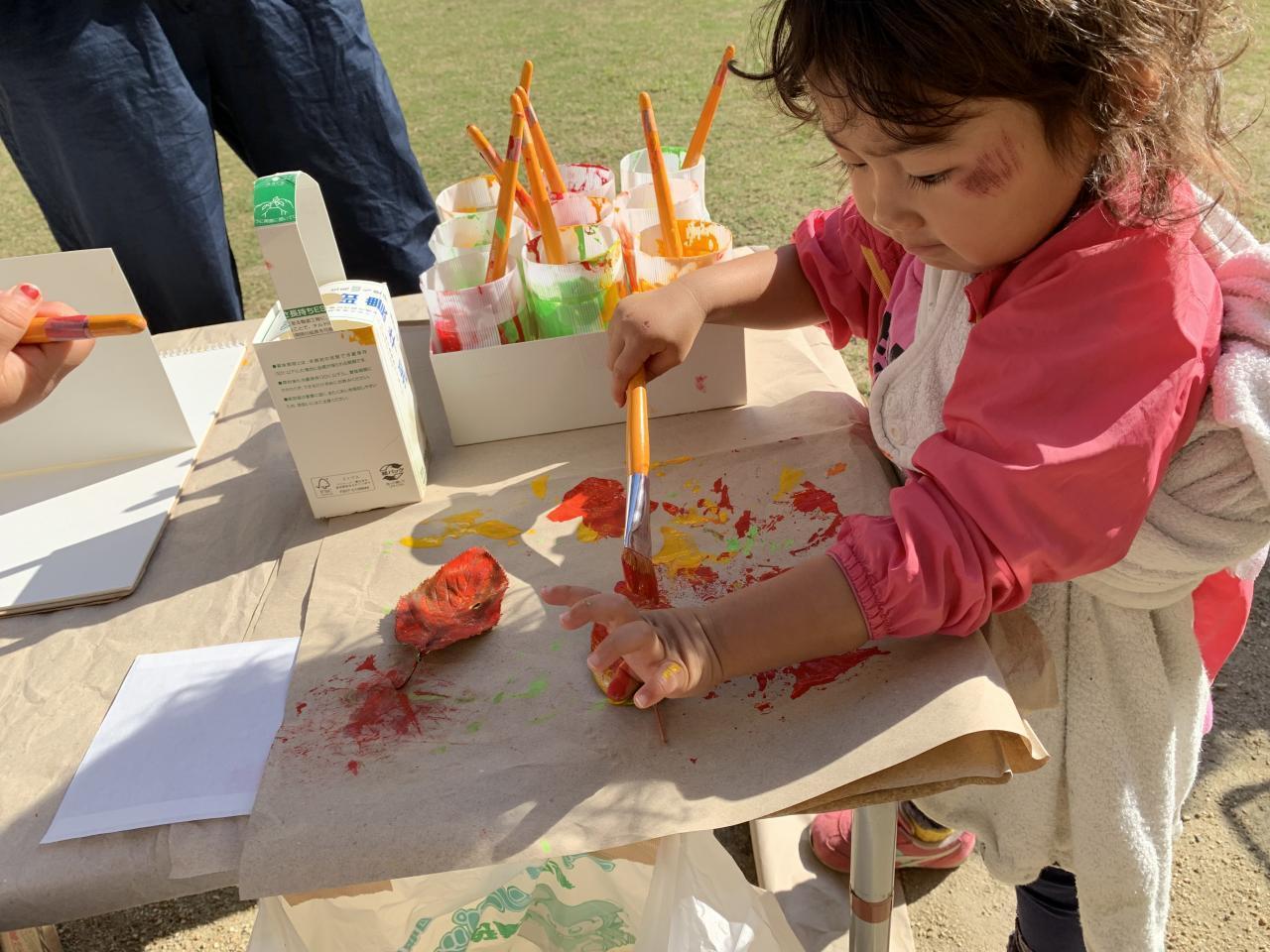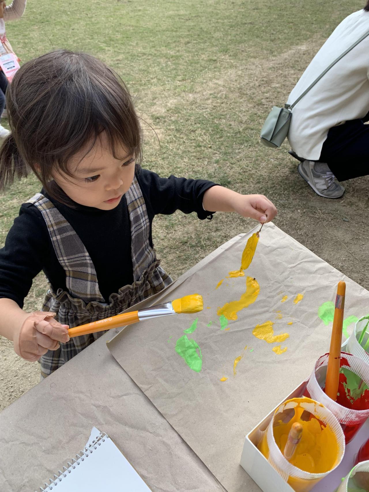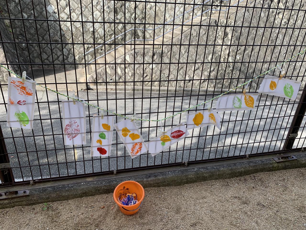 園庭に落ちていた葉っぱを見つけて、絵の具をペタペタ。