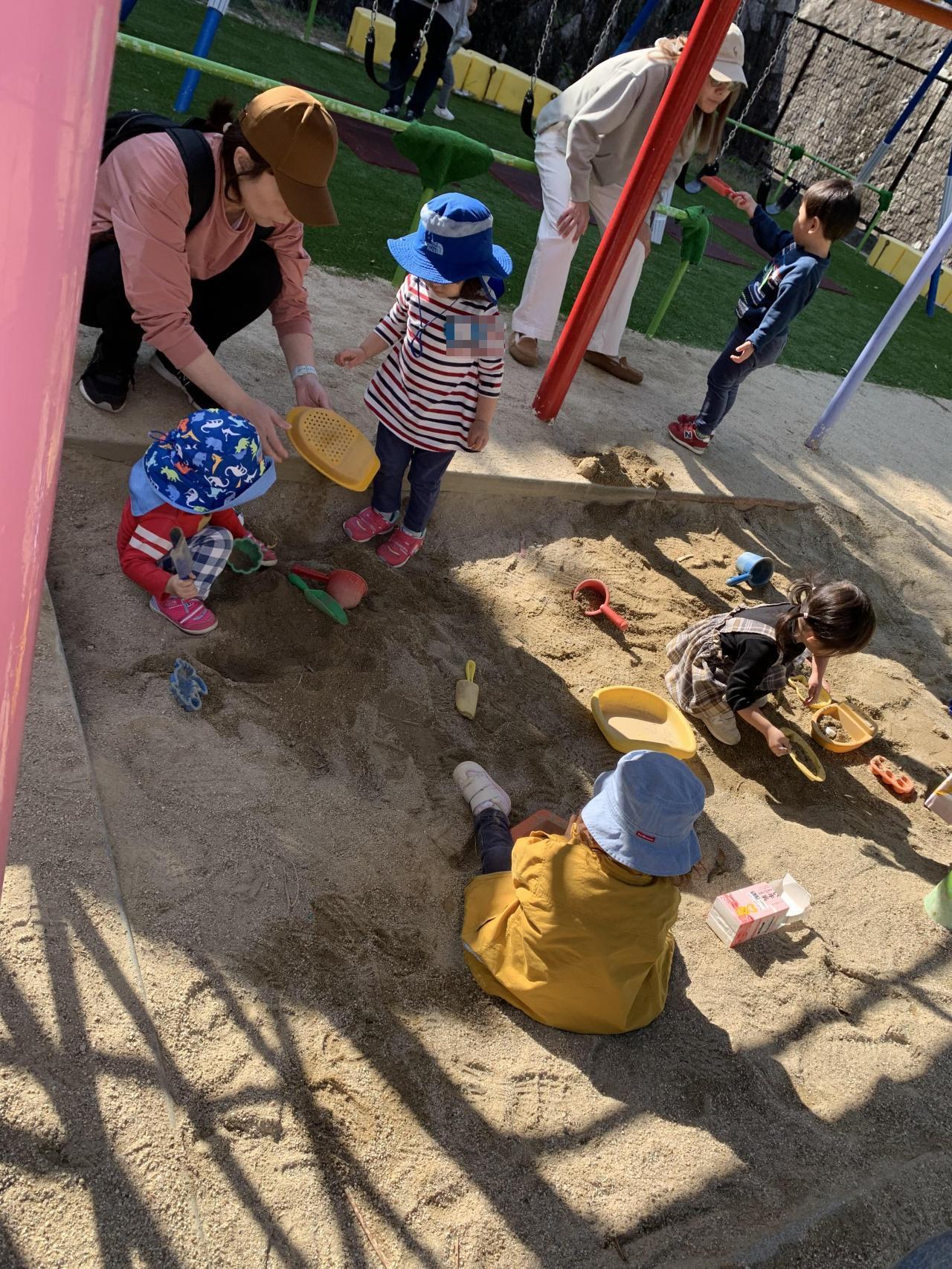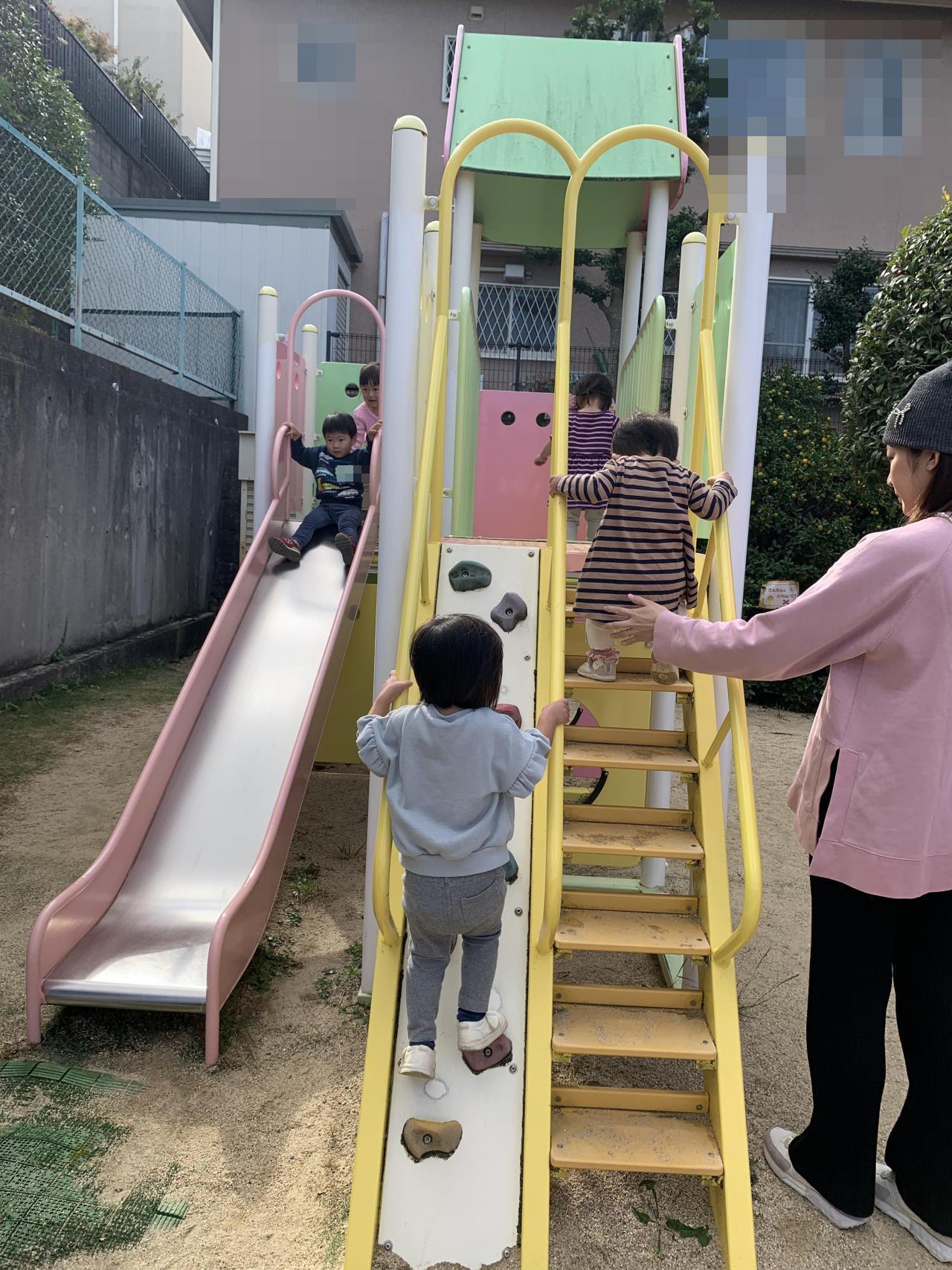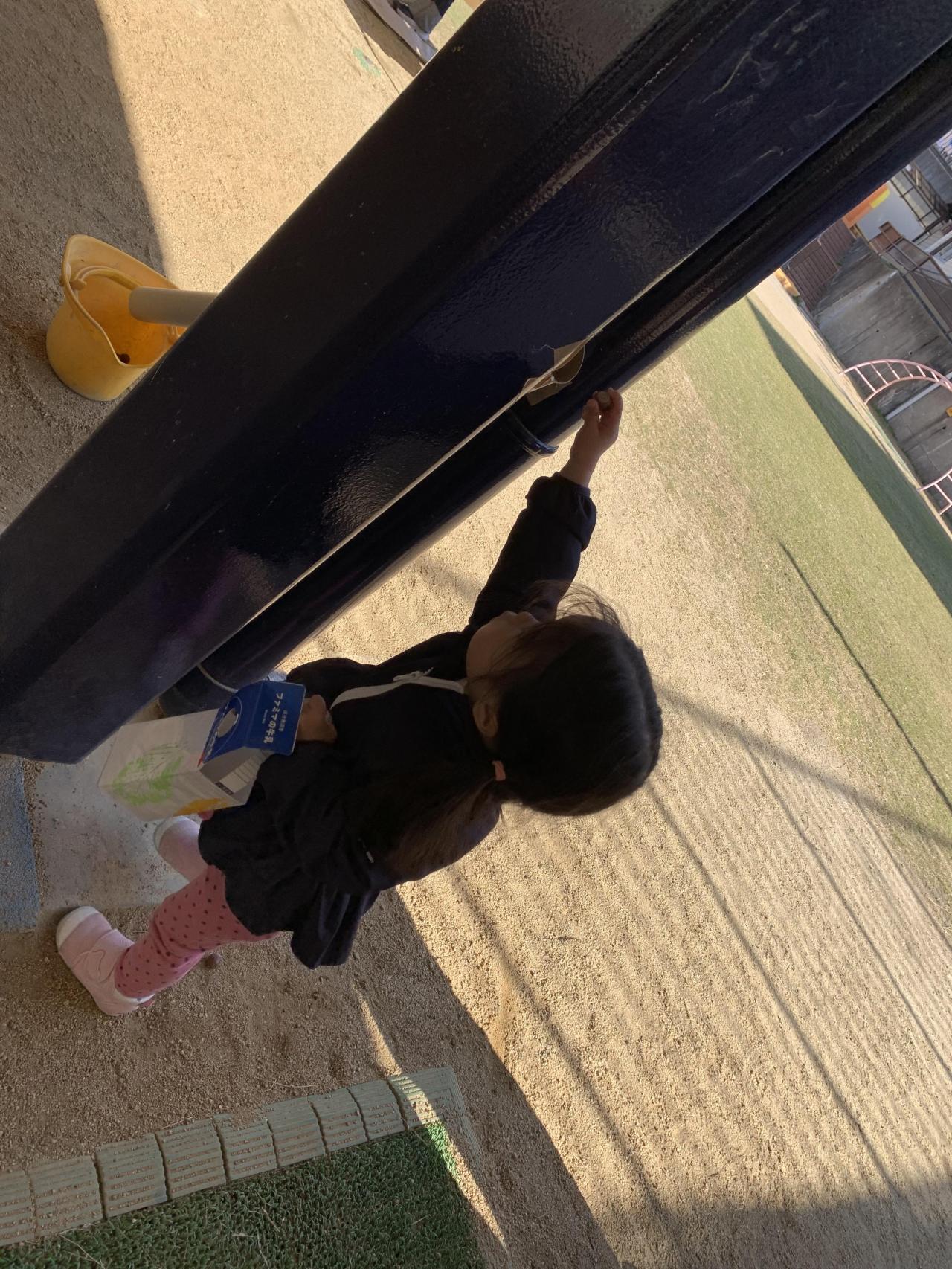 園庭のあっちこっちを歩いて、登って、走って、つかまって・・・いつのまにか大きく身体を使って遊んでいました。最後には「おなかすいた~」の声も聞こえました。お昼ご飯の後は、ゆっくりお昼寝できたかな?
