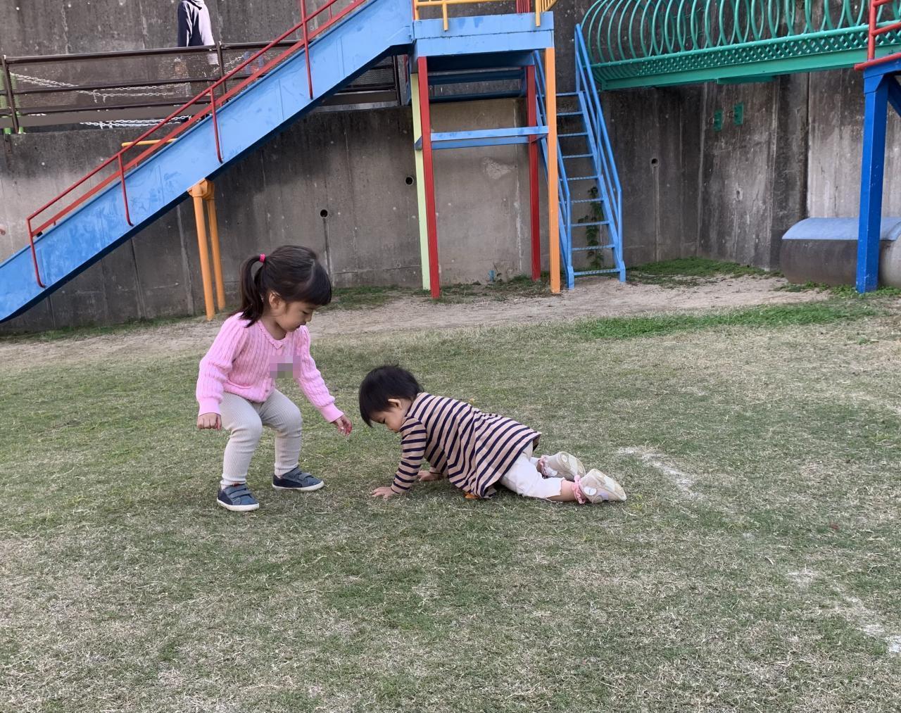 後半は、芝生の上に集まって「あぶくたった」「だるまさんがころんだ」で大勢でも一緒に遊びました。最後は追いかけっこになって、みんながキャ~っと駆けていっておしまい。