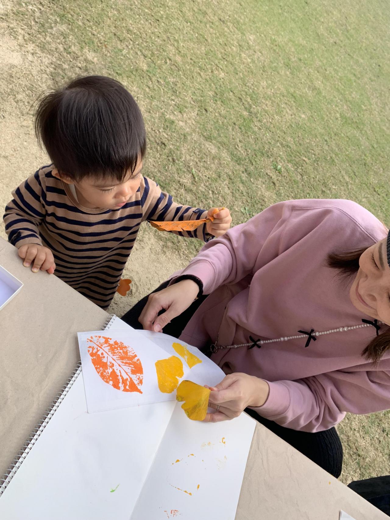 葉っぱの裏のザラザラした感触に触れてみたり・・・みんな違う模様の紙が完成しました。
