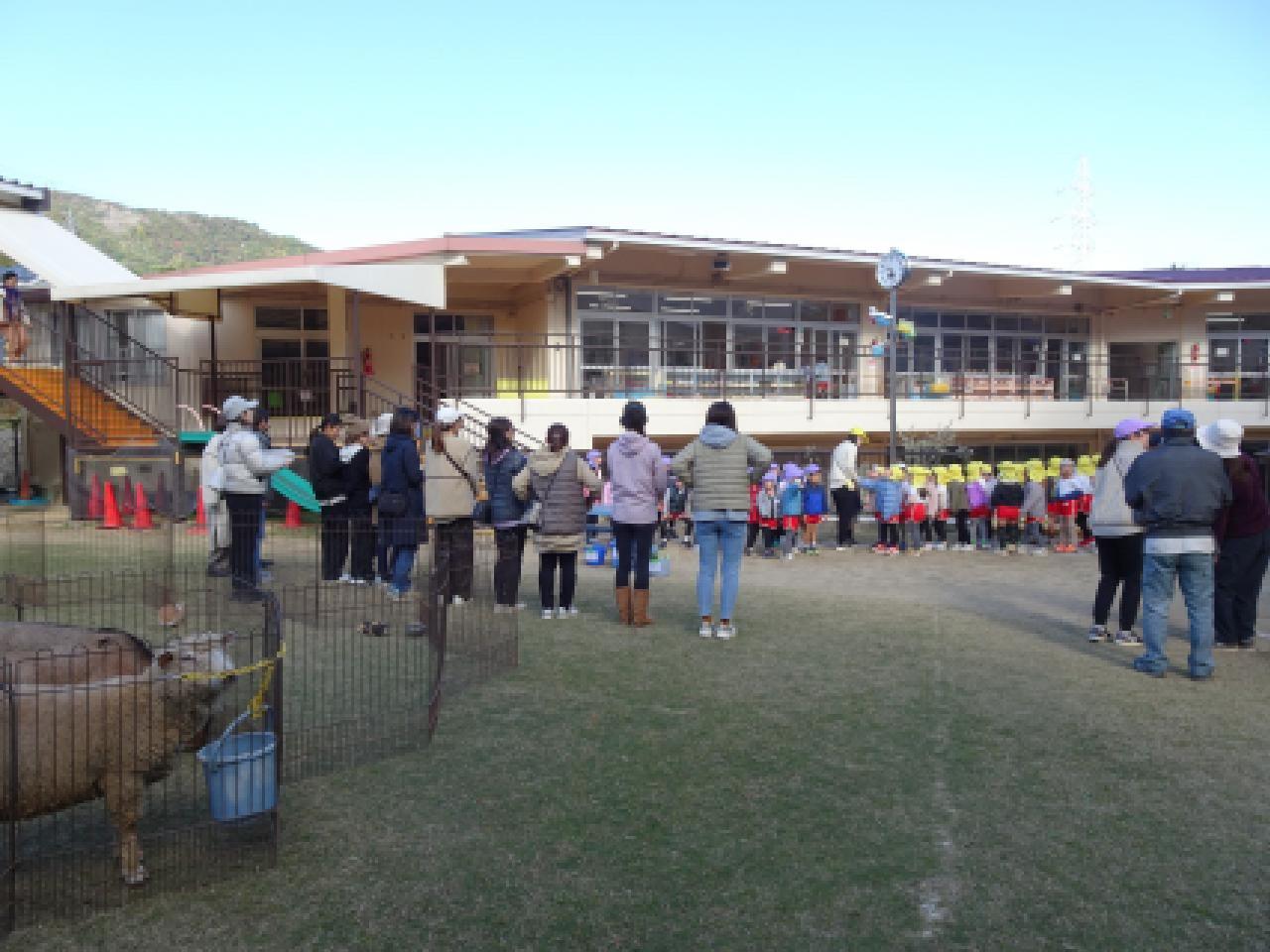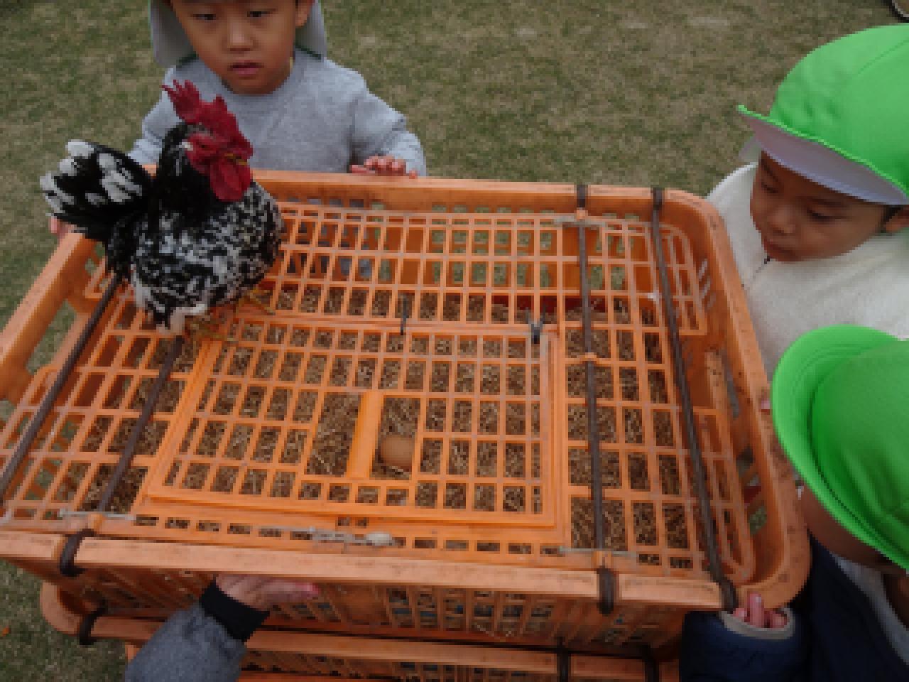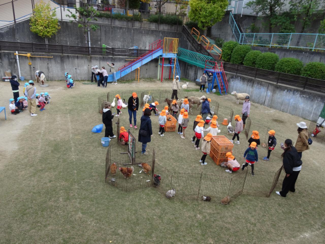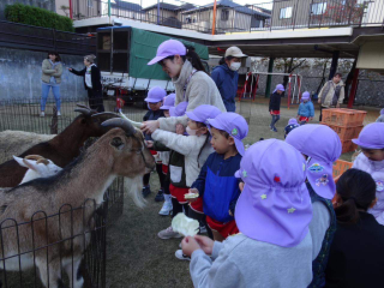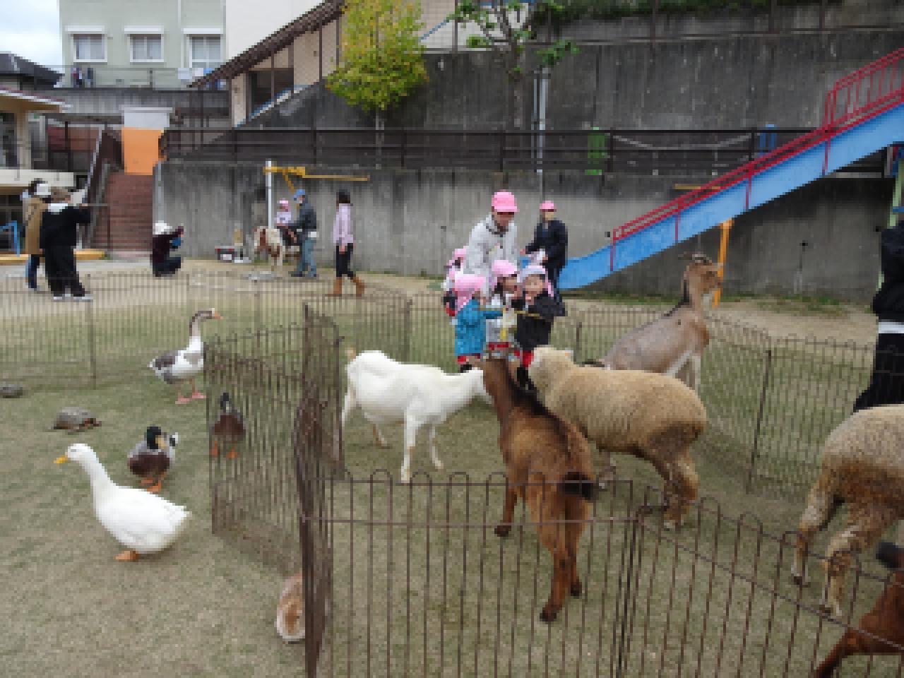 園庭は朝一番から動物さんの鳴き声で賑やか😀子どもたちが野菜や果物を持って登園してくれました。