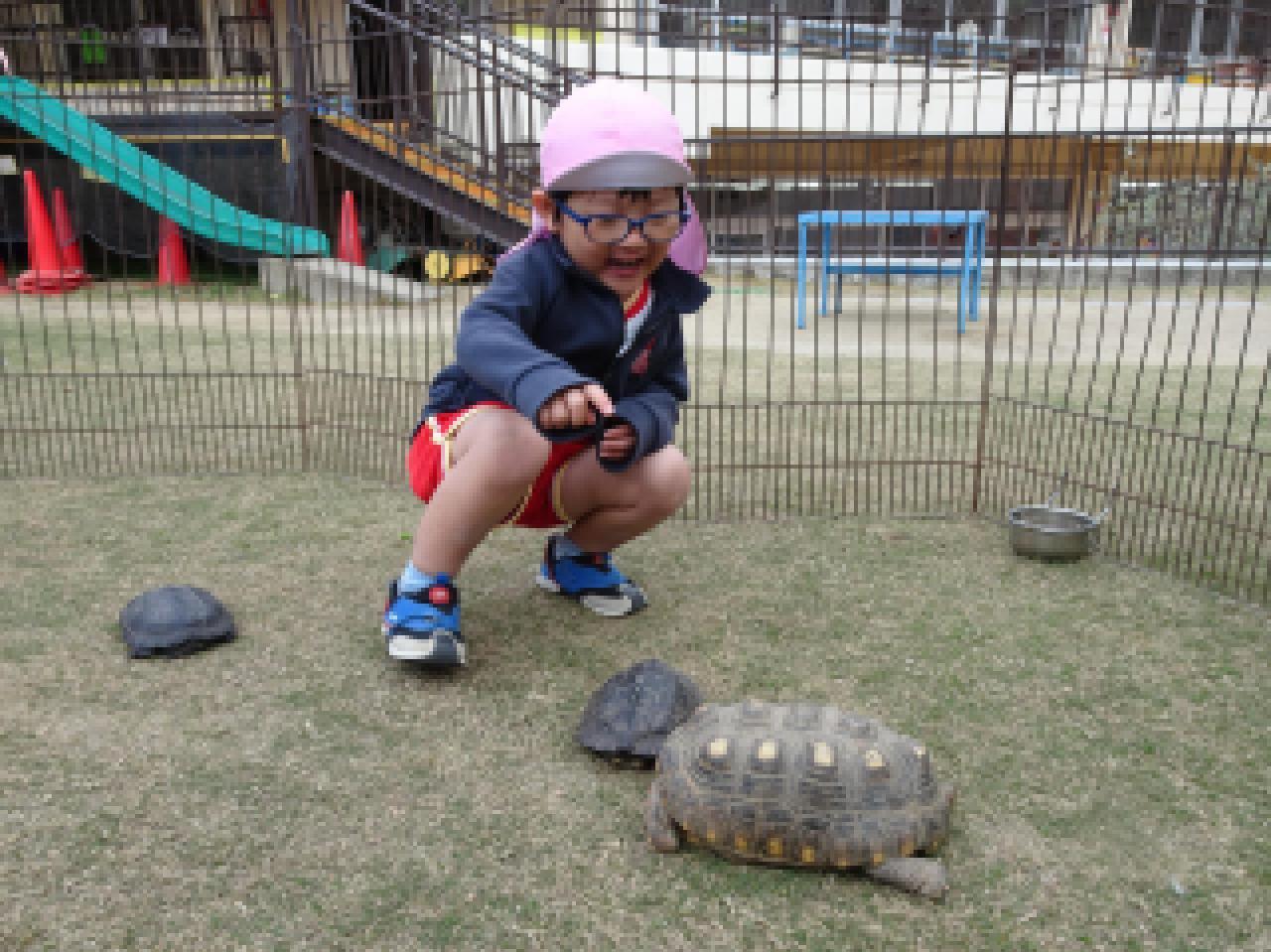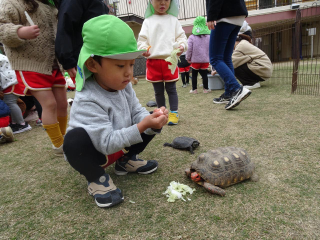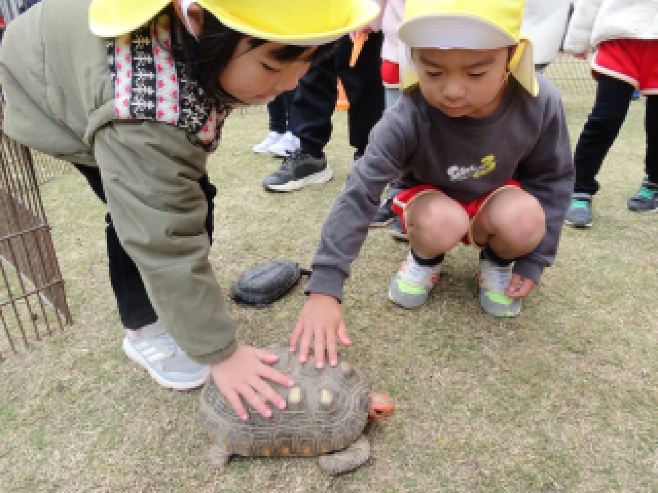 子どもたちよりも大きな動物、小さな動物、ふわふわの動物、硬い甲羅のカメ、逃げ足の速いウサギ、よく食べるヤギ・・・多くの出会いの中で、その違いに気づいて触れ合っていた子どもたち。