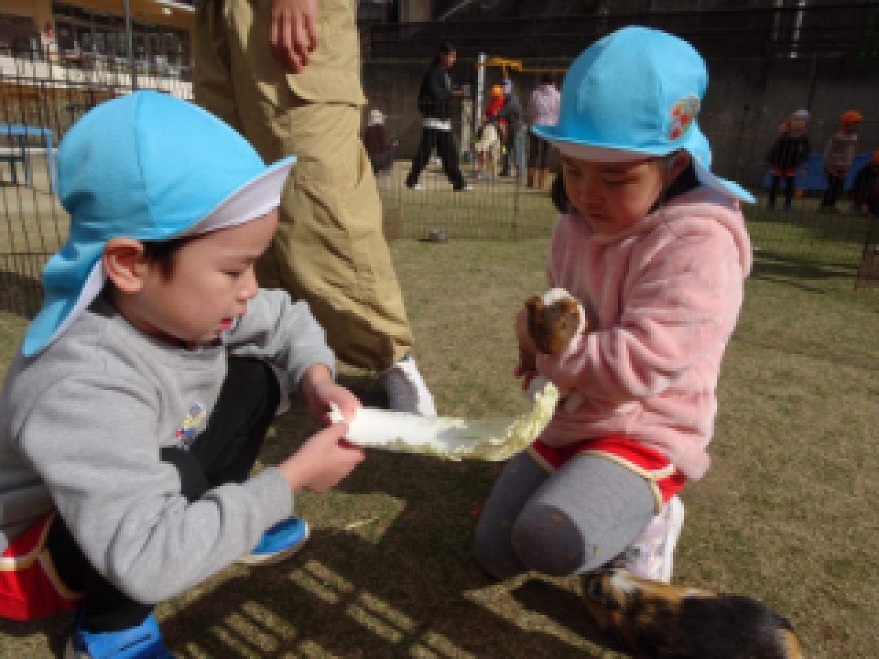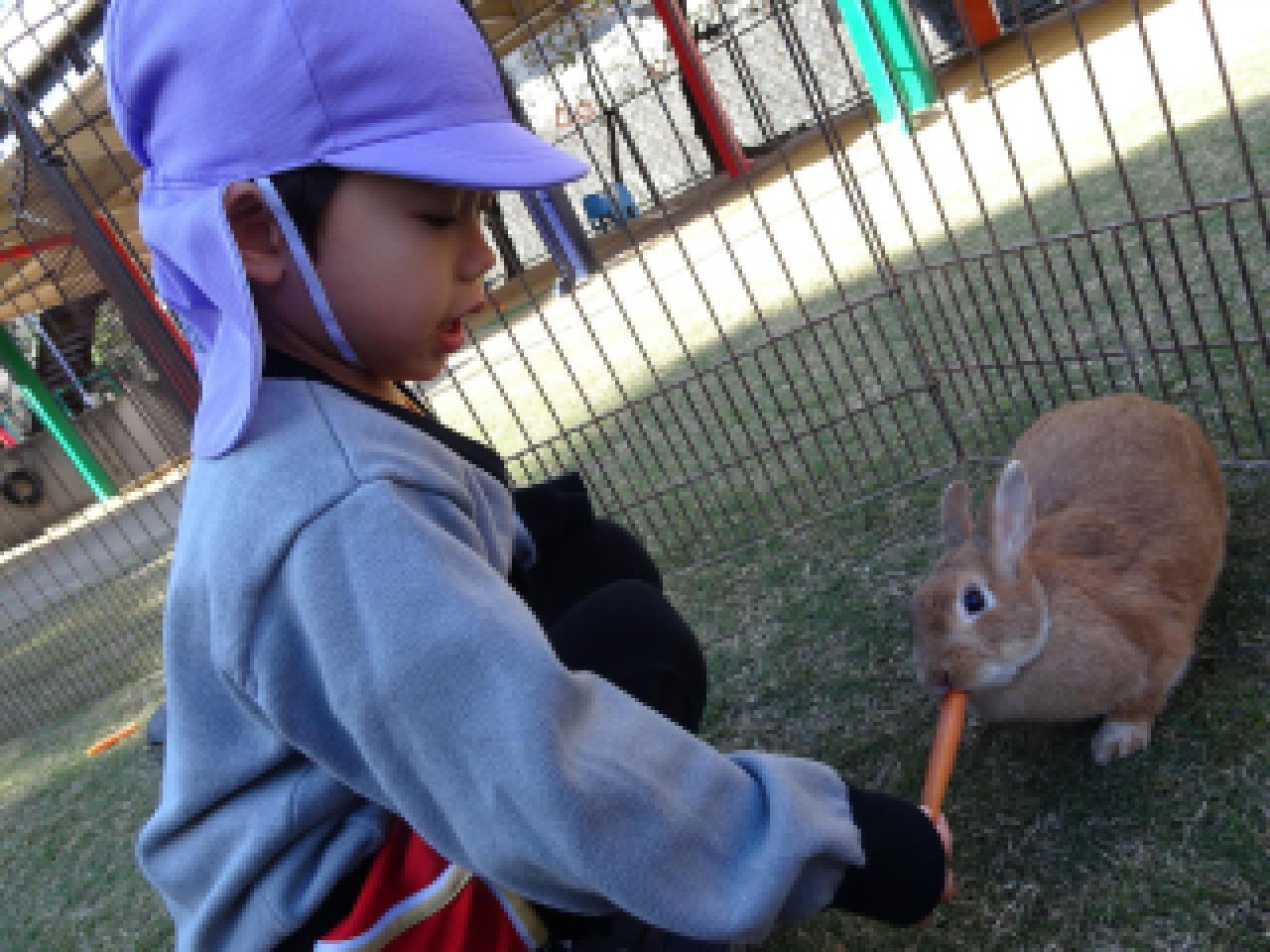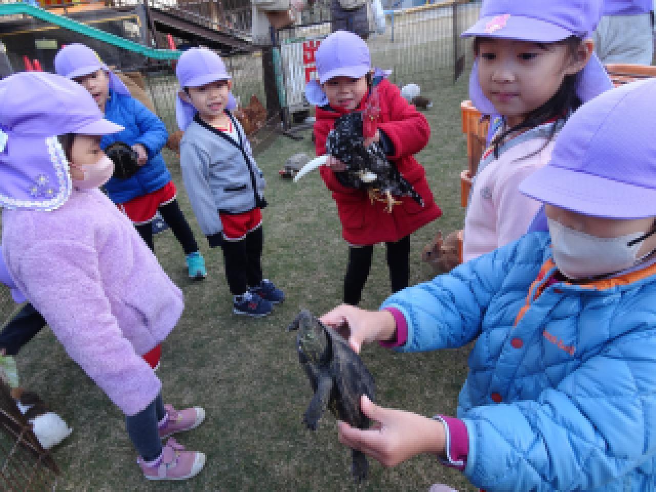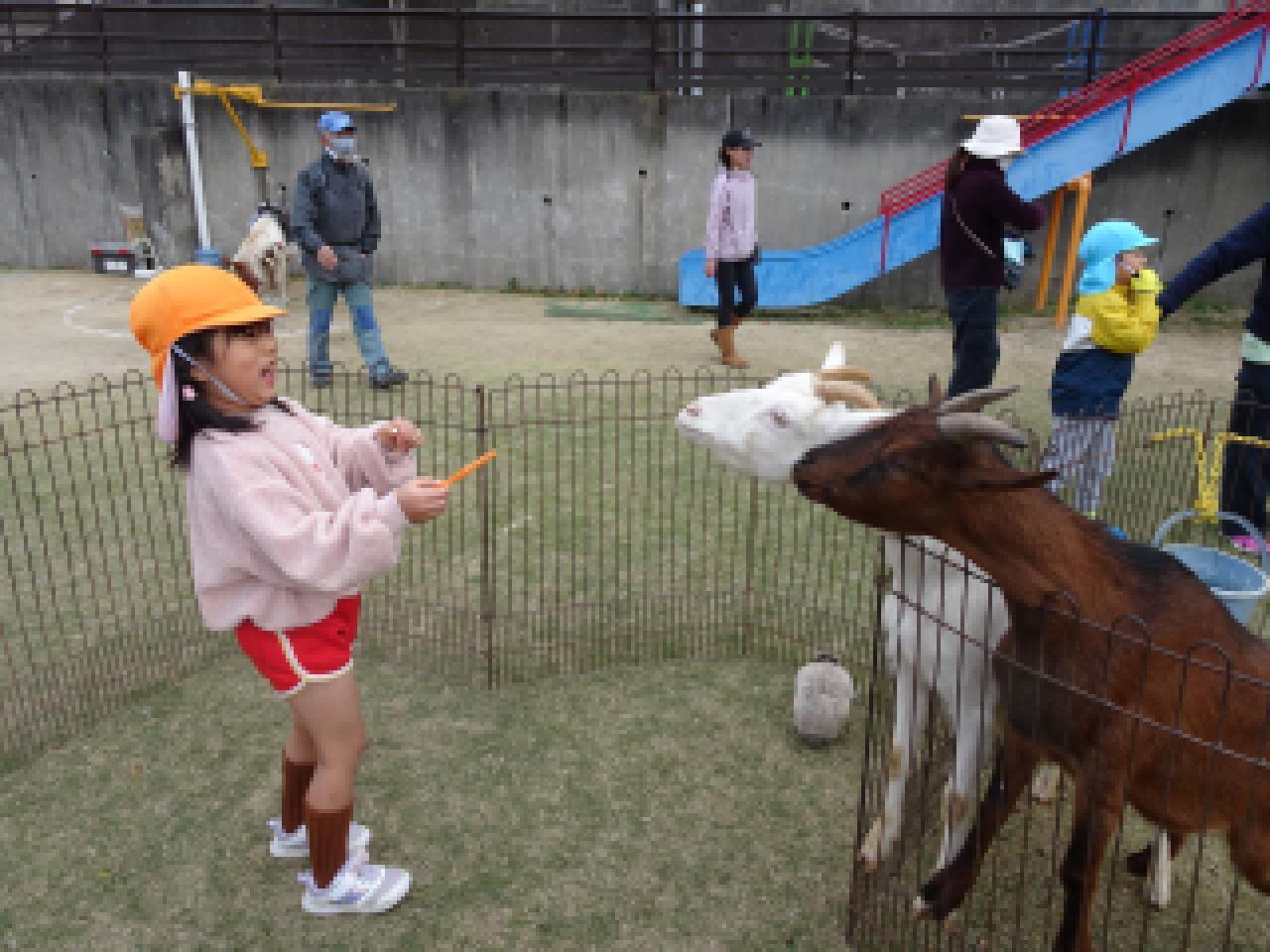 子どもたちよりも大きな動物、小さな動物、ふわふわの動物、硬い甲羅のカメ、逃げ足の速いウサギ、よく食べるヤギ・・・多くの出会いの中で、その違いに気づいて触れ合っていた子どもたち。