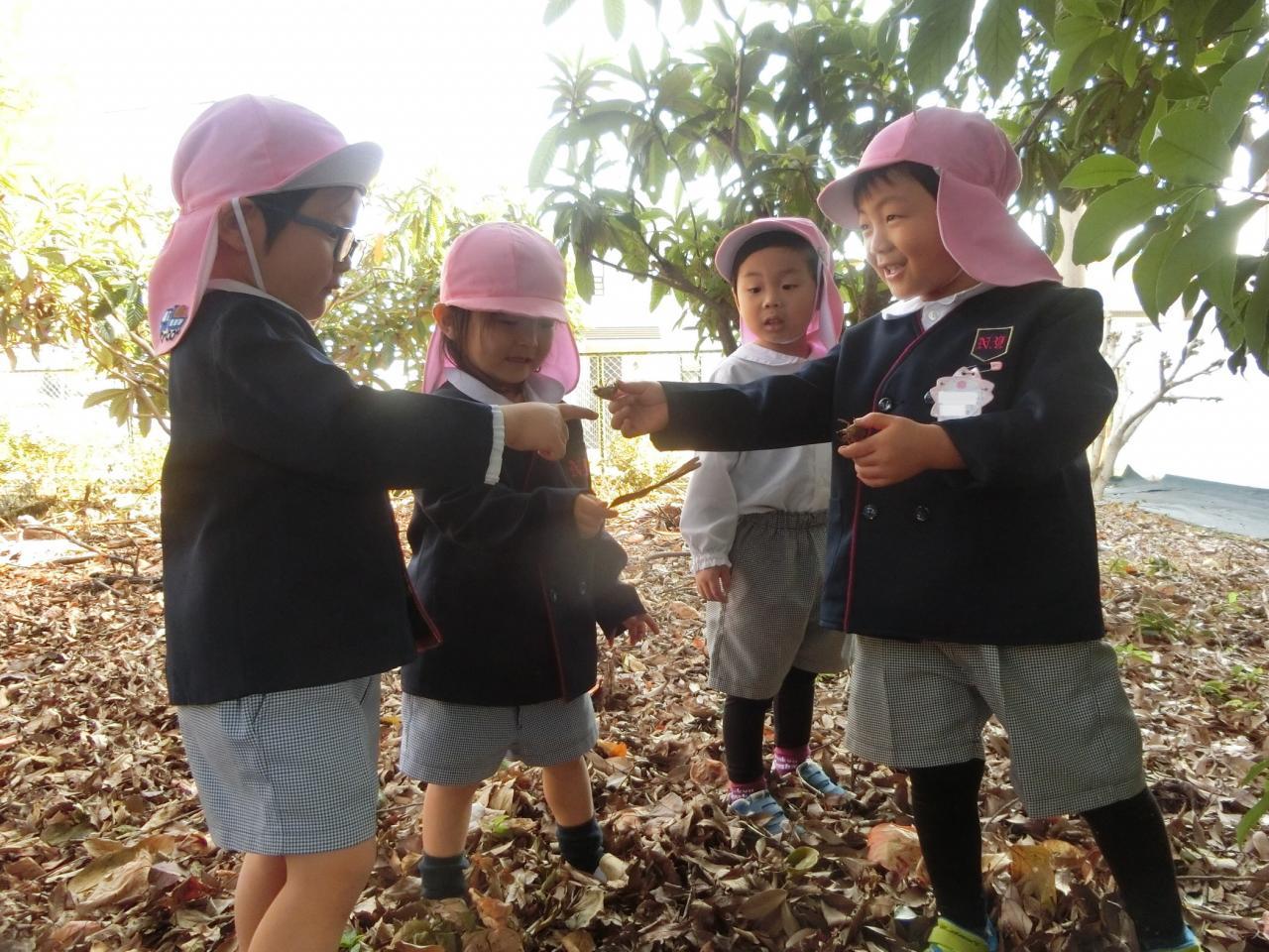 広い果樹園の中には、子どもたちが大好きな大きなどんぐりの木が!みかん狩りの後はどんぐりを拾ったり、落ち葉を拾ったり、自由に遊びました!