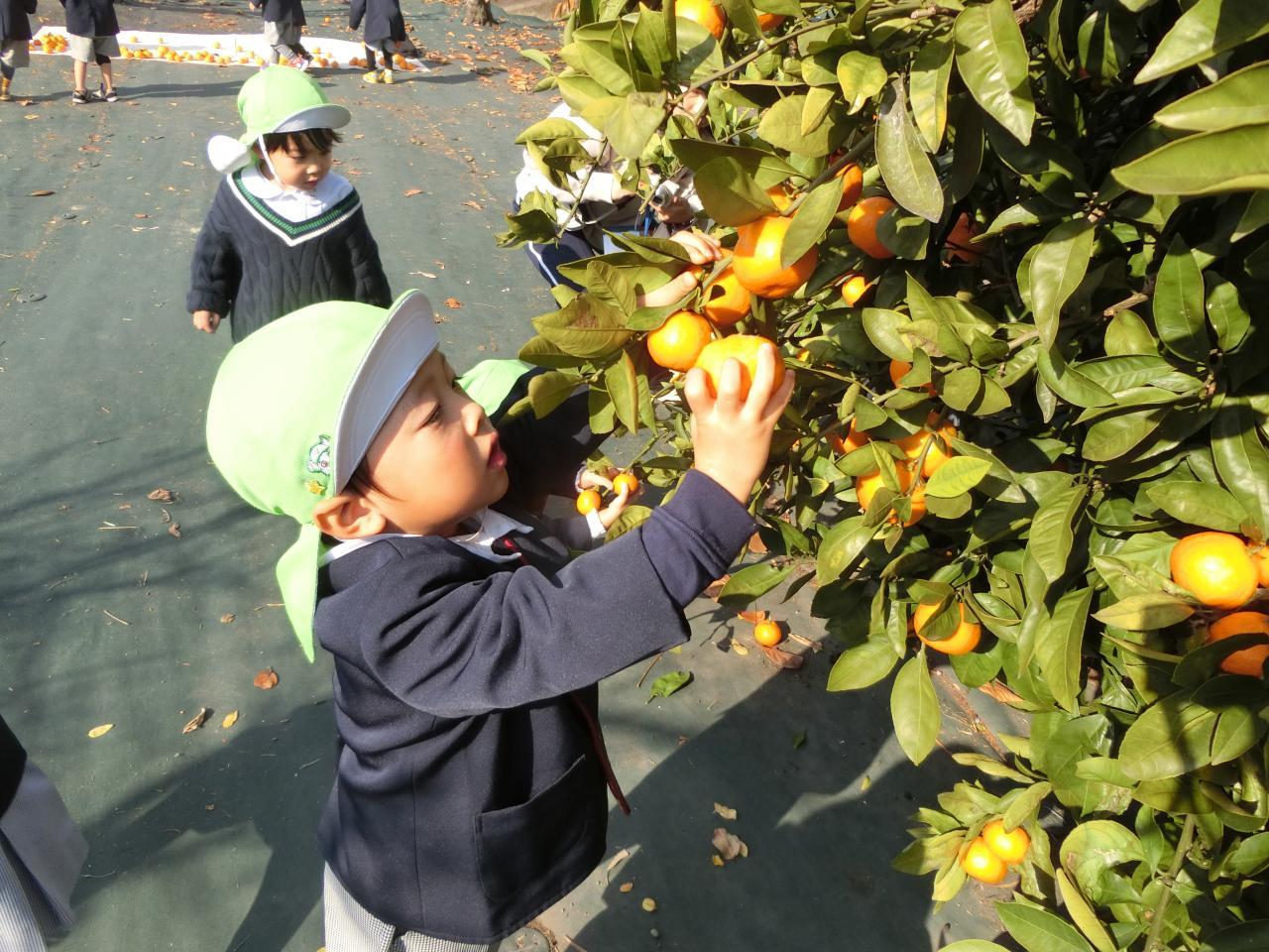 大きいみかんをとる子ども、小さいみかんをとる子ども、頑張って手を伸ばして高いところにあるみかんをとる子ども、奥に隠れているみかんを見つけてとる子ども……