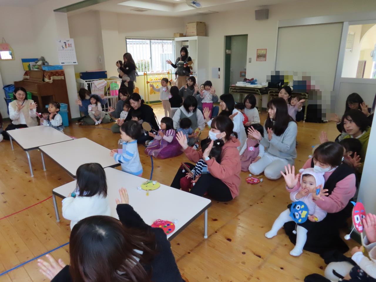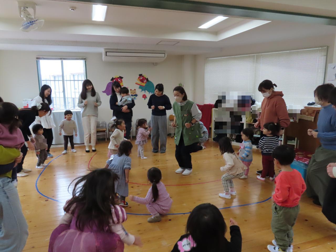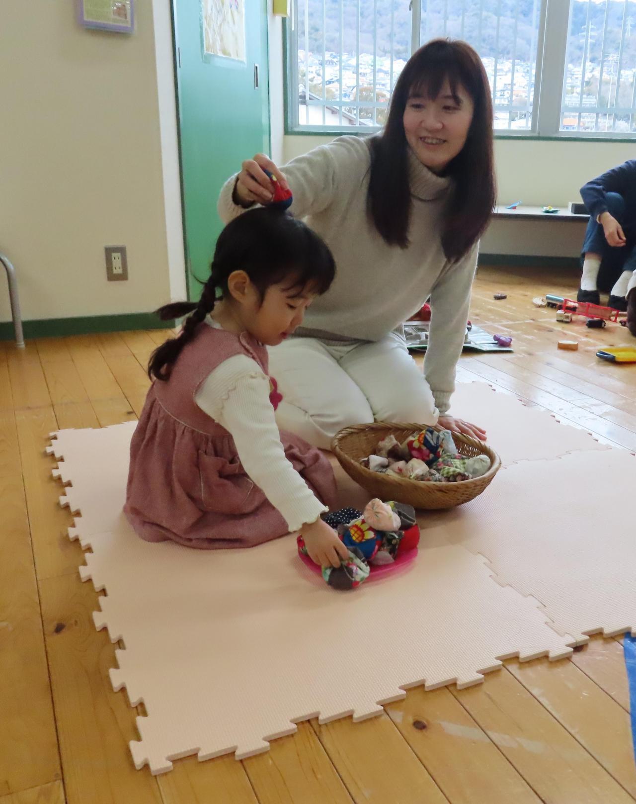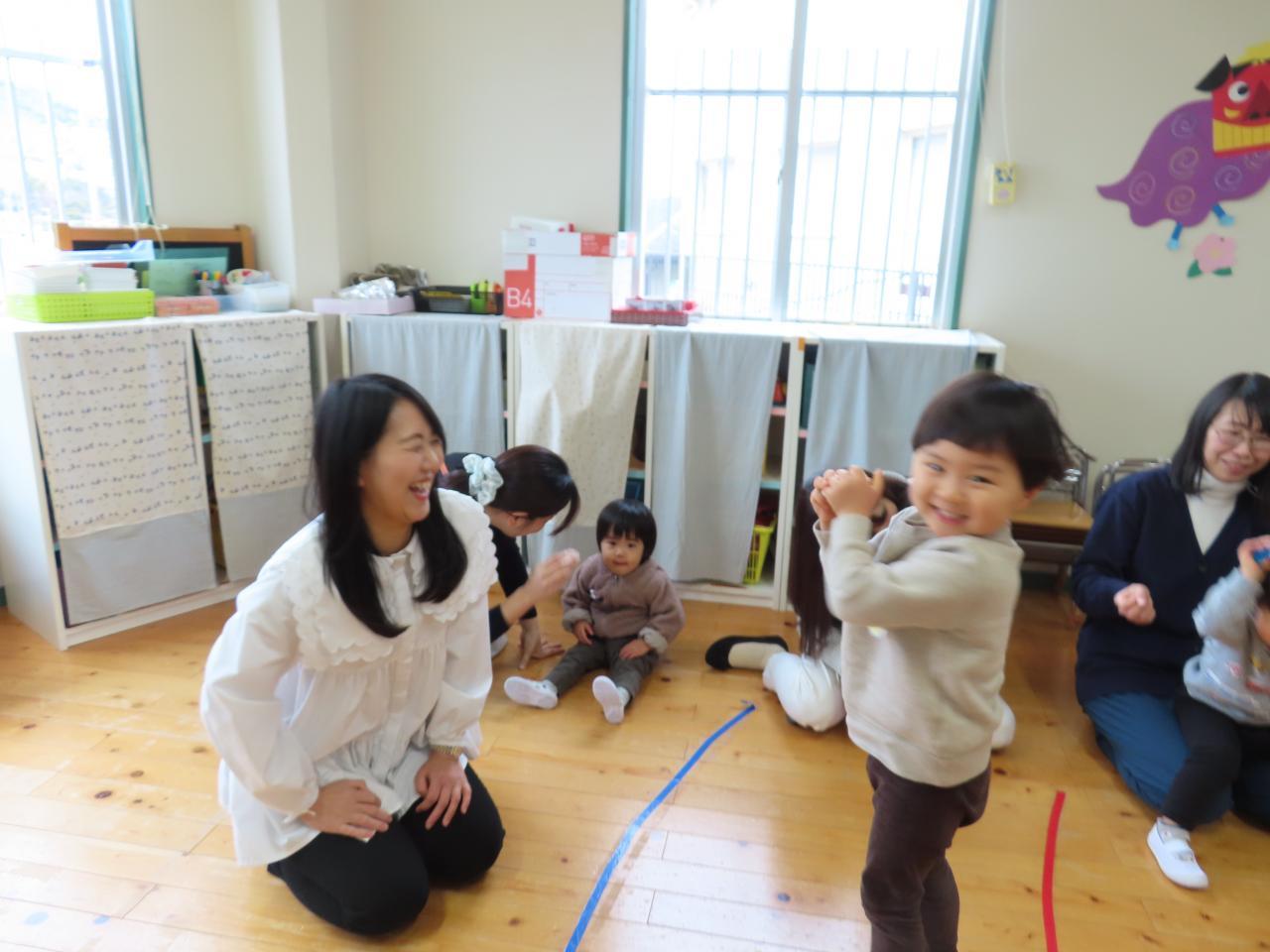「きゃきゃきゃ・・・キャッチ!」 親子でゲーム。「キャッチ」の合図ですばやくお手玉を先に取った人の勝ち! 合図を聞くことが勝利へのポイントです。