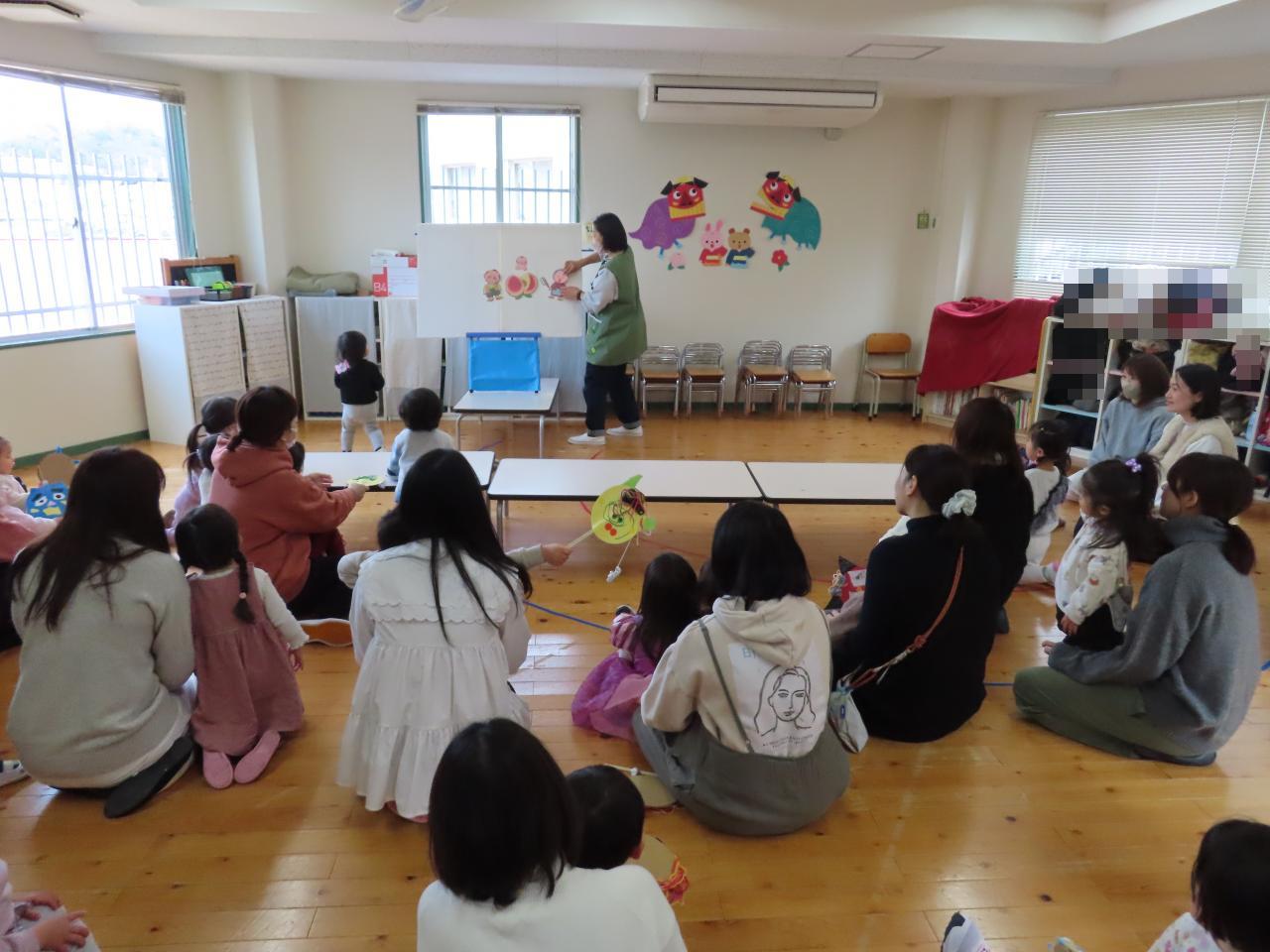 最後は、完成したでんでん太鼓と一緒に 怖いオニさんも登場のパネルシアター「ももたろう」をみました。