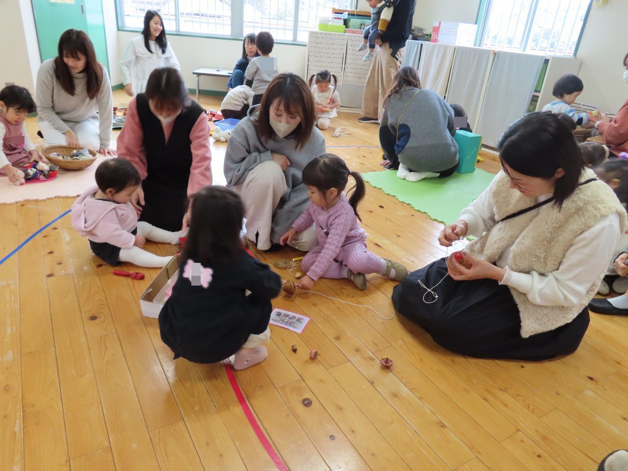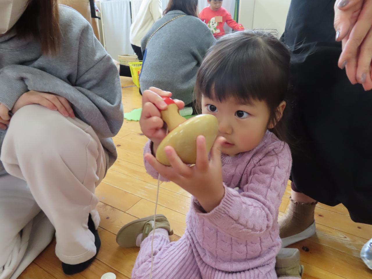 こま遊びコーナーでは、保護者の方も糸引きゴマに挑戦され、子どもたちも興味津々。