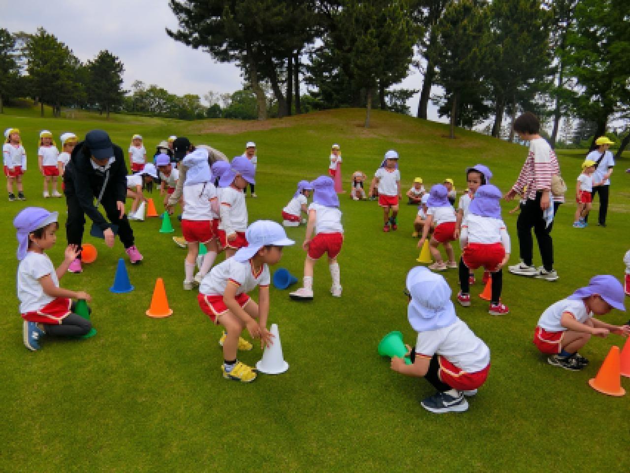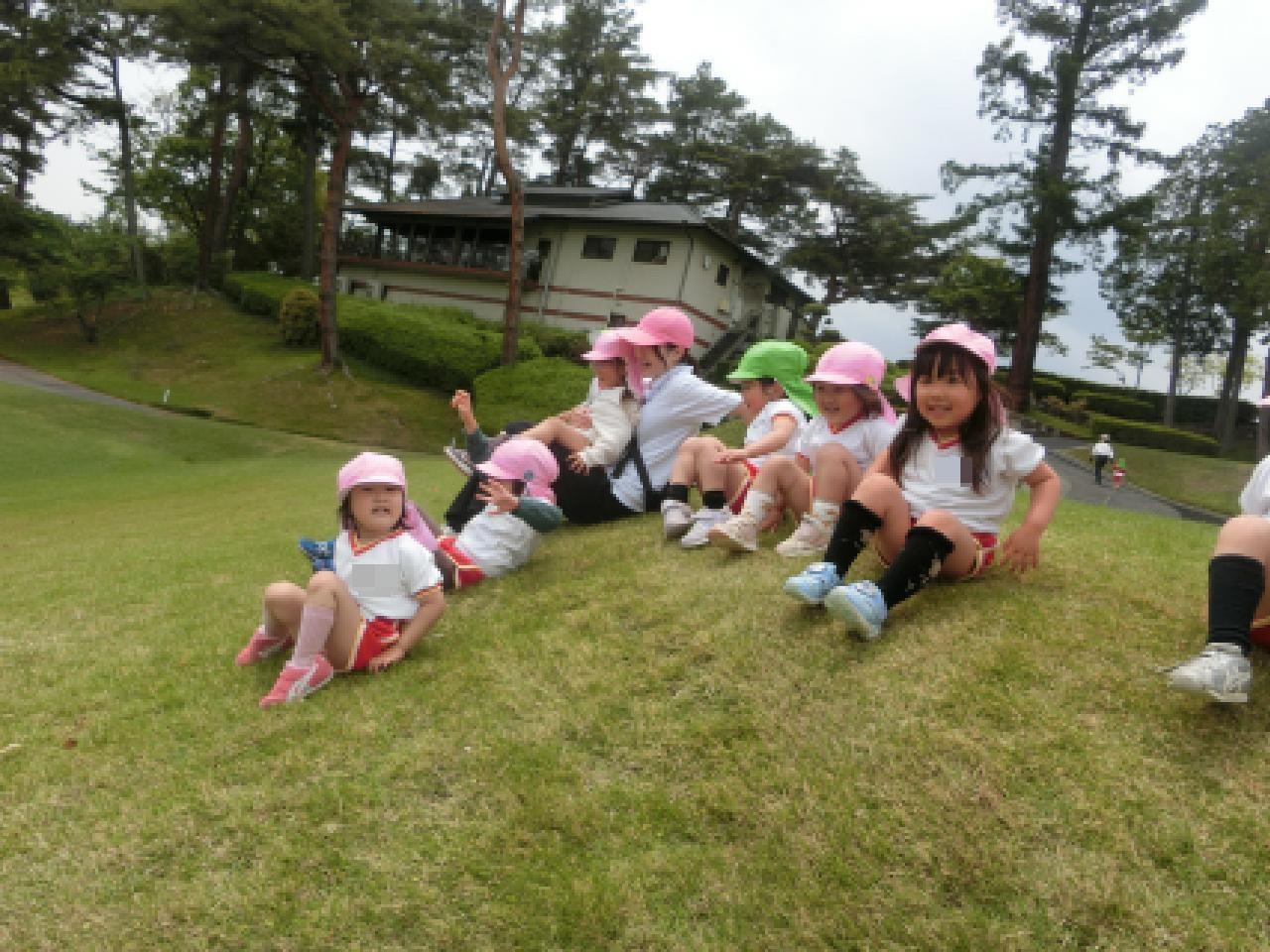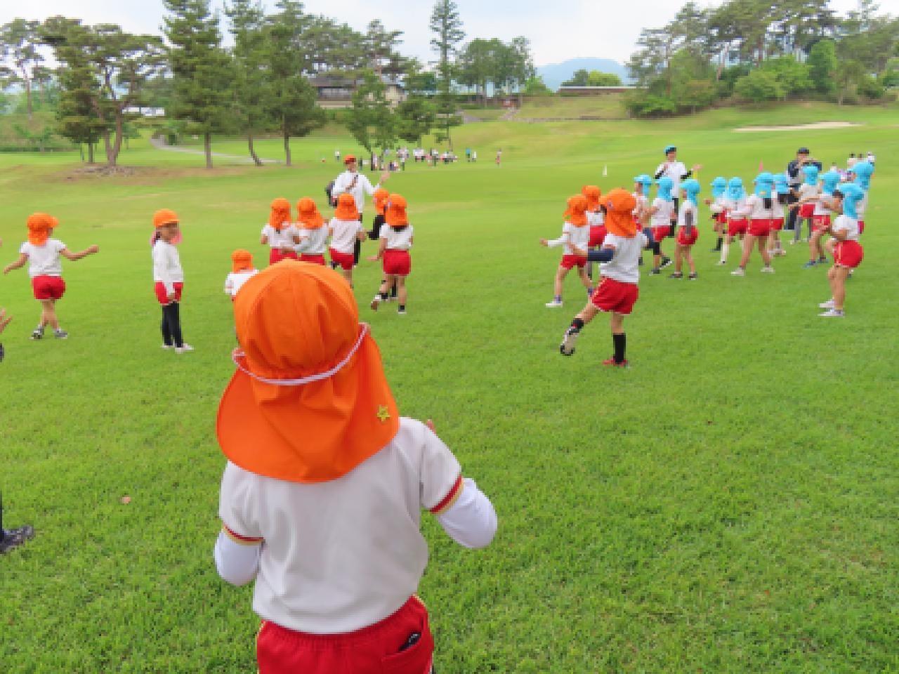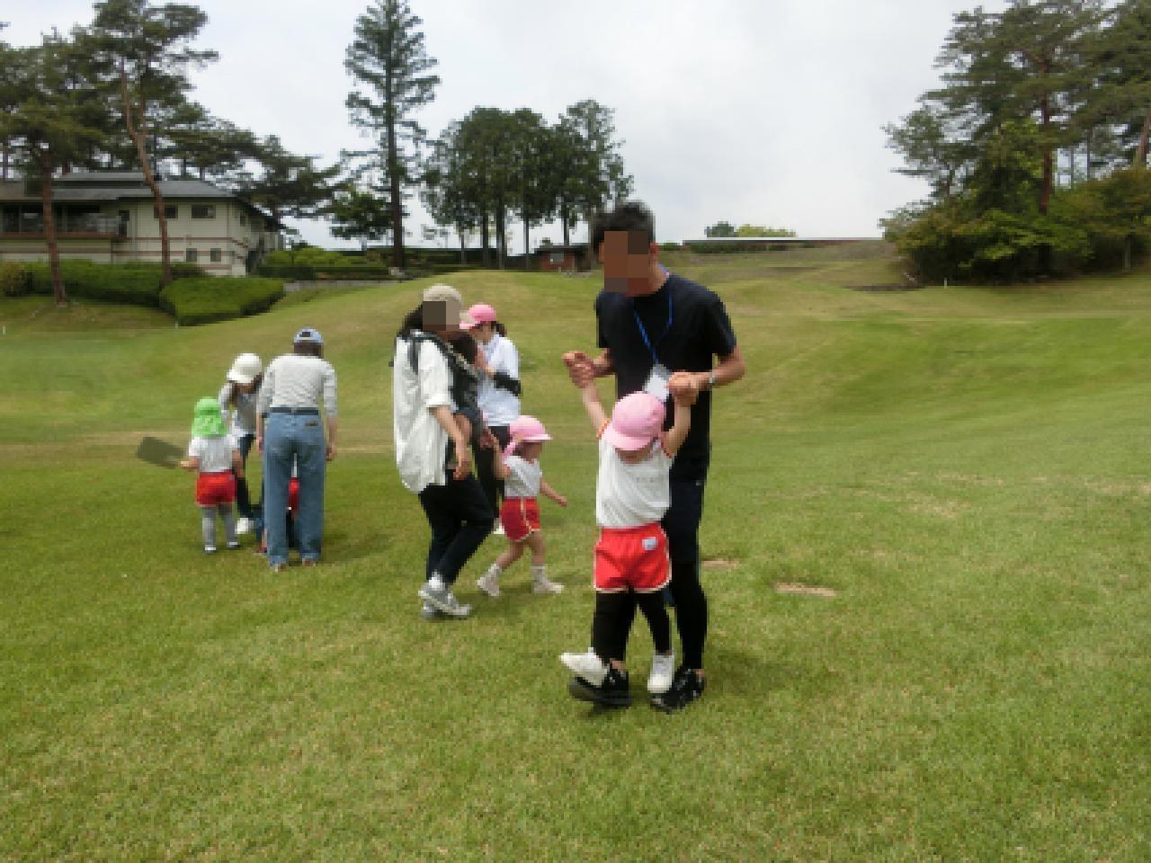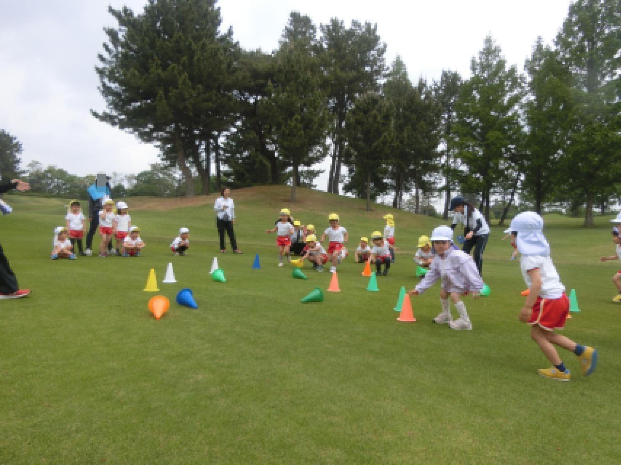 ゴルフ場のふかふかの芝生の上で、子どもたちは存分に身体を動かしてのびのびと遊びました。