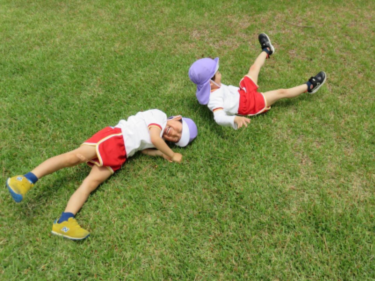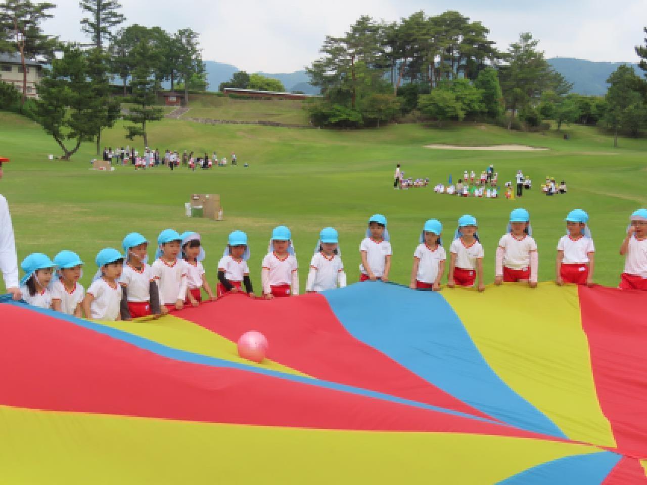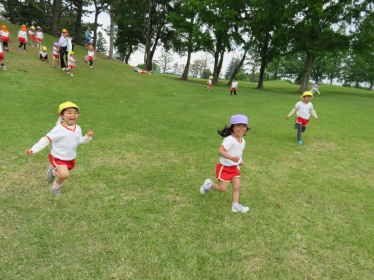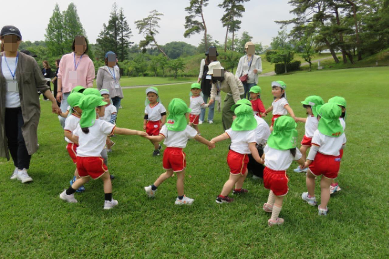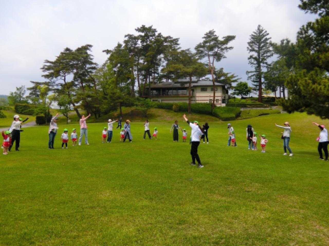 ゴルフ場のふかふかの芝生の上で、子どもたちは存分に身体を動かしてのびのびと遊びました。