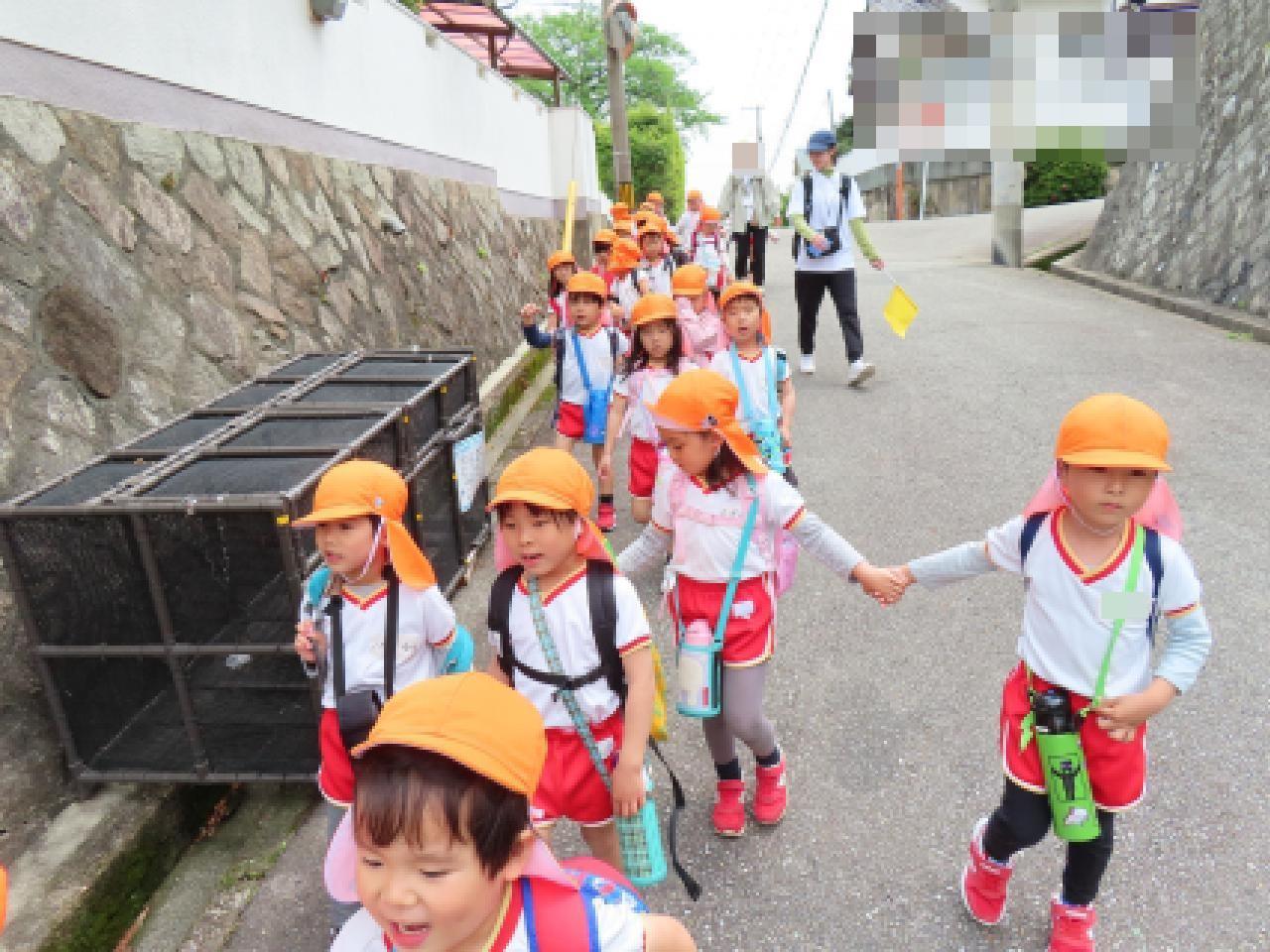 友だちと歩調を合わせながら”てくてく”歩いた年長さん、ゴルフ場までの道には、坂道や陸橋、横断歩道もありました。地域の方に出会ったときには「こんにちは」と自分から挨拶もできました。