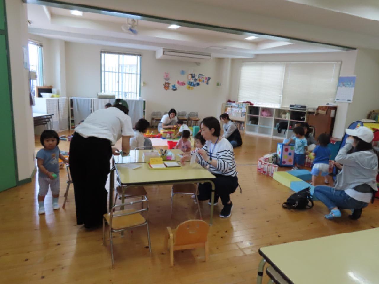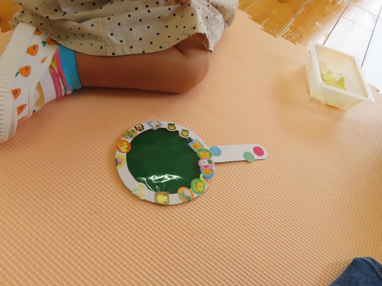 手遊びや、リズム体操、タオルシアターのあとに、簡単せいさく遊びをしました。