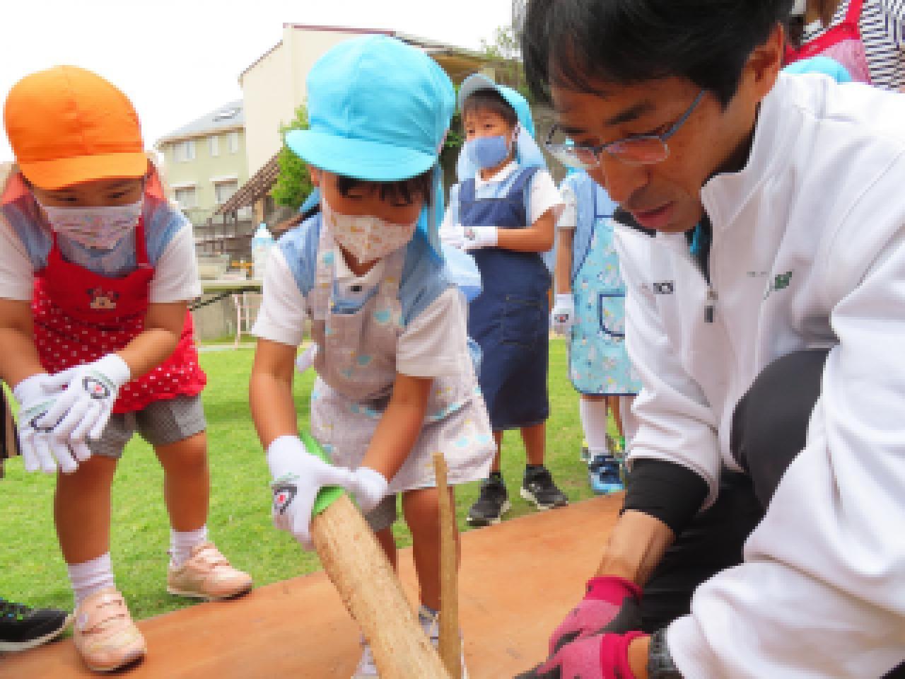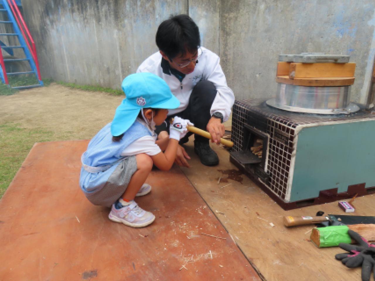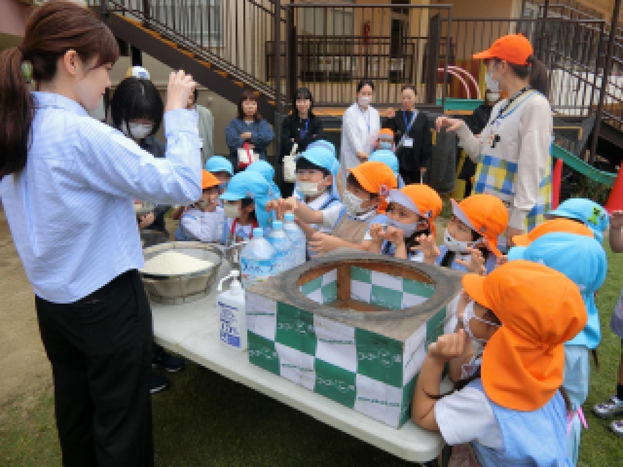 年長組の子どもたちのかまど炊飯体験・希望保護者の方の食育講義を組み合わせたおいしいごはんを食べよう県民運動『かまどごはん塾』を実施していただきました。