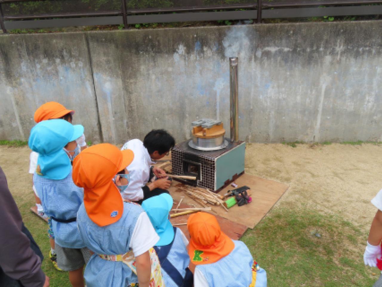 朝一番から”かまど隊”の方が、園庭にかまどを設営され、登園直後から「あれはなに?」と、期待が高まる子どもたち。みんなで準備を整え、初めてのかまど炊飯体験が始まりました!