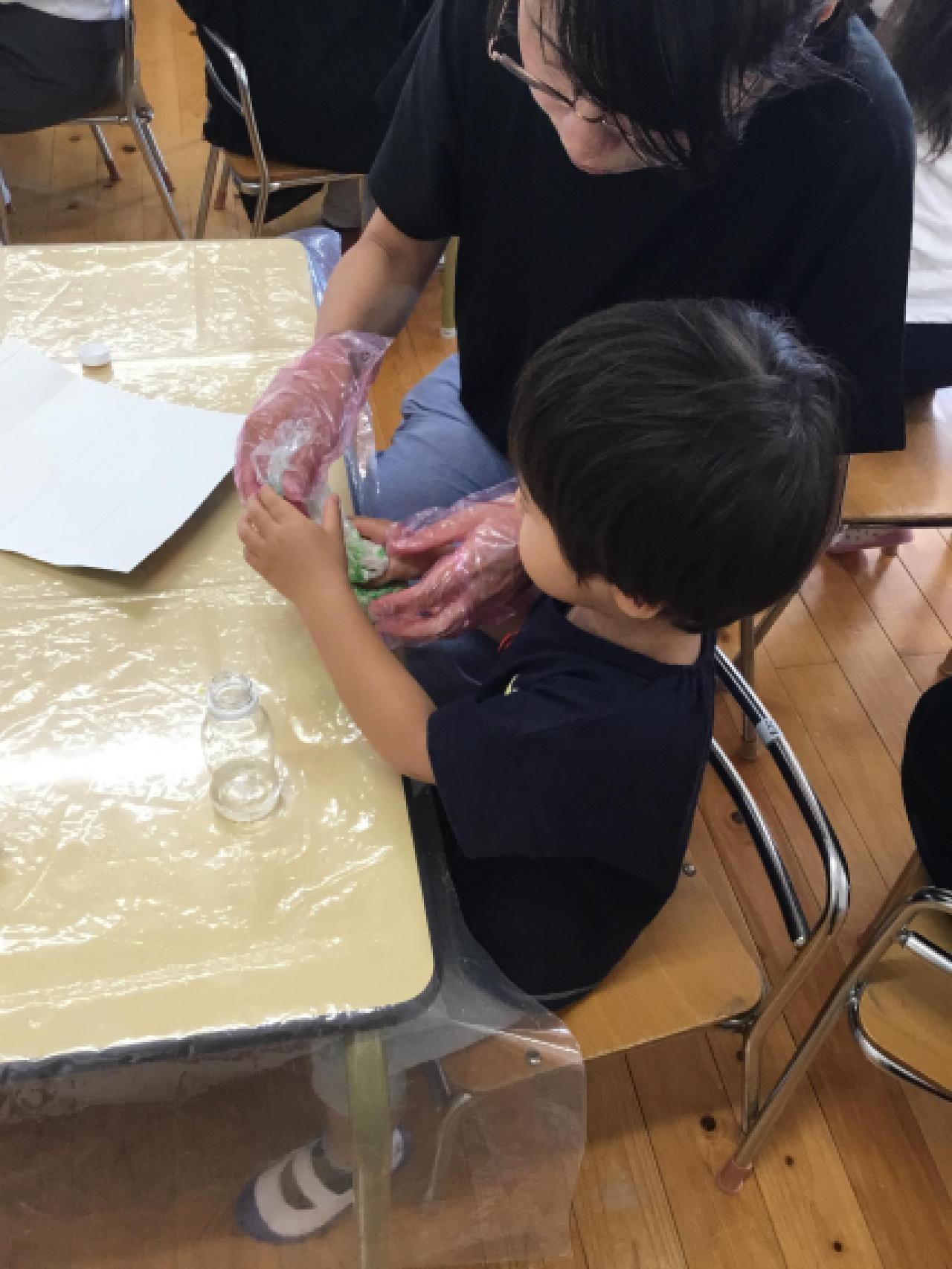 そして先生から違う色の粘土をもらって、混ぜたり重ねたりしているお友達もいました😆