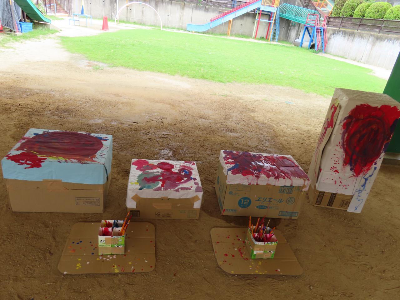 赤・青・黄色・白の絵の具で筆でぬりぬり。色が混ざる様子や絵の具が垂れていく様子も感じながらひたすら”ぬりぬり”。