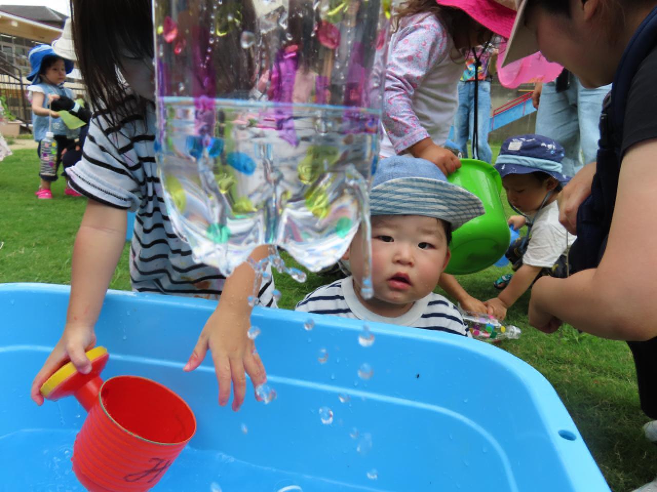 7月のキャンディクラブは、暑い日でしたが、お日さまも少し遠慮がちで外で水遊びもできました♪