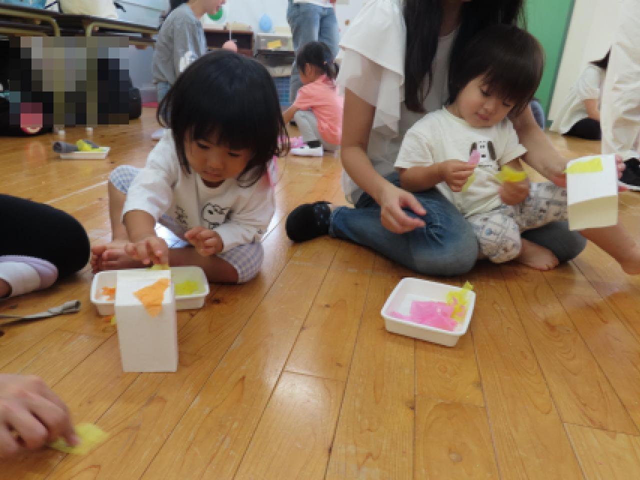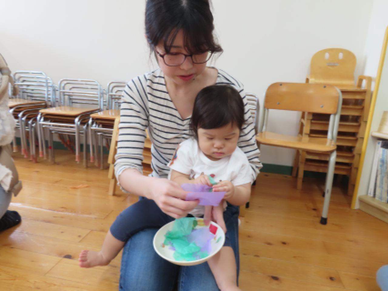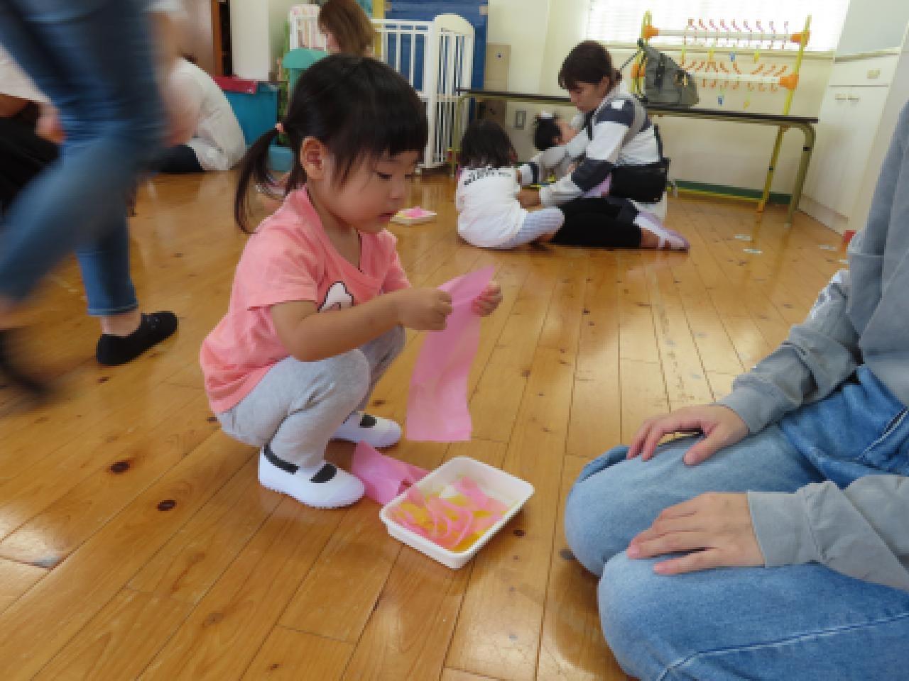②ちぎる・・・お花紙のふわふわの感触を味わいながらビリビリ。形の変化も楽しめますね。