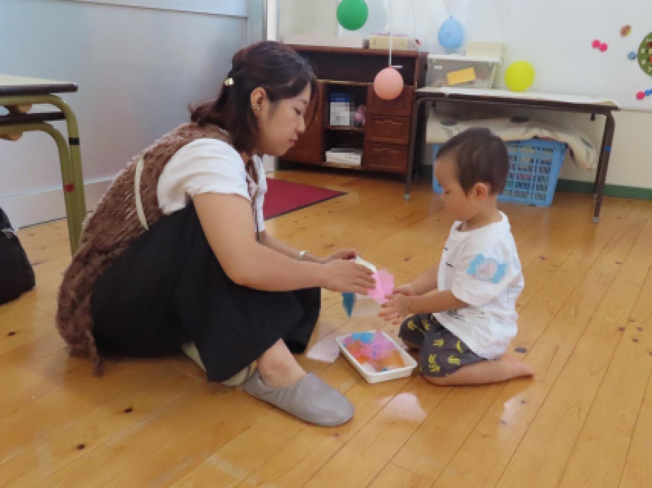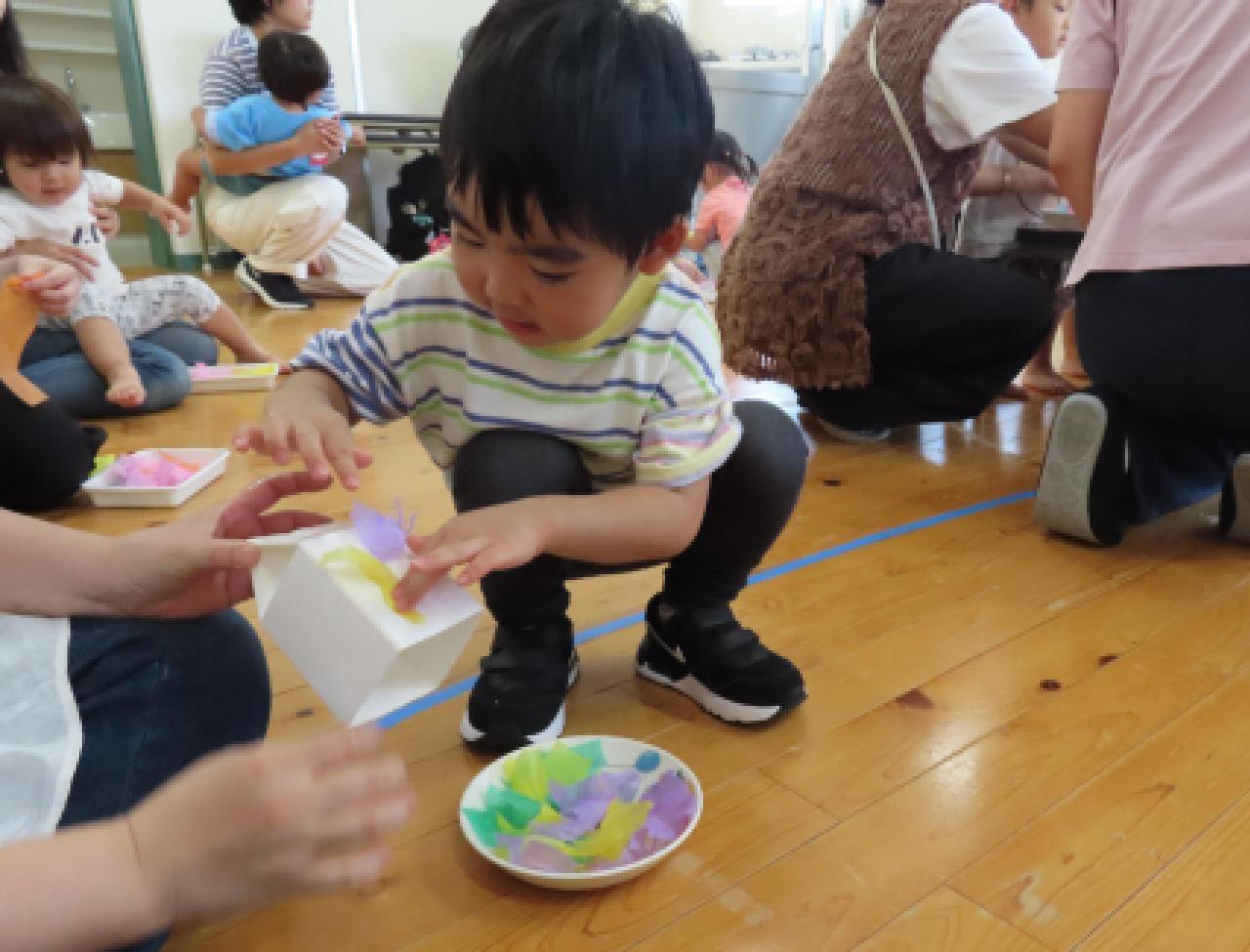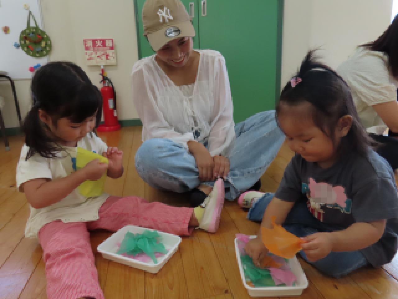 ②ちぎる・・・お花紙のふわふわの感触を味わいながらビリビリ。形の変化も楽しめますね。